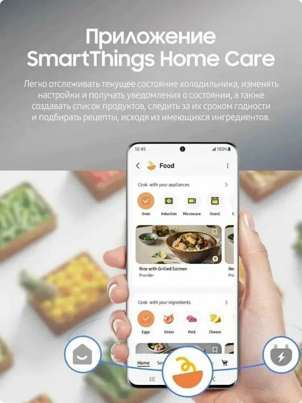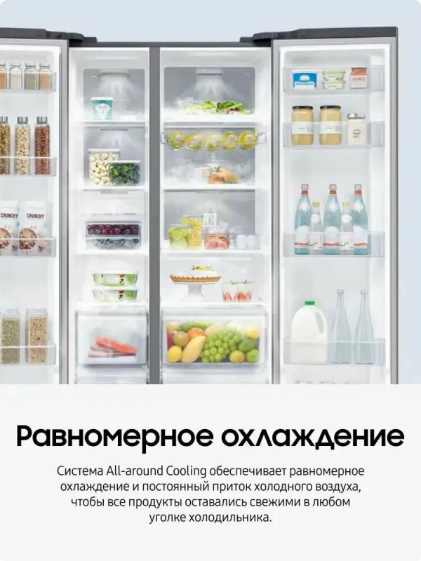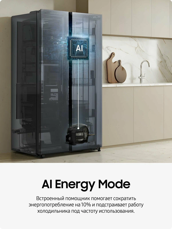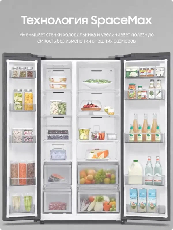 Двухкамерный холодильник Side-by-Side Samsung RS70F65Q1FWR — это многофункциональное и элегантное решение для вашего дома!Холодильник объемом 647 литров оснащен технологией SpaceMax, которая позволяет уменьшить стенки холодильника, при этом увеличивая внутренний размер и сохраняя прежние внешние габариты. Места для хранения продуктов стало еще больше и с двумя дополнительными ящиками, куда можно положить свежие овощи, фрукты и ягоды, позволяя эффективно организовать пространство на полках.Режим AI Energy в приложении SmartThings Energy помогает контролировать расход за электроэнергию, снижая электропотребление на 10%. Внутренний помощник оповестит, если показатели превысят предыдущий месяц, и подстроит работу холодильника под частоту использования и окружающую среду. Инверторный компрессор AI обеспечивает бытовой технике тихую, энергоэффективную и долговечную работу. С его помощью степень охлаждения определяется автоматически в зависимости от загрузки холодильной и морозильной камер.Многопоточная система охлаждения All-Around Cooling равномерно распределяет холодный воздух через вентиляционные отверстия внутри холодильника, поддерживая оптимальную температуру и сохраняя продукты свежими. Функция Power Cool помогает быстрее охладить еду и напитки, а Power Freeze предназначена для быстрого изготовления льда и глубокой заморозки.Холодильник Самсунг можно подключить к приложениям SmartThings Home Care и SmartThings Food с помощью Wi-Fi. С приложением SmartThings Home Care проще отслеживать состояние холодильника: система сама сообщит, если необходимо заменить детали, или предложит решение выявленных проблем. Умный помощник в SmartThings Food помогает составить список продуктов, которые хранятся в холодильнике, следить за их сроками и предлагает разнообразные рецепты, опираясь на ваши предпочтения и имеющиеся ингредиенты.С двухкамерным холодильником Samsung вы получите не только яркий акцент на кухне, но и функционального помощника!