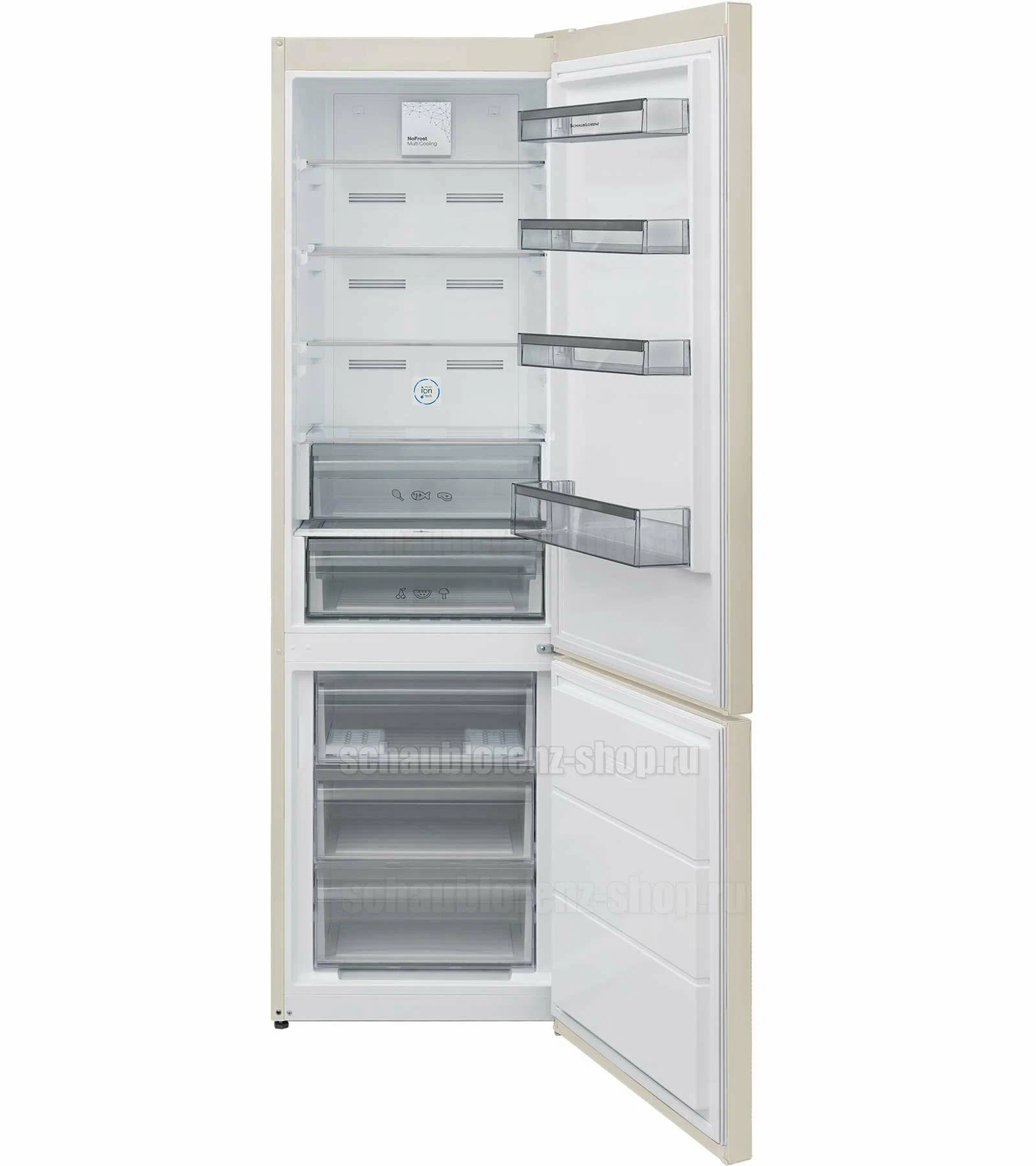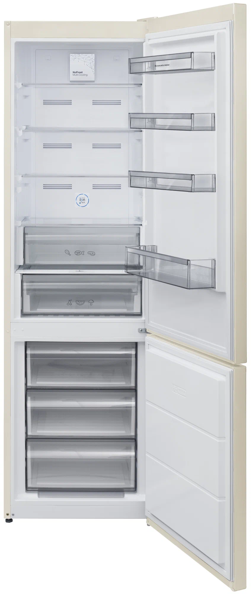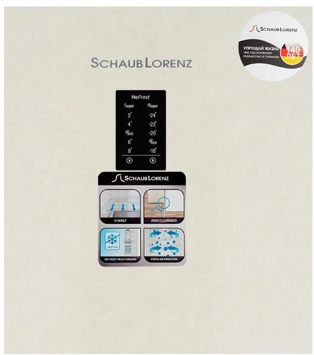 Бежево-мраморный холодильник Schaub Lorenz SLU S379X4E относится к SN климатическому классу, что позволяет размещать холодильник в плохо отапливаемых помещениях с температурой воздуха от 10 до 43˚С. Электронный тип управления модели позволит легко установить необходимую температуру, цифровой дисплей расположен на двери снаружи. Компрессор работает с низким уровнем шума 42 дБ. Внутреннее наполнение холодильной камеры состоит из четырех сверхпрочных стеклянных полок, двух ящиков для овощей и фруктов, четырех полочек на дверце холодильника. Морозильная камера заполнена тремя вместительными прозрачными ящиками, что позволит моментально отыскать нужный продукт. В комплект холодильника входит форма для яиц, лоток для льда. Холодильник SLU S379X4E Schaub Lorenz относится к классу энергоэффективности А++, говорящем о самом низком энергопотреблении. Скорость заморозки продуктов при этом 8кг/24 часа. Преимуществом модели является функция перенавешивания дверей, что позволит самостоятельно сделать так, чтобы двери холодильника открывались в желаемую сторону для пользователя.Schaub Lorenz SLU S379X4E также оснащен новинками, которые облегчают использование холодильника и делают его работу еще более эффективной: Складная полка Экономит место и подходит для хранения бутылок, кастрюль с супом и других габаритных емкостей. Система разморозки Nо Frost Multi CoolingЗа счет принудительной конвекции система эффективно препятствует образованию наледи на внутренних стенках. Данная система защищает от высыхания и в ней полностью отсутствует передача запахов между холодильником и морозильной камерой. Система открывания двериZero Clearance - система открывания двери, которая не увеличивает ширину холодильника при открытии дверцы и позволяет поставить его вплотную к стене.ИонизацияION tech - система ионизации, продлевающая срок хранения продуктов.