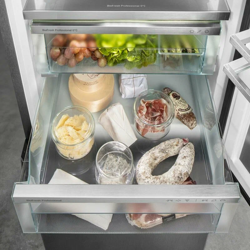 Хрустящий салат или клубника: самые нежные продукты заслуживают особого места, чтобы дольше оставаться свежими: контейнеры BioFresh. В контейнере для овощей и фруктов «Fruit & Vegetable-Safe» температура близка к 0 °C. В сочетании с постоянно преобладающей в нём влажностью, благодаря плотному закрытию, неупакованные фрукты и овощи чувствуют себя здесь особенно хорошо. Вам не нужно ничего настраивать.Хотите, чтобы нежное филе телятины или свежее молоко оставалось свежими как можно дольше? Контейнеры BioFresh помогут вам: температура в контейнере «DrySafe» близка к 0 °C – идеальные условия для хранения даже самых чувствительных продуктов. И самое лучшее: все идеально настроено на заводе для немедленного использования – для сохранения свежести как можно дольше.Открывая морозильное отделение, вы хотите видеть замороженные продукты, а никак не лёд или иней. NoFrost защищает морозильную камеру от нежелательного обледенения, расходующего много энергии и порой стоящего достаточно дорого. NoFrost означает: никакого больше утомительного и продолжительного размораживания морозильного отделения, больше времени для других дел – и экономия денег.Вы любите сдержанную, холодную элегантность на кухне? Тогда ваш выбор – это Liebherr с поверхностью SteelFinish. Материал Colaminat с вертикальным крацеванием очень похож на настоящую нержавеющую сталь, прочный и легко моется. Лакированные боковые стенки серебристого цвета идеально дополняют элегантный вид.Реальность прикосновения: сенсорный экран позволяет легко и интуитивно управлять вашим устройством Liebherr. Все функции наглядно расположены на экране. Легким касанием пальца вы можете легко выбрать функции или проверить текущую температуру холодильника.Благодаря запасу кубиков льда весом 8 кг IceTower гарантирует, что на вашей вечеринке охлаждённые напитки никогда не закончатся. Совок для кубиков льда и выдвижная полка на телескопических направляющих обеспечивают удобный доступ к кубикам льда. Благодаря дополнительному лотку также можно хранить меньшее количество льда и хранить под ним замороженные продукты. В соседнем выдвижном ящике есть место для хранения замороженных продуктов.