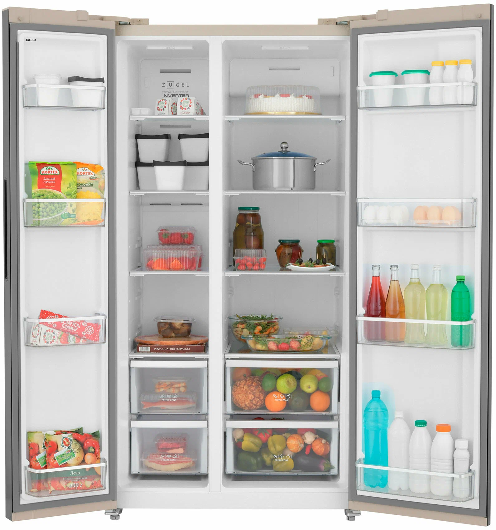 Двухдверный холодильник-морозильник ZUGEL ZRSS630С серии Side-by-Side предназначен для охлаждения, хранения и замораживания большого объема продуктов. Эта современная вместительная модель оснащена передовой технологией Full No Frost и инверторным компрессором. Грамотно организованное внутреннее пространство позволяет удобно и комфортно использовать прибор. Холодильник имеет стильный дизайн и прочный фасад из закаленного стекла в шикарном цвете шампань.Система размораживания Full No Frost - это наиболее эффективная система охлаждения и автоматической разморозки морозильной и холодильной камер. Обеспечивает принудительную циркуляцию холодного воздуха по всему объему холодильника, препятствует образованию наледи на стенках.Режим Отпуск - специальный температурный режим с экономным энергопотреблением на время отъездаИнверторный компрессор обеспечивает экономное потребление электроэнергии и низкий уровень шума при работеЭлектронное управление - контроль температуры отдельно в холодильной и морозильной камерахСенсорный LED-дисплей с расширенной индикациейПараллельное боковое расположение холодильной и морозильных камер, распашные двери предоставляют удобный доступ ко всем полкам и выдвижным ящикамВнутренняя LED-подсветка - мягкое равномерное освещение внутреннего пространстваДверцы с фасадом из закаленного стекла цвета шампань - очень прочные и придают холодильнику элегантный внешний видПолки из закаленного стекла со стальным обрамлением - надежность и эстетичный внешний видЭкологически безопасный: хладагент R600a абсолютно безвреден для окружающей средыОбщие данные:Размеры:высота (см): 178ширина (см): 91,1глубина (см): 70,6Общий объем/ Полезный объем:Холодильника (л): 618/570Холодильной камеры (л): -/377Морозильной камеры (л): -/193Тип управления: электронныйКласс энергопотребления: АКлиматический класс: SN-T (от 10С до 43С)Количество компрессоров: 1Годовое потребление энергии: 365 кВтчЦвет: бежевое стеклоХолодильное отделение:4 полки из закаленного стекла4 дверных полкиСистема No Frost (Frost Free, Ноу Фрост)7 температурных режимов от 0 до 6СРежим Суперохлаждение - включение пониженной температуры для быстрого охлаждения продуктов2 выдвижных ящика для овощей и фруктовПодставка для яиц (2 шт. х 6 яиц)Морозильное отделение:Система No Frost (Frost Free, Ноу Фрост)9 температурных режимов от -17 до -23СРежим Суперзаморозка - включение низкой температуры для быстрой заморозки - сохраняет витамины и свежесть продуктовПроизводительность замораживания до 15 кг/24 чАвтономное сохранение холода до 9 часов4 полки из закаленного стекла4 дверных полки2 выдвижных ящикаФорма для льдаДополнительная информация:Блокировка панели управленияЗвуковой сигнал открытой двериПенообразователь: циклопентанУровень шума, дБ: 42Материал фасада: закаленное стеклоВес (нетто), кг: 93