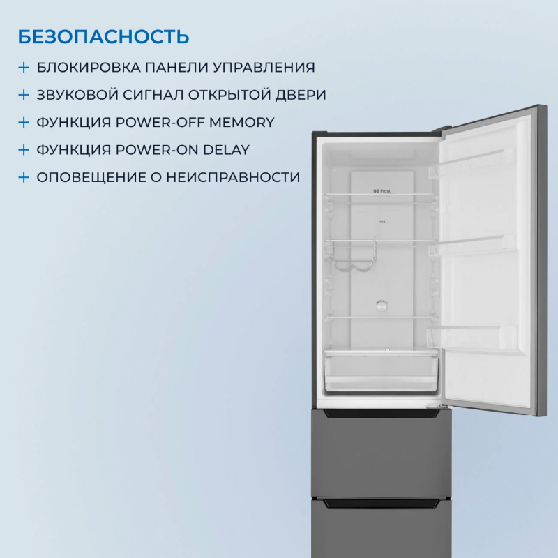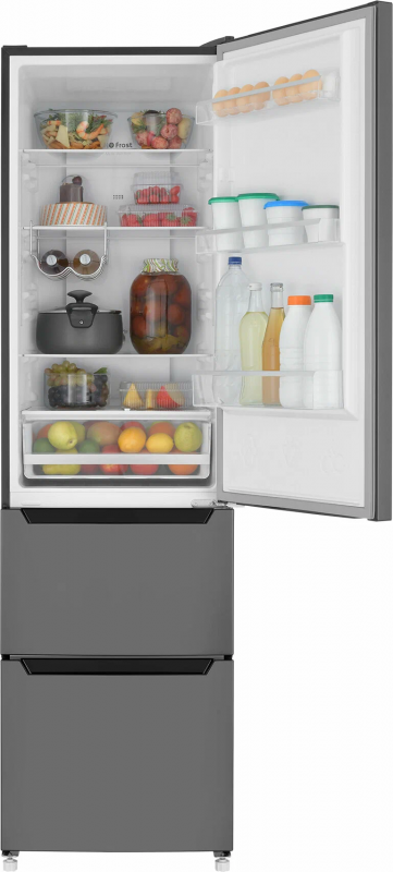Особенности: Система размораживания Full No Frost – это наиболее эффективная система охлаждения холодильной и морозильной камер, обеспечивающая принудительную циркуляцию холодного воздуха и предотвращающая образование наледи на стенках, благодаря чему происходит автоматическое размораживание холодильника Инверторный компрессор обеспечивает экономное потребление электроэнергии и низкий уровень шума при работе Сенсорный LED-дисплей с расширенной индикацией Режим Smart (Интеллектуальный) – автоматический режим для наилучшего сохранения свежести продуктов и экономного расхода электроэнергии Система охлаждения Multi air flow – система раздельного динамического охлаждения воздуха в холодильной и морозильной камерах для эффективной работы холодильника Дверцы с фасадом из нержавеющей стали - практично и стильно Распашная дверь холодильного отделения предоставляет удобный доступ к продуктам, расположенным на полках. Выдвижные ящики морозильного отделения более эффективно сохраняют холодный воздух, позволяют раздельно открывать внутренние зоны и лучше видеть их содержимое без дополнительных потерь температуры и электроэнергии Полки из закаленного стекла - надежность и эстетичный внешний вид Регулируемые по высоте ножки Экологически безопасный: хладагент R600a абсолютно безвреден для окружающей среды Общие данные: Размеры: высота (см): 192 ширина (см): 54 глубина (см): 58,6 Общий объем/ Полезный объем: Холодильника (л): -/282 Холодильной камеры (л): -/197 Морозильной камеры (л): -/85 Тип управления: электронный Класс энергопотребления: А++ Климатический класс: SN-T (от +10°С до +43°С) Количество компрессоров: 1 Годовое потребление энергии: 226 кВтч Цвет: черная нержавеющая сталь Холодильное отделение: 4 полки из закаленного стекла со стальным обрамлением 3 дверных полки Система No Frost (Frost Free, Ноу Фрост) 5 температурных режимов от 2 до 8°C Режим Суперохлаждение - включение пониженной температуры для быстрого охлаждения продуктов Внутренняя LED-подсветка - мягкое равномерное освещение внутреннего пространства Полка для бутылок Большой выдвижной ящик для овощей и фруктов с регулятором уровня влажности Humidity Control Подставка для яиц - 2 шт. (1 х 7 яиц) Морозильное отделение: Система No Frost (Frost Free, Ноу Фрост) Автономное сохранение холода до 7 часов Производительность замораживания 4 кг/24 ч 2 вместительных выдвижных ящика – подходят для хранения большого объема продуктов, а также крупных цельных кусков (тушки рыбы, птицы, дичь и пр.) Форма для льда Дополнительная информация: Блокировка панели управления Звуковой сигнал открытой двери Функция Power-Off Memory - сохранение настроек при отключении электричества Функция Power-On Delay - задержка включения компрессора после сбоя питания менее 5 минут для его защиты от повреждения Оповещение о неисправности – мигание соответствующих индикаторов на панели Тип компрессора: инверторный Мощность при разморозке, Вт: 150 Мощность LED-лампы, Вт: 3 Напряжение/Частота, В/Гц: - 220-240 /50 Номинальная сила тока, А: 0.95 Класс электрозащиты: | Тип хладагента: R600а (изобутан), 48 г Пенообразователь: циклопентан Уровень шума, дБ: 37 Материал фасада: н/ж сталь