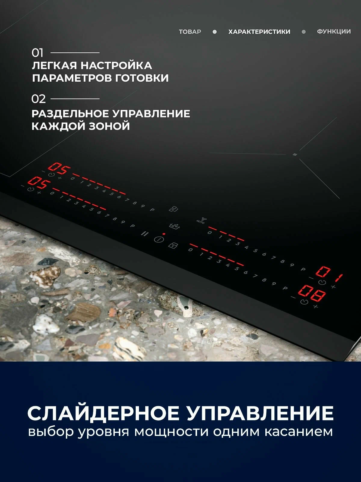 Модель оснащена четырьмя индукционными конфорками разного диаметра и мощности, что позволяет готовить разнообразные блюда одновременно, экономя время. Общая мощность конфорок составляет от 7.8 до 11.7 кВт. Уровень мощности каждой конфорки можно регулировать в 9 ступенях, что обеспечивает точное управление температурой приготовления. Панель управления расположена спереди справа и оснащена сенсорным слайдером DirectAccess для удобного и быстрого управления. Подсветка панели управления облегчает использование в темное время суток. Варочная панель также оснащена таймером EcoTimer с отсчетом времени, звуковым сигналом и автоматическим отключением, что обеспечивает безопасность и комфорт при использовании. Функциональность панели расширяется благодаря наличию таких функций как Stop&Go, PowerBoost и Bridge. Функция Stop&Go позволяет приостановить процесс приготовления и затем продолжить его без потери настроек. PowerBoost обеспечивает быстрый нагрев посуды, а функция Bridge позволяет объединить две конфорки в одну большую для использования большой посуды.
