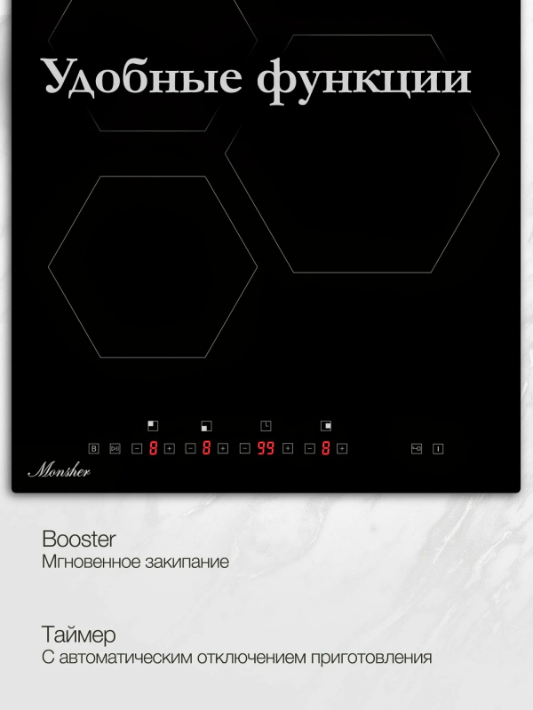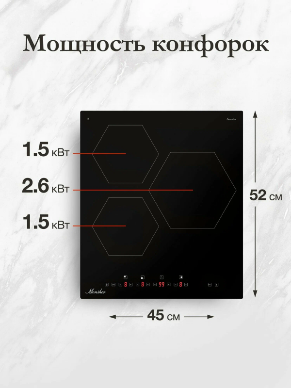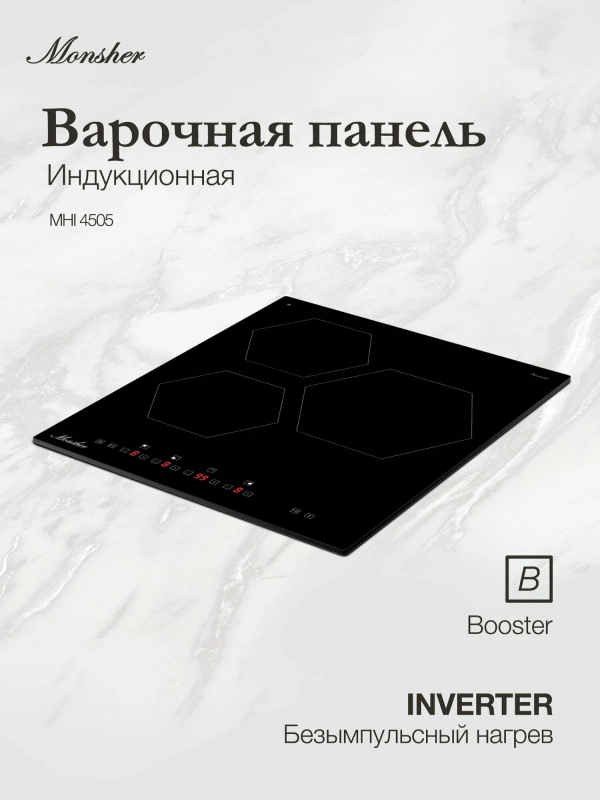 Индукционная варочная поверхность Monsher MHI 4505 — это стильное и функциональное решение для вашей кухни. Изготовленная из прочной стеклокерамики, она обладает не только привлекательным внешним видом, но и множеством полезных функций. Среди них — три конфорки с функцией Booster для моментального нагрева, девять уровней мощности, четыре цифровых дисплея, режим срочного отключения и возобновления работы «Stop and Go», блокировка поверхности, автоматическое выключение, автоматическое закипание, таймер и индикатор остаточного тепла. Размеры варочной поверхности — 450 x 520 x 56 мм, вес — 8470 г. Гарантийный срок составляет 2 года.
