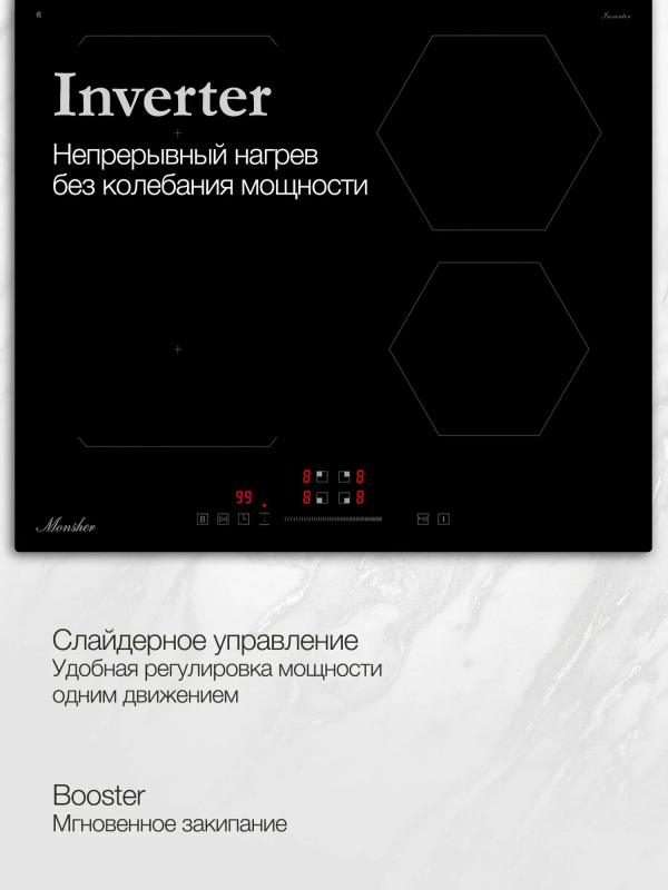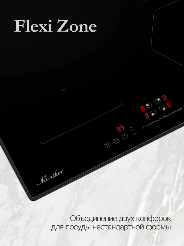 Индукционная варочная панель Monsher MHI 6016 - это современное и функциональное решение для вашей кухни. Изготовленная из высококачественной стеклокерамики, она обеспечивает быстрый и равномерный нагрев, а также простоту в уходе.Панель оснащена четырьмя конфорками, включая одну с овальной зоной нагрева. Это позволяет готовить блюда в посуде разного размера и формы, а также экономить электроэнергию, используя только ту зону нагрева, которая необходима в данный момент.Сенсорное управление и слайдерное переключение обеспечивают удобство и точность регулировки мощности нагрева. Расположение панели управления спереди облегчает использование панели.Безопасность использования обеспечивается индикаторами остаточного тепла, блокировкой от детей и защитным отключением конфорок.Дополнительные функции, такие как функция Booster, автоматика закипания, кратковременная пауза, поддержание тепла и таймер, делают использование панели еще более удобным и функциональным.Размеры панели составляют 590*520*40 мм, что позволяет легко интегрировать ее в любой интерьер. Вес товара составляет 7800 г, а минимальная толщина столешницы - 30 мм.В комплект поставки входит сетевой шнур длиной 90 см, что обеспечивает удобство подключения панели к электросети.