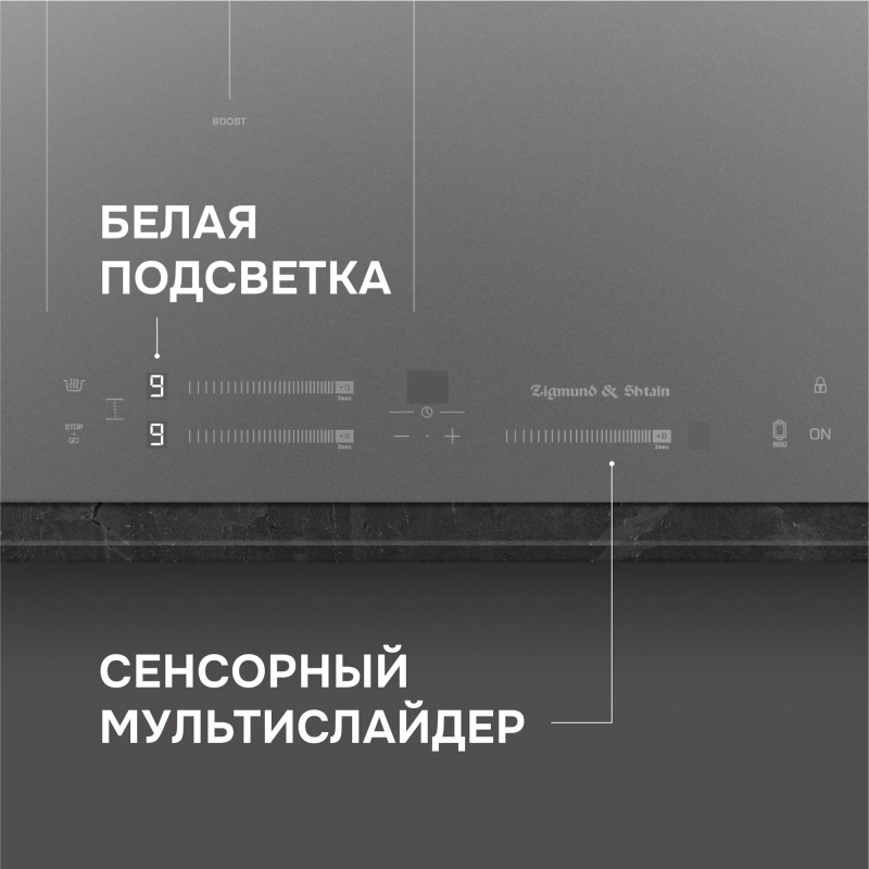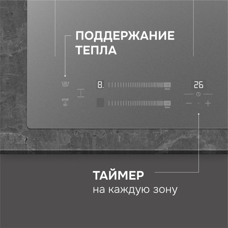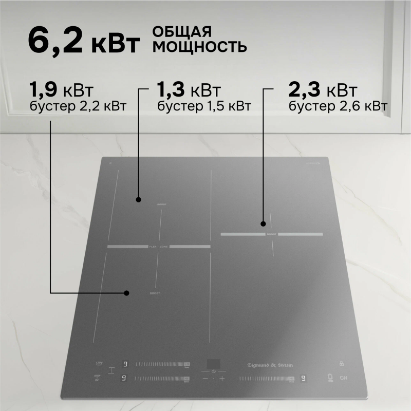 Индукционная стеклокерамическая поверхность Zigmund & Shtain CI 24.4 легко впишется в кухню любого дизайна. Сочетание функциональности и уникального дизайна black-on-black сделают ее вашим незаменимым помощником на кухне. Преимущество технологии индукционного нагрева в том, что конфорки нагревают непосредственно дно посуды, оставляя рабочую поверхность плиты холодной, а благодаря автоматическому определению диаметра посуды, площадь нагрева адаптируется под размер дна, что существенно экономит электроэнергию. При этом нужная температура достигается в 3 раза быстрее.Технология INVERTER индукционной панели Zigmund & Shtain CI 24.4 позволяет избежать пригорания и перегрева блюд за счет поддержания равномерного постоянного нагрева даже на самых низких мощностях. Поддержание постоянной температуры важно как во время жарки блинов, так и для растапливания шоколада, сливочного масла, а также для приготовления фондю и соусов. Кроме того, инверторный нагрев снижает уровень шума при включении индукции и во время всего процесса приготовления.Стеклокерамика Kanger производителя мирового уровня выдерживает нагрев до 700°C и обладает повышенной стойкостью к механическим и химическим воздействиям. Высокая плотность материала позволяет стеклокерамике Kanger сохранять неизменный вид долгие годы.Сенсорная панель с мультислайдером делает управление интуитивно понятным. Чтобы включить прибор и выставить нужную мощность нагрева, не нужны физические усилия. Достаточно коснуться кнопки включения и индикатора конфорки, а затем провести пальцем по слайдеру левой или правой зоны, пока на LED-дисплее не появится нужная мощность.Три зоны нагрева с мощностью 1900/2200 Вт, 1300/1500 Вт, 2300/2600 Вт, а также FLEX-зона с мощностью 3000/3600 Вт позволяют быстро и комфортно приготовить любимые блюда.Широкий диапазон температур – 9 уровней нагрева.Таймер отключения до 99 минут на каждую зону нагрева избавляет от необходимости постоянного контроля за процессом приготовления, например, при варке яиц и макарон.Индикация остаточного тепла обеспечивает дополнительную безопасность для всех членов семьи – светящаяся буква «Н» предупреждает, что прикасаться к поверхности пока нельзя, потому что конфорка еще горячая.Блокировка панели управления оградит детей, домашних животных и ваш дом от нежелательного включения или изменения настроек.Дополнительным бонусом является защита от перелива и перегрева – варочная поверхность в этих случаях автоматически выключается, защищая столешницу и кухонный гарнитур.Функция «Бустер», имеющаяся на каждой конфорке, позволяет кратковременно увеличить мощность нагрева до максимума, чтобы в 2-3 раза сократить время доведения воды, молока или супа до кипения.Объединение двух зон нагрева в расширенную FLEX-зону обеспечивает полную свободу в использовании посуды для индукции любого размера.На варочную поверхность действует гарантия по системе «3+2», где первые три года на товар действует полное гарантийное обслуживание, а затем два года есть возможность получить запчасти бесплатно.ХарактеристикиТип панели: индукцияШирина, см: 45Напряжение, В: 220-240Количество конфорок: 3Управление: мультислайдерМатериал поверхности: стеклокерамикаОбщая мощность, Вт: 6200Ближняя левая: 180 мм, 1900/2200Дальняя левая: 180 мм, 1300/1500Левая Flex-зона: 180*380 мм, 3000/3600Дальняя правая: 180 мм, 2300/2600Бустер на каж