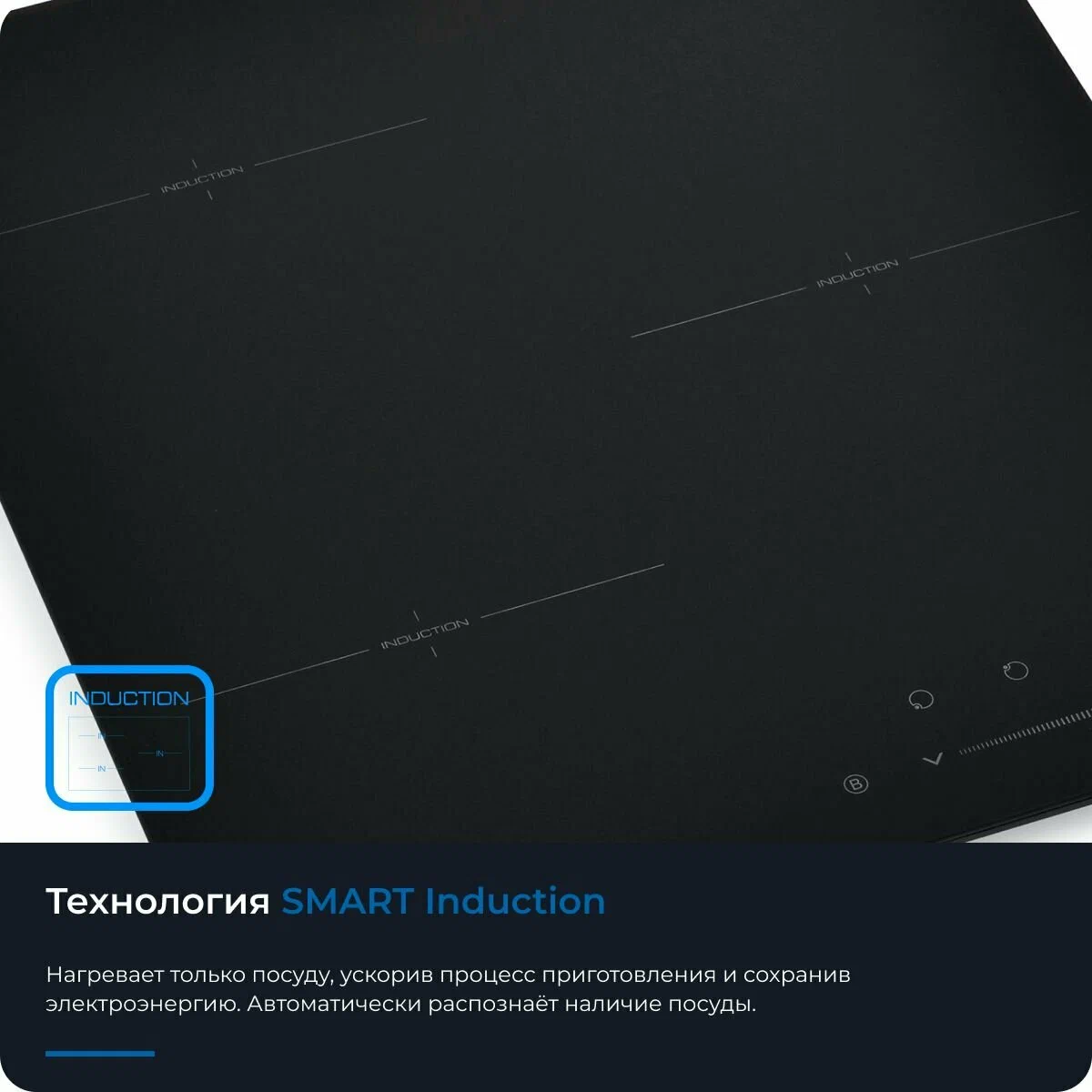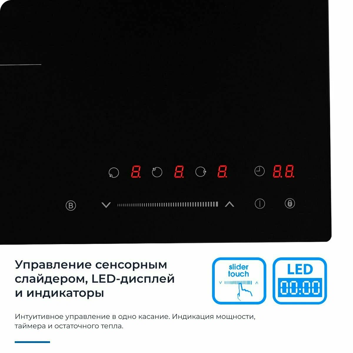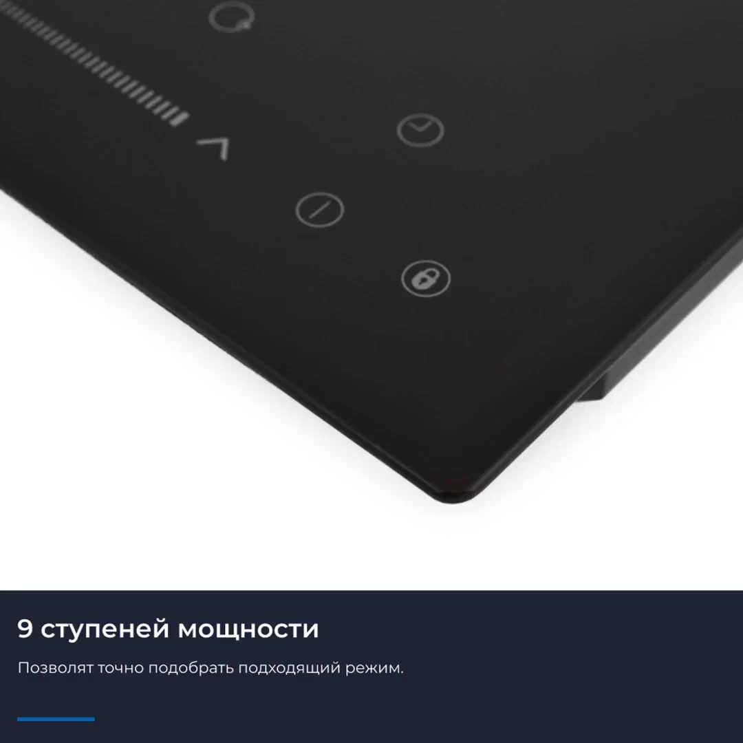 Тип панели: индукционная; Установка: независимая; Материал панели: стеклокерамика; Количество уровней мощности: 9; Переключатели: сенсорные; Расположение панели управления: спереди; Тип сенсорного управления: слайдерное; Рамка: нет;
