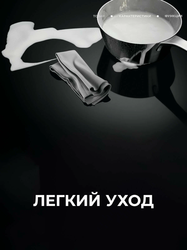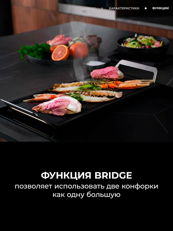 Дополнительные функции:PowerBoost: Увеличенная мощность для быстрого нагрева.OptiHeat Control: Индикатор остаточного тепла (3 уровня).Hob²Hood: Синхронизация с вытяжкой (автоматическая регулировка скорости вентилятора).Таймер: Отсчет времени для зон нагрева (00–99 мин).Защита от детей: Блокировка панели управления.Bridge/индукционный мост: Две левые конфорки объединяются в одну