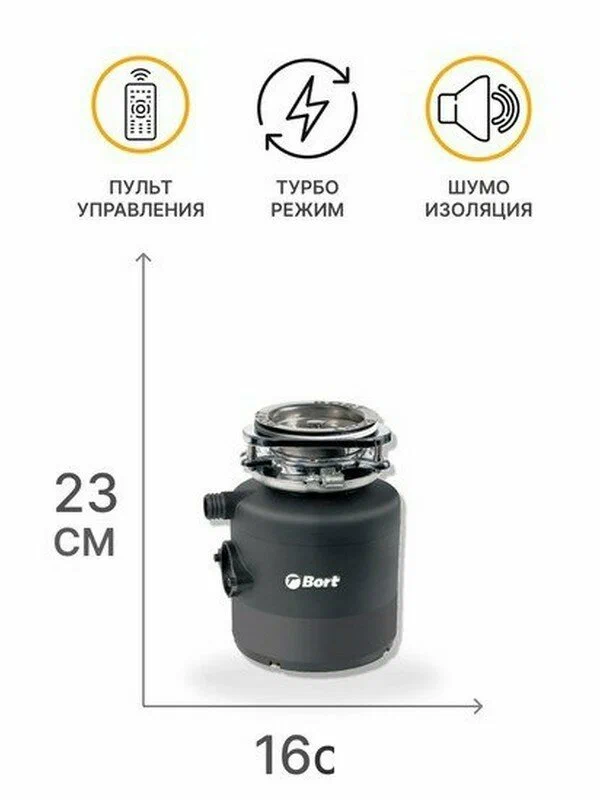 Измельчитель пищевых отходов Bort станет незаменимым помощником в каждом доме, позволяя устранять пищевые отходы, исключая их попадание в мусорный пакет. С таким приспособлением вы сможете избавить себя от частого выноса мусора, измельчая отходы пищи с дальнейшим их удалением в сливную трубу мойки. При установке прибора нужно учитывать толщину мойки: эта величина не должна быть больше 18 мм. Компактные размеры измельчителя позволяют легко его устанавливать в сливе мойки, разместив в небольшой кухонной тумбе.