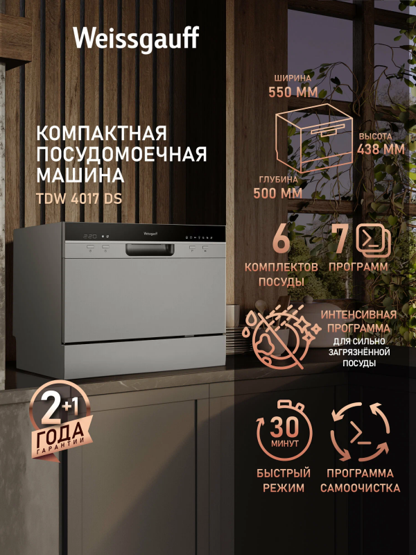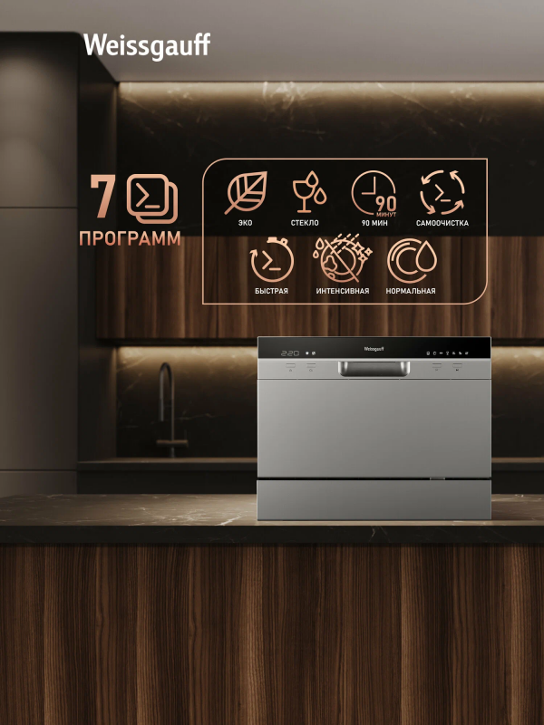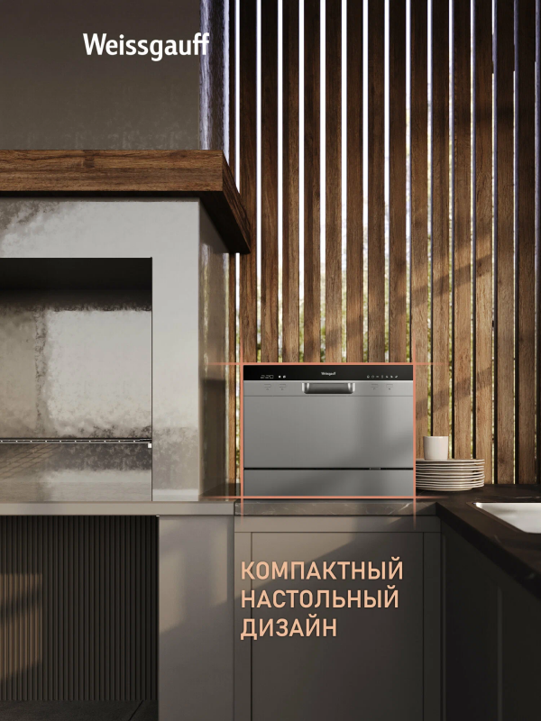 Настольная отдельностоящая посудомоечная машина Weissgauff — бытовая техника для кухни, которая экономит ваши время и силы. Посудомойку для кухни можно установить в любом удобном месте благодаря компактным размерам и универсальному дизайну. Эргономичные современные корзины позволяют загрузить до 6 наборов посуды одновременно. Широкий выбор из 7 программ позволяет справиться с любыми загрязнениями. Быстрый режим позволяет всего за 30 минут управиться со всей грязной посудой, которая накопилась после ужина. Хрупкие бокалы, стаканы и фужеры можно помыть без разводов при помощи опции «Стекла». Если вы забыли грязную кружку на столе, загрузите её на начальном этапе цикла благодаря возможности дозагрузки. Начало работы можно установить в любое время — встроенный таймер до 24 часов облегчает использование посудомоечной машинки. Электронное управление мойкой для посуды интуитивно понятно любому пользователю. Удобный цифровой дисплей с крупной индикацией помогает легко управлять бытовой техникой на кухню. Функция самоочистки существенно облегчает поддержание посудомоечной машины в чистоте и работоспособном состоянии, снижая необходимость в регулярном ручном уходе и предупреждая накопление отложений и неприятных запахов.Предоставляемая гарантия на 3 года подчеркивает высокое качество и надежность посудомоечной машины Weissgauff, предоставляя вам уверенность в долгосрочной и бесперебойной работе этого устройства.