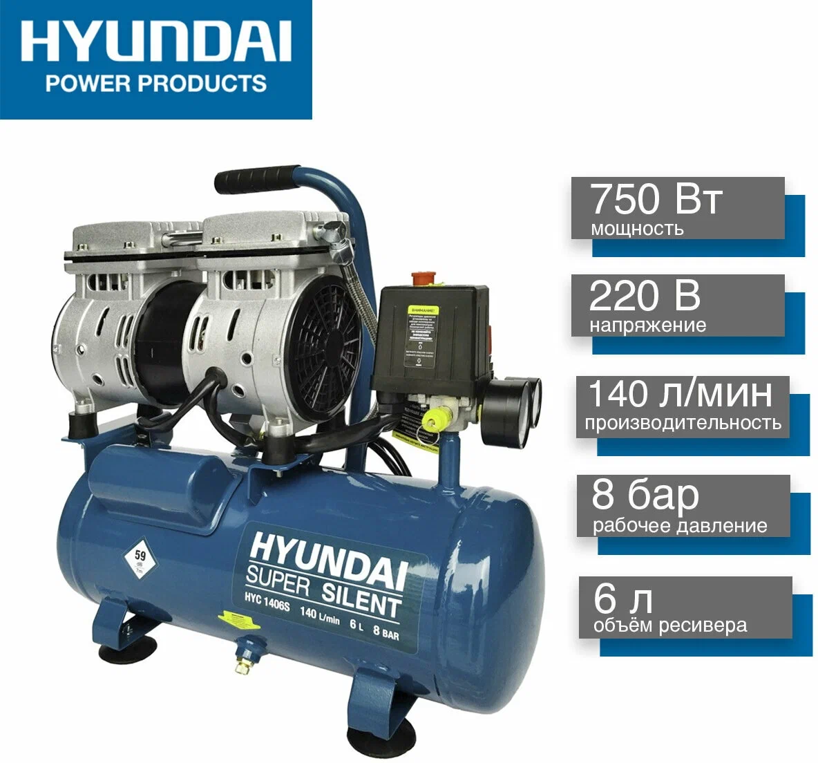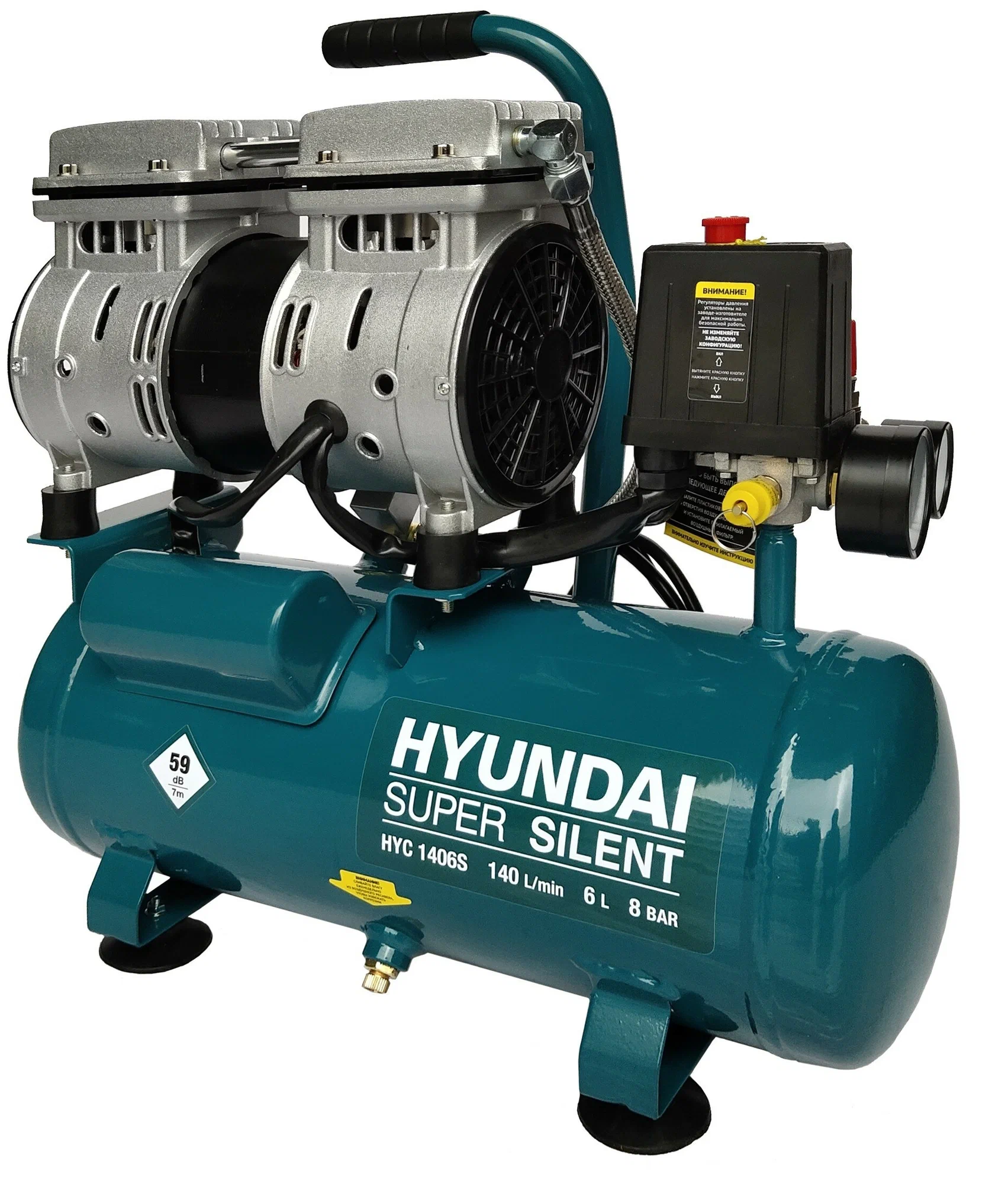 Компрессоры HYUNDAI являются сложными электромеханическими изделиями и предназначены для обеспечения работы сжатым воздухом пневматического оборудования, аппаратуры и инструмента, применяемого в промышленности, автосервисе и для других целей потребителя.Воздушный поршневой компрессор Hyundai HYC 1406S является:безмасляным;Поршневым;бесшумным.Регулировка давления в ресивере – автоматическая.Воздушные компрессоры HYUNDAI снабжены автоматикой, которая обеспечивает длительную эксплуатацию компрессоров. При достижении давления 8 атм. компрессор автоматически выключается, при этом происходит разгрузка цилиндров.