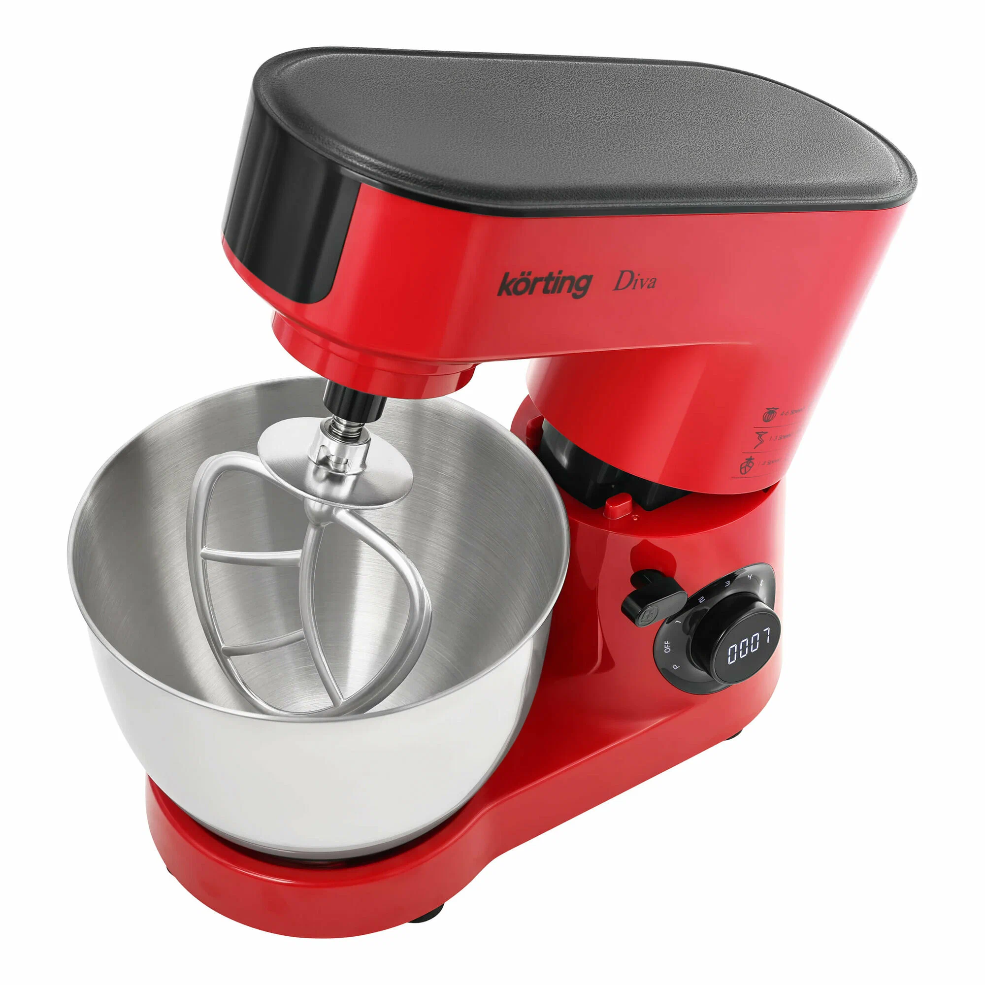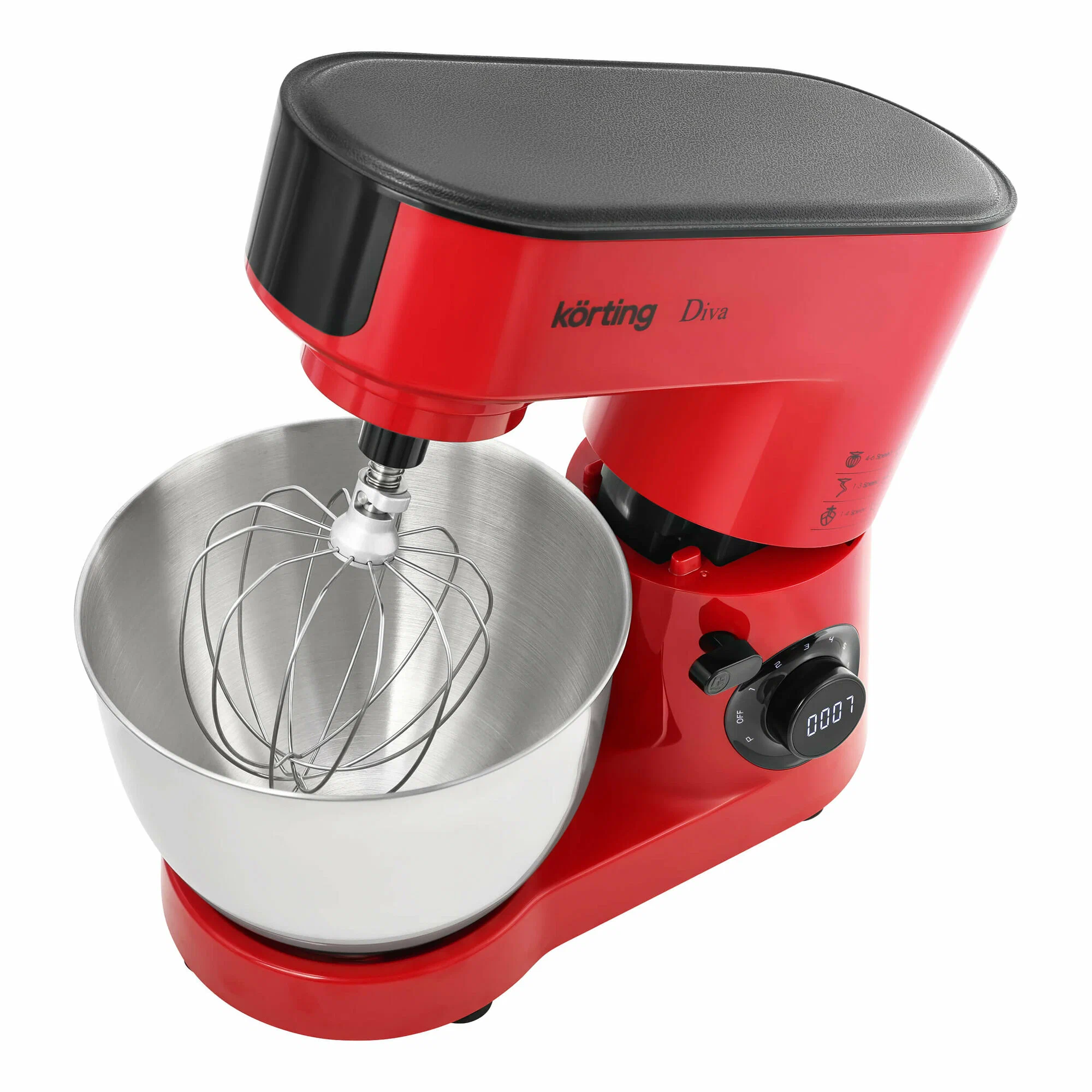 Кухонная машина KORTING KKM 0103 Diva погружает в мир кулинарного вдохновения. Шесть скоростных режимов и импульсный режим позволяют точно настроить вращение под каждую конкретную задачу. Выполненная в красном цвете, она имеет мощность 1500 Вт и комплектуется тремя различными насадками для взбивания, смешивания и замешивания теста. Эти процессы осуществляются в просторной чаше из нержавеющей стали объемом 6,3 литра. Также машина комплектуется защитной крышкой со специальным отверстием для добавления ингредиентов во время работы. Планетарное вращение насадок обеспечивает равномерное и быстрое перемешивание продуктов. Интуитивно понятное управление позволяет легко регулировать скорость и выбирать необходимый режим работы. Система двойной защиты двигателя надежно оберегает от перегрева и перегрузки. Цифровой дисплей предоставляет всю необходимую информацию о работе кухонной машины, а прорезиненные нескользящие ножки обеспечивают стабильное положение на любой поверхности.