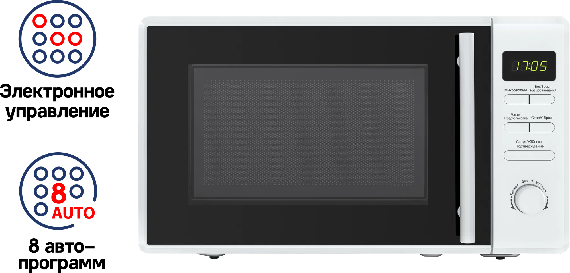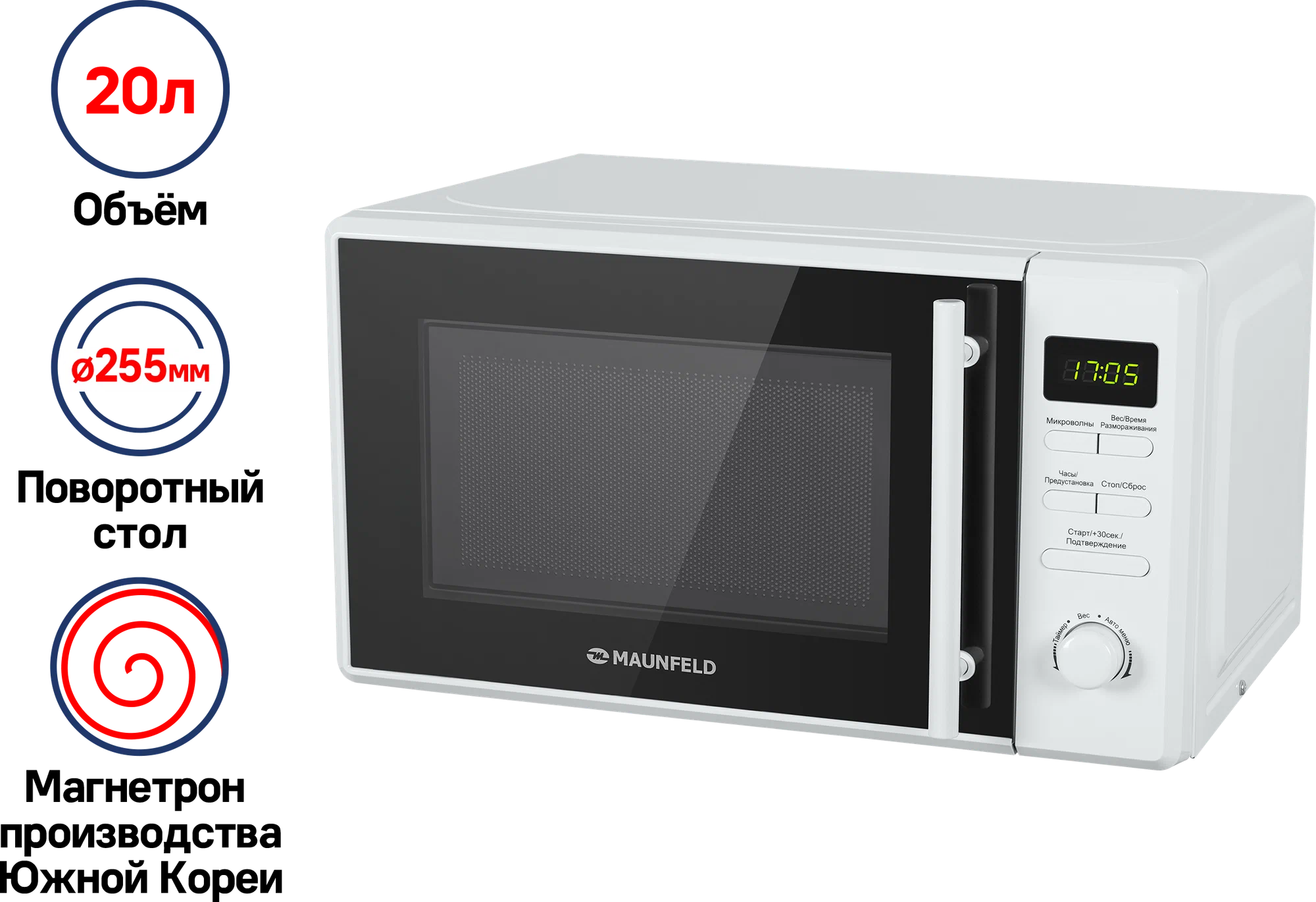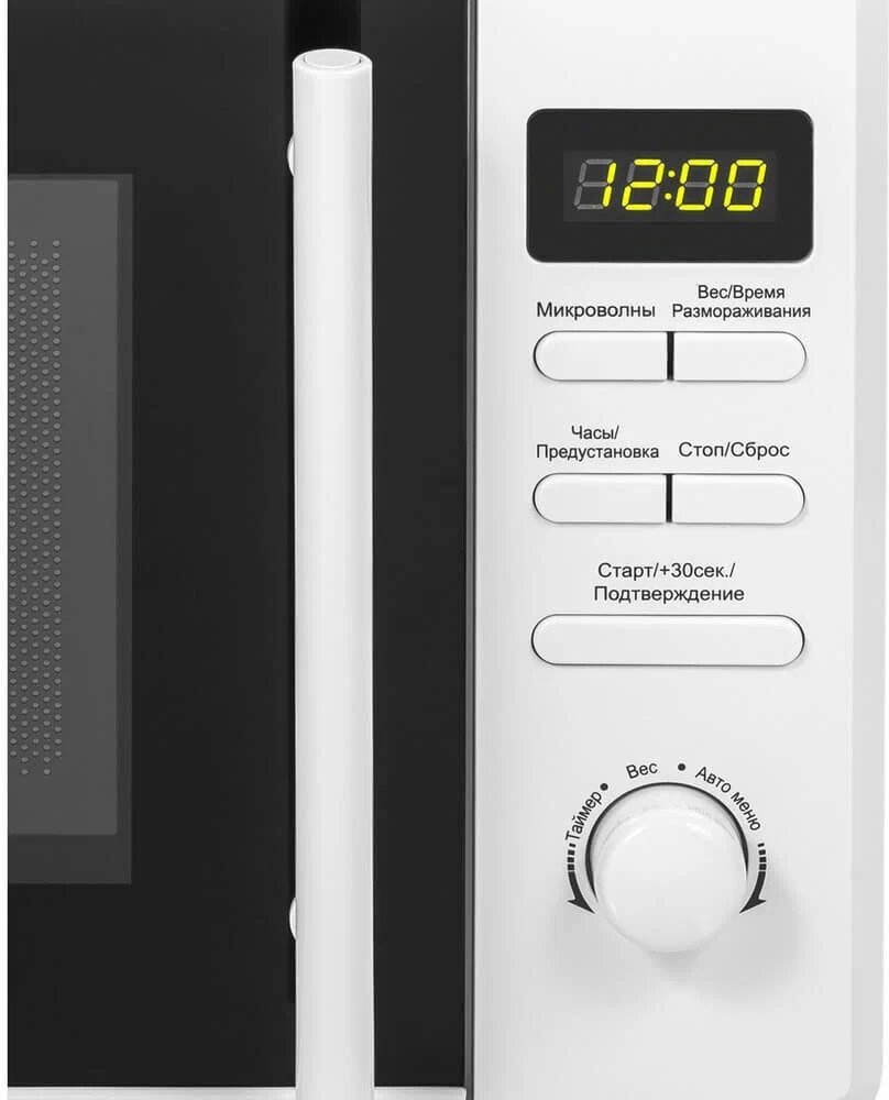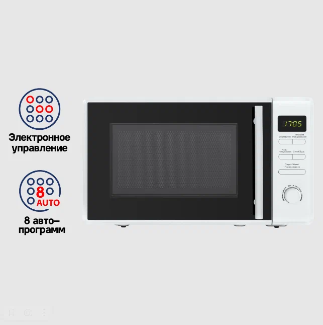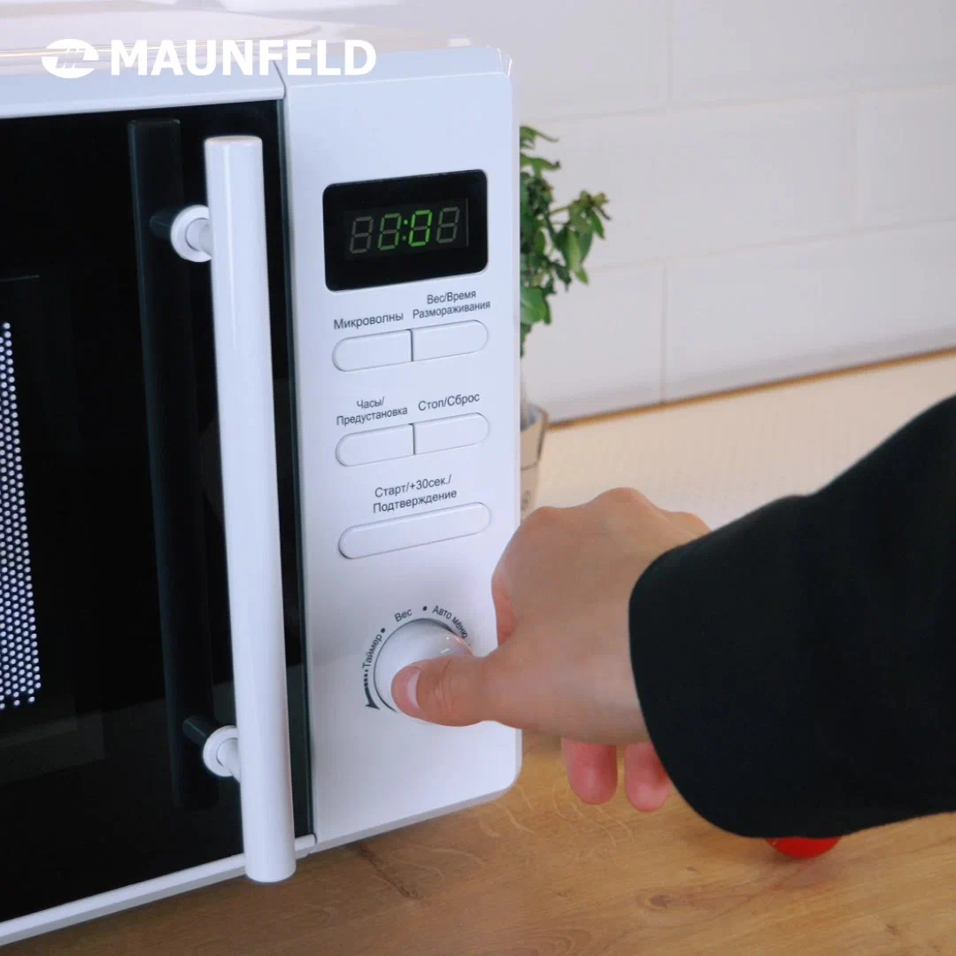 Особенности:Микроволновая печь мощностью 1150 Вт выполнена из нержавеющей стали и оснащена высококачественным магнетроном производства Южной Кореи. Ширина печи всего 44 см, что позволяет поместить ее в любой кухне.Камера объемом 20 л имеет специальное белое эмалевое покрытие легкой очистки. В ней находятся вращающееся кольцо диаметром 255 мм со стеклянным столиком и галогеновое освещение.На передней панели СВЧ установлен дисплей. Ниже находятся кнопки управления, позволяющие выбрать:режим микроволн (5 уровней мощности)режим размораживания (по весу/по времени)режим быстрого приготовления,многоступенчатый режимрежим автоматического приготовления (8 программ)таймерстарт или стоп работыОткрывание навесной дверцы производится за ручку. Предусмотрена блокировка от детей.В комплекте к СВЧ идет вращающеесякольцо, стеклянный поддон и инструкция.