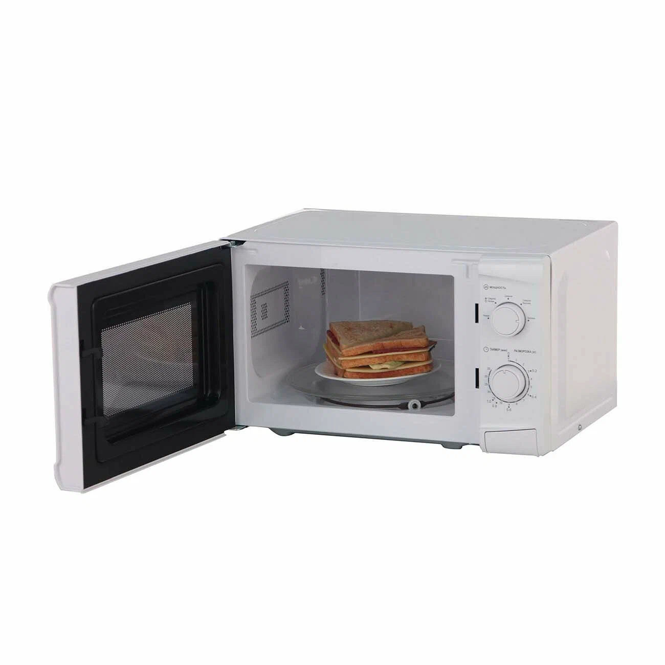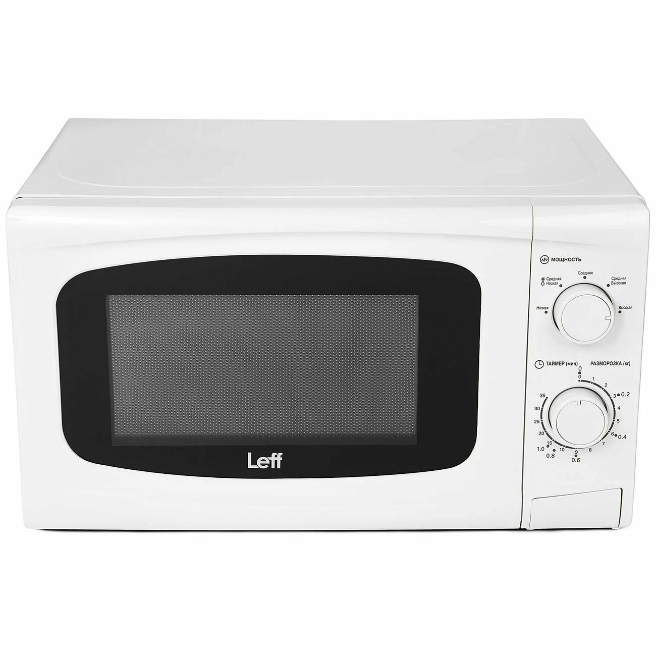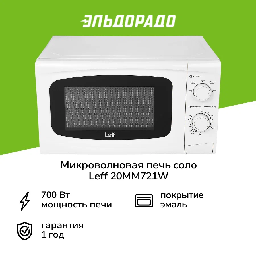 Leff 20MM721W - микроволновая печь с камерой 20 л. Она подходит для приготовления и подогрева еды и размораживания продуктов и полуфабрикатов. Система управления - механическая, есть функция Пауза и таймер со звуковым сигналом.Фронтальная панель сделана из стекла и пластика. Дверца открывается налево с помощью нажатия на клавишу. Диаметр поворотного стола - 24,5 см. Есть встроенное освещение. Внутренние стенки покрыты эмалью. Размеры прибора - 26 х 44 х 35,5 см, вес - 10,5 кг.