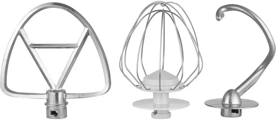 В комплекте с миксером идут три насадки: венчик металлический для взбивания, венчик А-образный и замесочный крюк. Это позволяет использовать миксер для приготовления различных блюд и десертов.