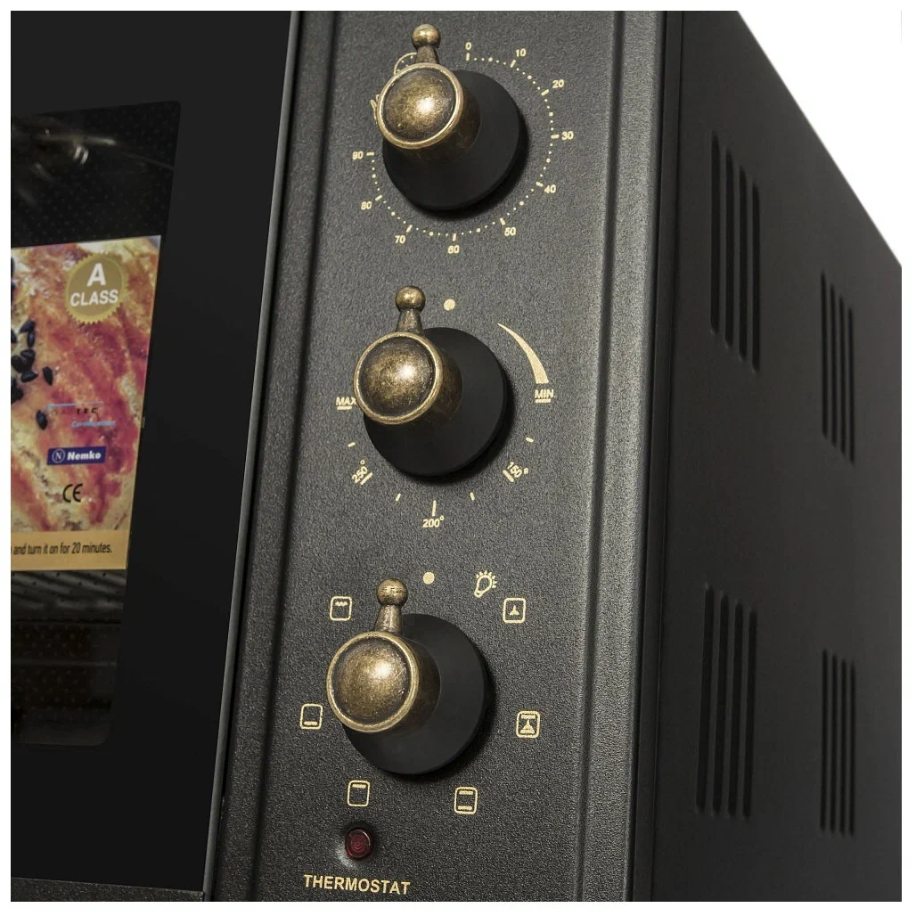 Технические характеристики:Объем, л: 45Мощность, Вт: 1500 ВтКоличество режимов работы: 7Класс энергопотребления: АГабариты см: 30х60х40Особенности:грильтермостаттаймер (90 мин)автоотключениезвуковой сигналэмаль лёгкой очисткиуплотнитель стеклянной дверцыширокое термостойкое стеклоплотное крепление нагревательных элементов,нагревательные элементы из нерж. стали (нижний-скрытый),индикатор термостата,индикатор режима конвекцииКомплектация:решетка для гриляпрямоугольный противенькруглый противеньЦвет корпуса: черныйЦвет фурнитуры: бронза