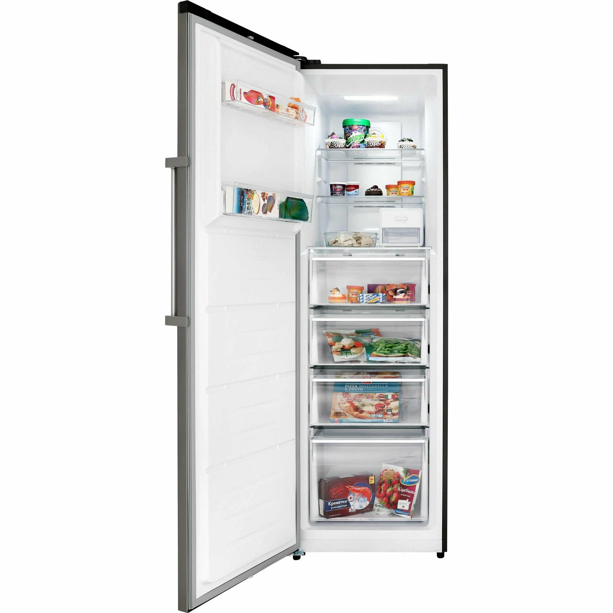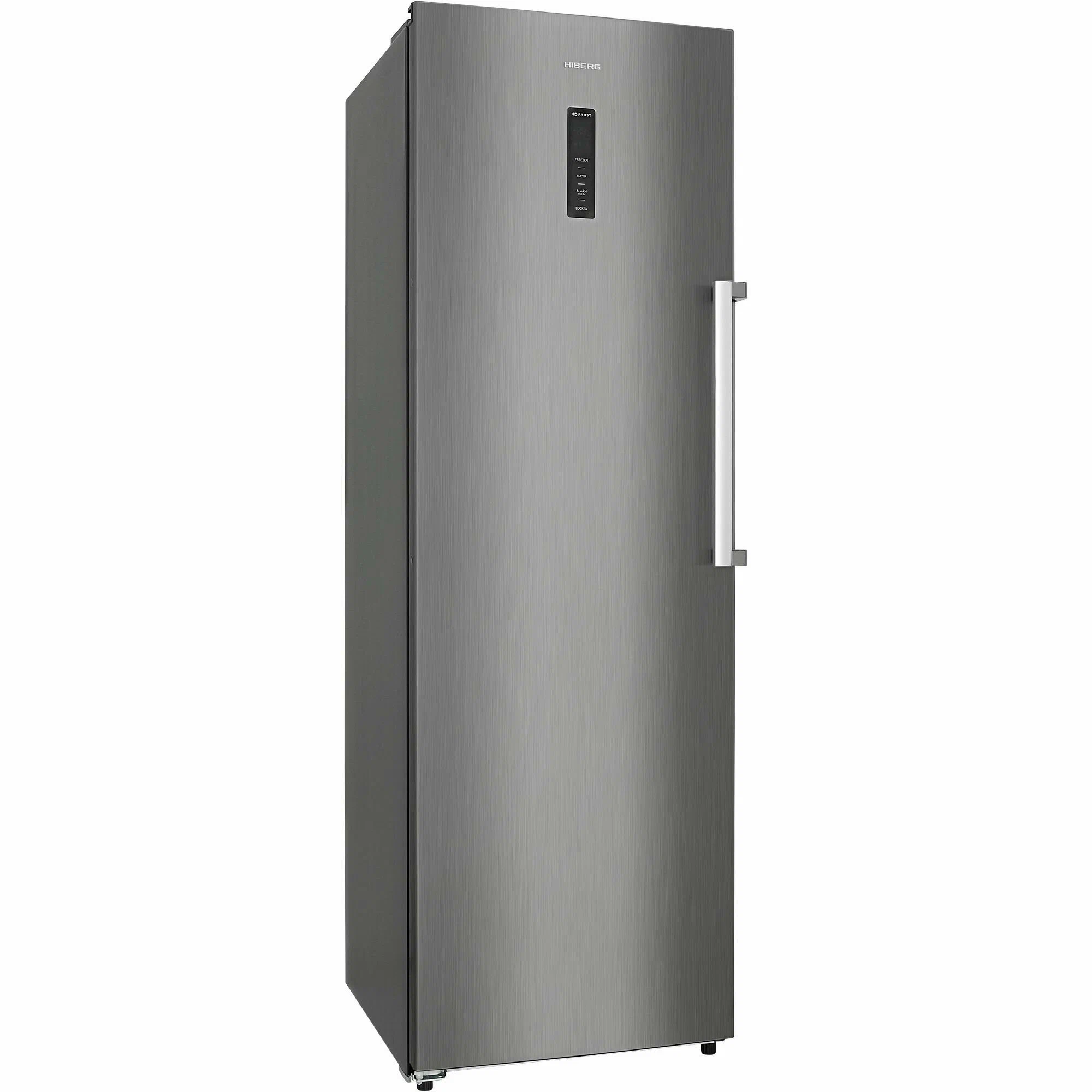 Морозильник HIBERG i-FR 40 с инверторным компрессором, автоматической системой охлаждения No Frost и электронным управлением подходит для долговременного и бережного хранения замороженных продуктов. Морозильник в сочетании с холодильником HIBERG i-RF 40D станет функциональной комбинацией и создаст единую линию кухонного гарнитура. Крепежные аксессуары предоставляются при покупке комбинации «холодильник + морозильник». Корпус морозильника выполнен в современном лаконичном дизайне. Дверь можно перенавесить с правой стороны на левую, а для ее легкого открывания предусмотрена навесная ручка с толкателем. Дверь морозильника открывается на 90 градусов, что удобно для свободного извлечения ящиков. Высота модели — 185 сантиметров. Общий объем морозильника — 304 литра. Мощность замораживания — до 24 кг в сутки. В случае отключения электроэнергии морозильник может автономно сохранять холод до 12 часов. Электронная панель управления расположена на двери морозильника. Нажатием на сенсорные кнопки можно легко выбрать необходимый режим или функцию, а также отрегулировать температуру заморозки. Режим «Суперзаморозка» до -25 °С позволяет быстро заморозить большой объем продуктов с максимальным сохранением их полезных свойств. Высокая скорость замораживания исключает образование крупных кристаллов льда, продукты не примерзают к поверхностям камеры, практически не выделяют сок, не теряют форму, цвет и вкусовые качества. Благодаря функции ECO морозильник будет работать в энергосберегающем режиме без потери качества хранения продуктов, что идеально при длительном отсутствии дома всех членов семьи. Когда «ECO-режим» активирован, морозильник будет самостоятельно поддерживать необходимую температуру в зависимости от температуры окружающей среды: от -15 до -18 °C. Сигнализация открытой двери сработает, если дверь холодильника открыта более 90 секунд. Если температура в работающей камере будет слишком высокой в течение 6 часов из-за сбоя в питании или по другим причинам, то сработает звуковая сигнализация. Она автоматически отключится, если температура в морозильнике опустится до нормального значения (-10 °С).