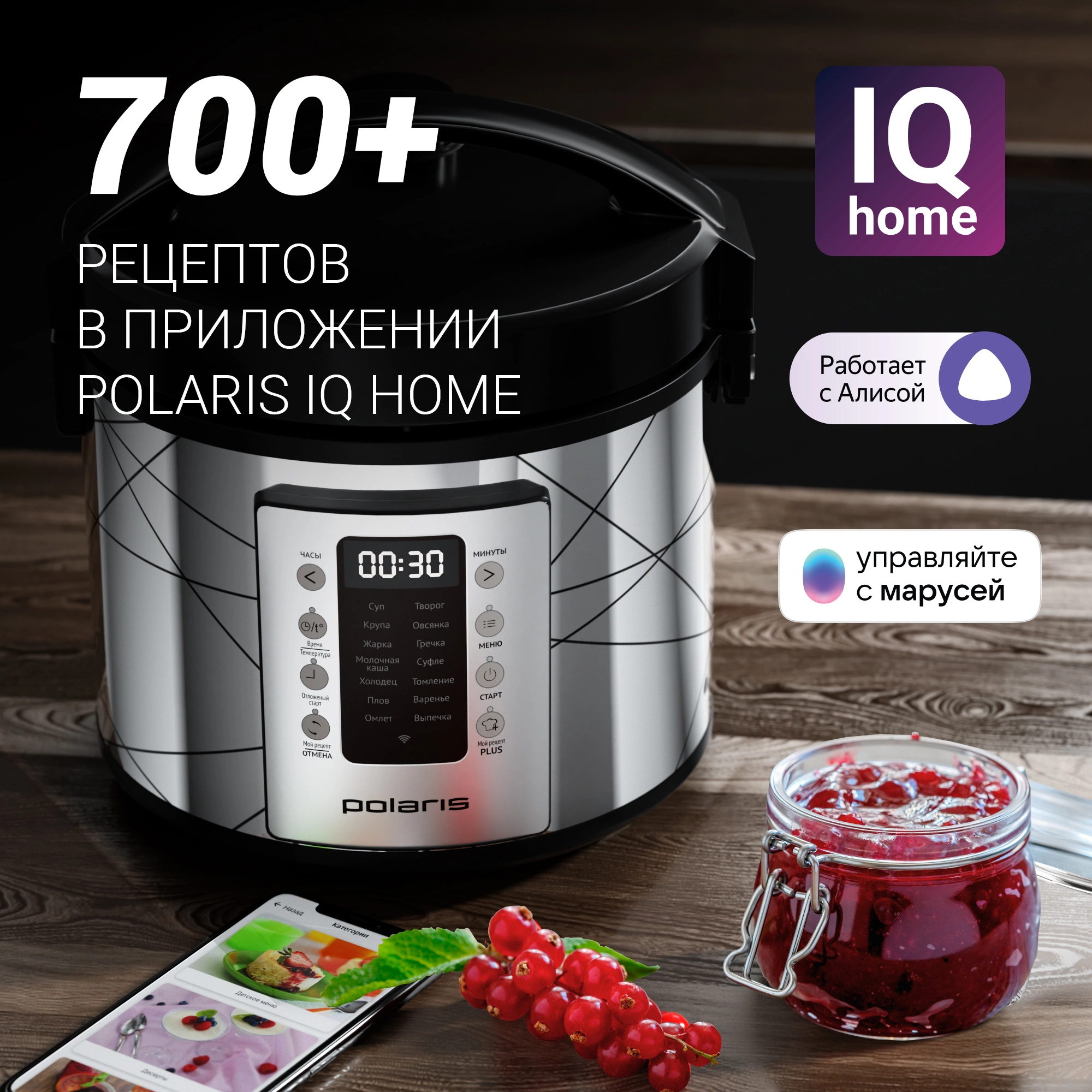 Бренд: POLARIS Тип: Мультиварка Серия: IQ Home Модель: PMC 5020 Wi Fi PartNumber/Артикул Производителя: PMC 5020 Объем чаши: 5 л Антипригарное покрытие: ДА Мощность: 750 Вт Тип управления: электронное ЖК дисплей: ДА Разогрев: ДА Поддержание температуры: ДА Таймер отсрочки старта: ДА Время отсрочки старта, макс: 24 ч Управление с мобильного телефона: ДА Программы приготовления: Выпечка, Крупа, Суп, Йогурт, Холодец, Тушение, Варенье, Плов, Жарка, Молочная каша, Варка на пару, Творог, Овсянка, Разогрев. Количество автоматических программ: 45 Цвет: серебристый Конструкция крышки: откидывающаяся Цвет мультиварки: серебристый/черный Вес товара: 2.87 кг Размеры: 280x310x310мм Габариты упаковки (ед) ДхШхВ: 0.32x0.32x0.32 м Вес упаковки (ед): 3.91 кг Объем упаковки (ед): 0.032768 м3 Часть умного дома: ДА Экосистема: VK, Яндекс Совместимость с голосовыми помощниками: Алиса, Маруся