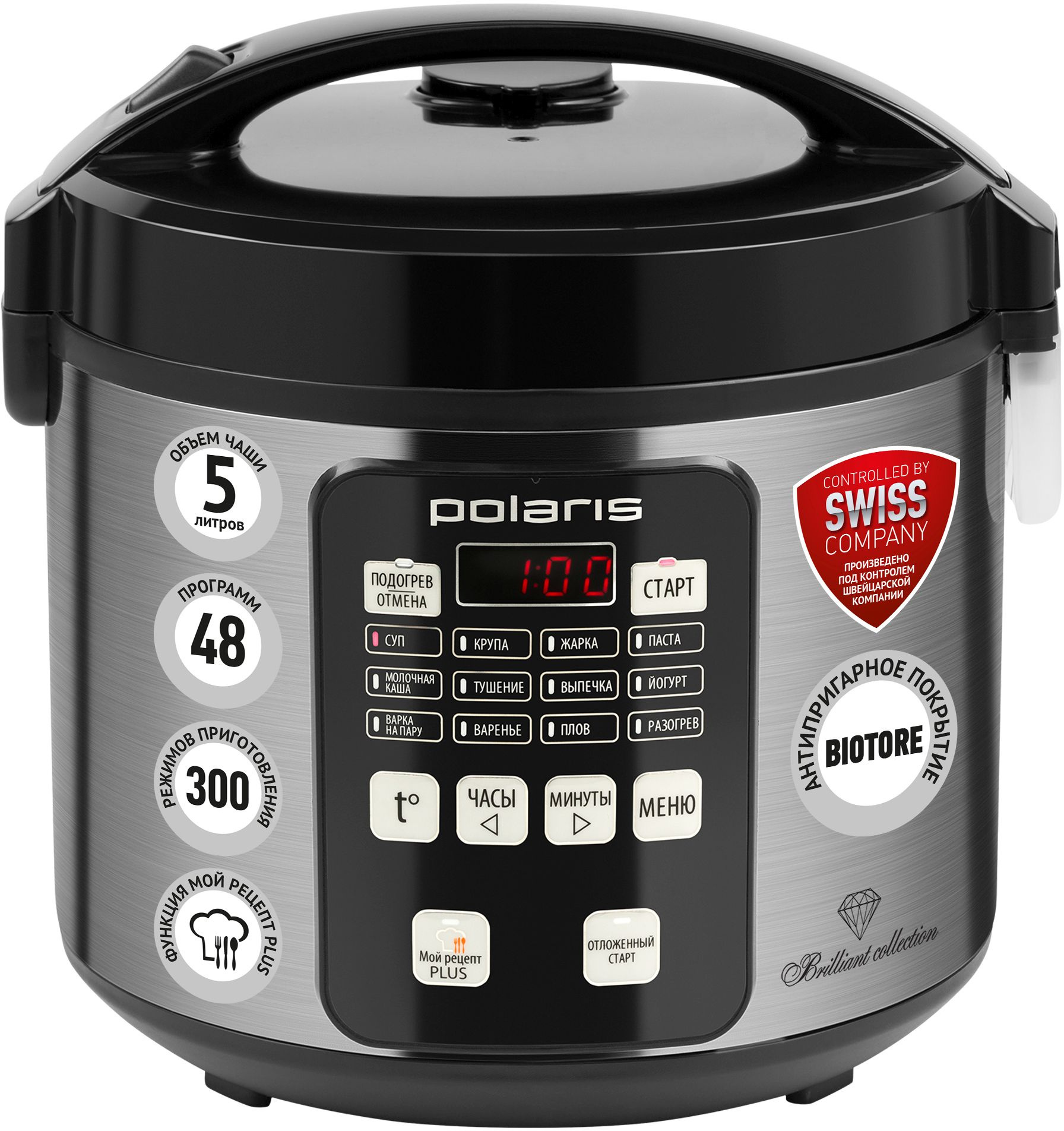 Описание: 48 программ. 300 режимов приготовления. Таймер отсрочки до 24 часов позволяет приготовить еду к назначенному времени. Внутренняя чаша 5 л c антипригарным покрытием Biotore. Многофункциональный дисплей. Поддержание температуры 24 часа.