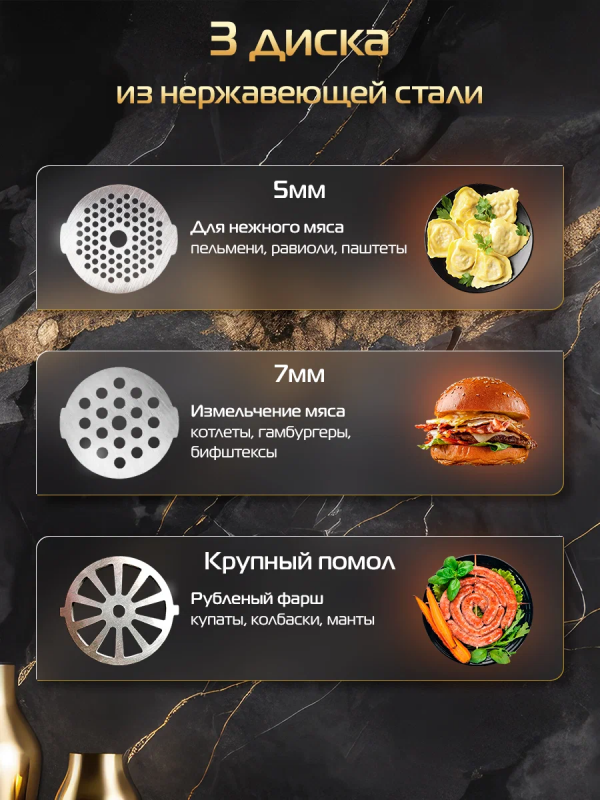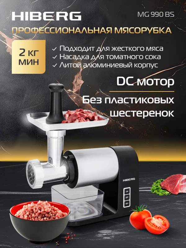 Электрическая мясорубка HIBERG MG 990 – надежный, стильный и многофункциональный помощник на вашей кухне! Лаконичная модель гармонично впишется в любой современный дизайн кухни.Модель способна всего за минуту перемолоть 2 килограмма мяса, благодаря максимальной мощности 2000 Вт и внутреннему острому ножу из нержавеющей стали. Функция реверса запускает обратное вращение шнека, что помогает без труда измельчить даже большие и жилистые куски мяса.Мясорубка обладает мощным металлическим корпусом и алюминиевым загрузочным лотком с удобным толкателем. В комплекте также идут вместительный пластиковый контейнер, 3 решетки и 3 насадки, с помощью которых можно сделать любой фарш, приготовить колбаски, кеббе и даже приготовить домашний томатный сок.Устройство отличается комфортным уровнем шума до 75 дБ. Прорезиненные ножки не дают скользить по поверхности стола во время работы.Особенности и преимущества:- максимальная мощность 2000 Вт;- функция реверса;- 3 насадки и 3 решетки, в том числе для колбасок и кеббе;- металлический корпус;- комфортный уровень шума.Мясорубка электрическая с насадками HIBERG MG 990 – знак премиального качества, высокой функциональности и надежности.Гарантия на мясорубку – 2 года.
