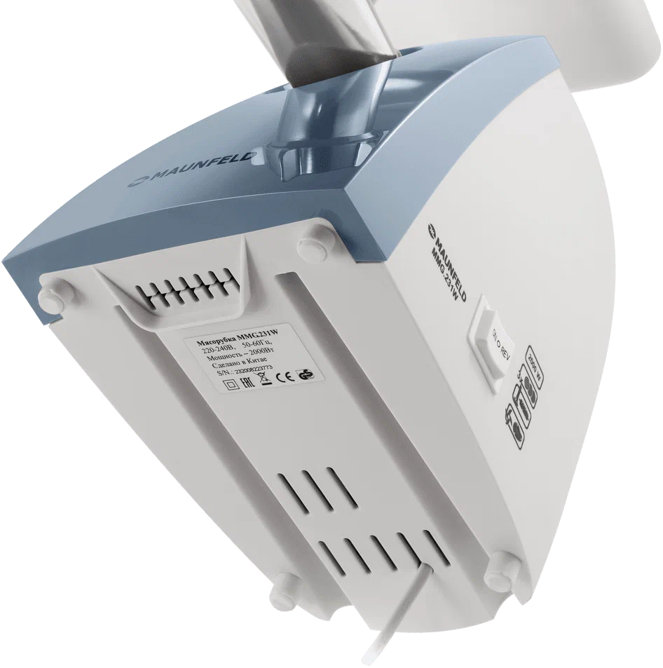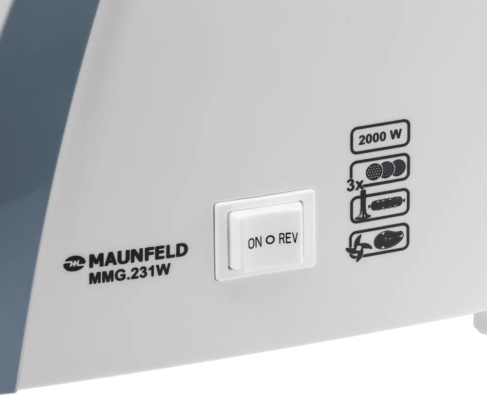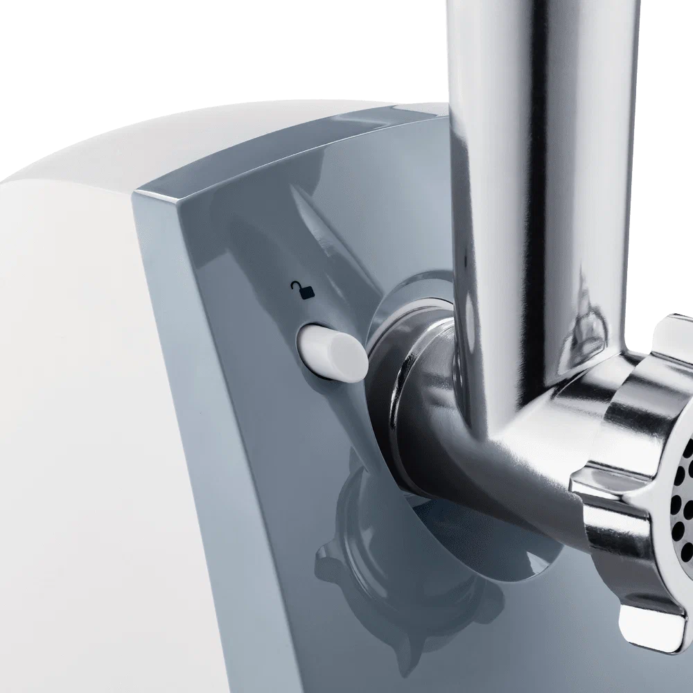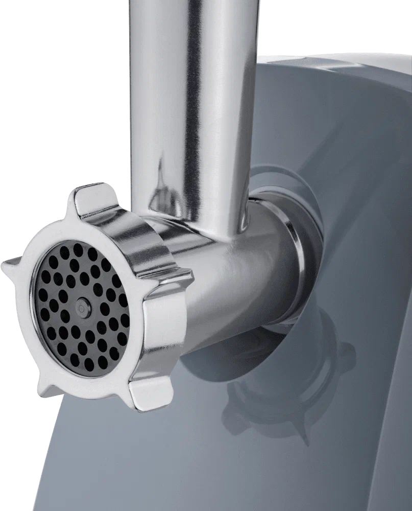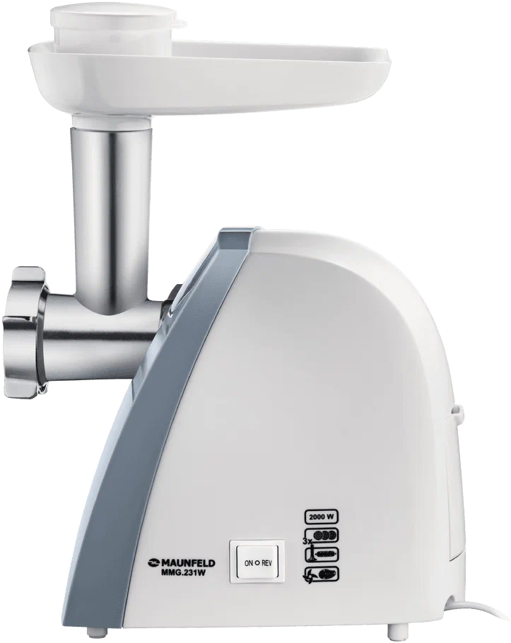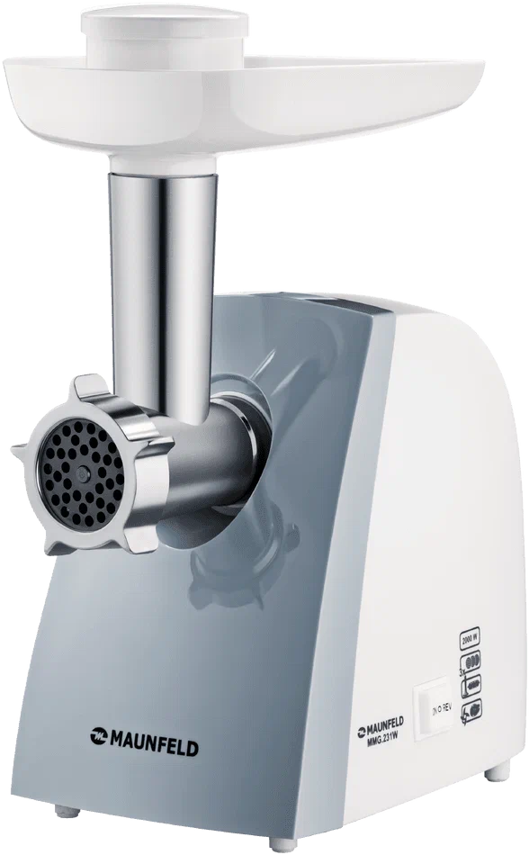 Электрическая мясорубка с реверсом и эргономичным хранением аксессуаров.