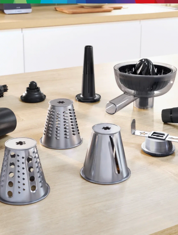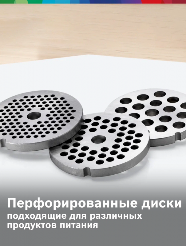 Bosch MFWS609W обладает номинальной мощностью 500 Вт и максимальной мощностью 2100 Вт при блокировке мотора. Это обеспечивает высокую производительность и позволяет быстро и качественно переработать мясо. В комплекте с мясорубкой идут насадка для приготовления колбас и три перфорированных диска для фарша: крупный, средний и мелкий. Это значительно расширяет возможности использования мясорубки и позволяет приготовить фарш нужной консистенции.