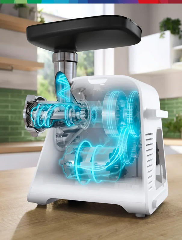 Мясорубка оснащена двумя скоростями работы и системой реверса, что обеспечивает простоту и удобство управления. Поворотный механизм позволяет легко и быстро менять насадки.