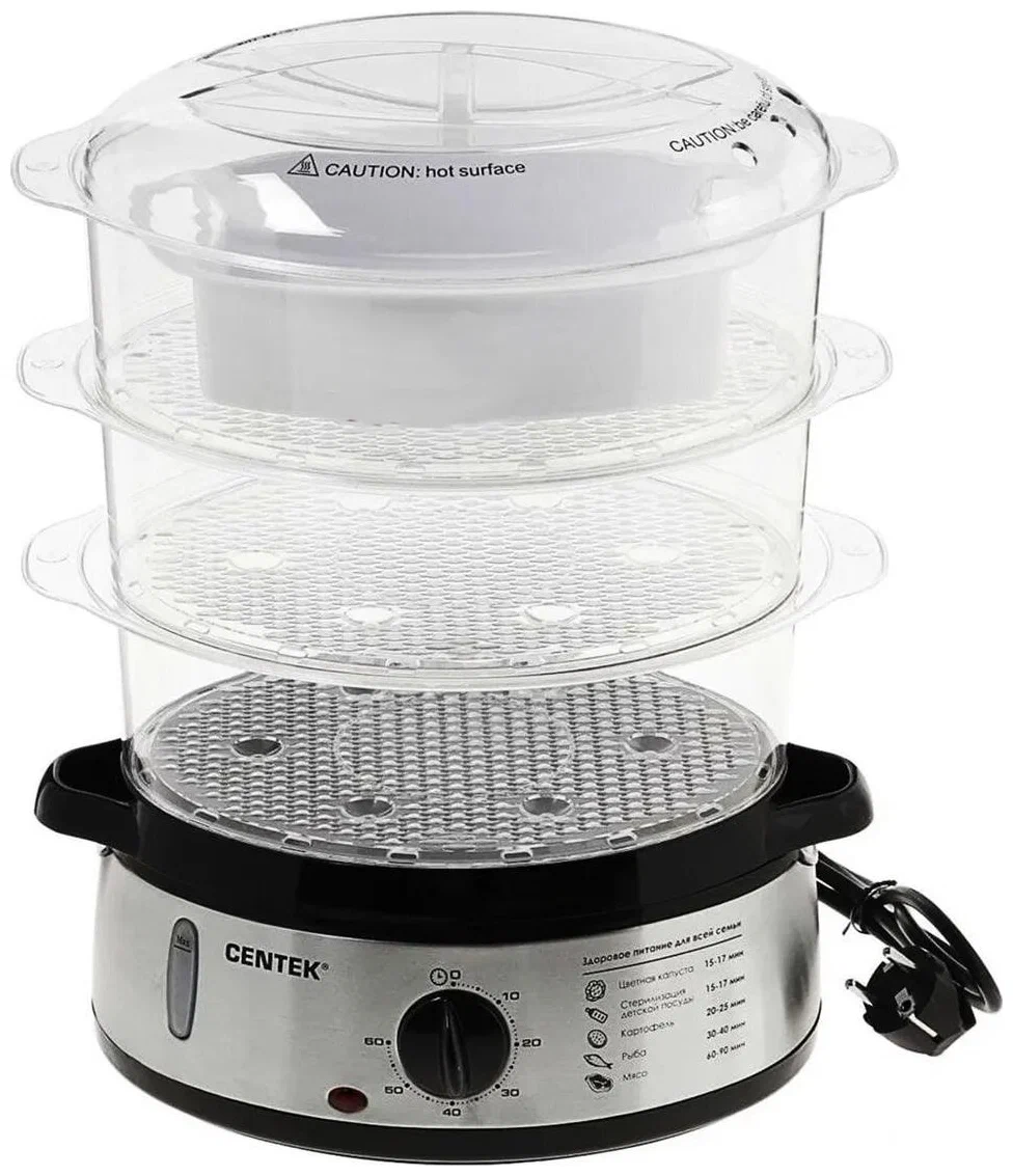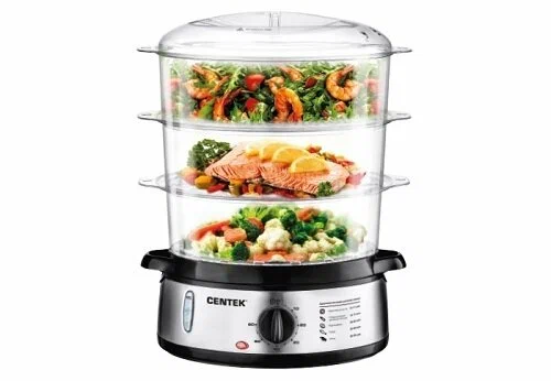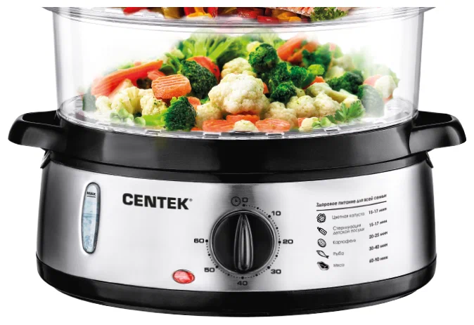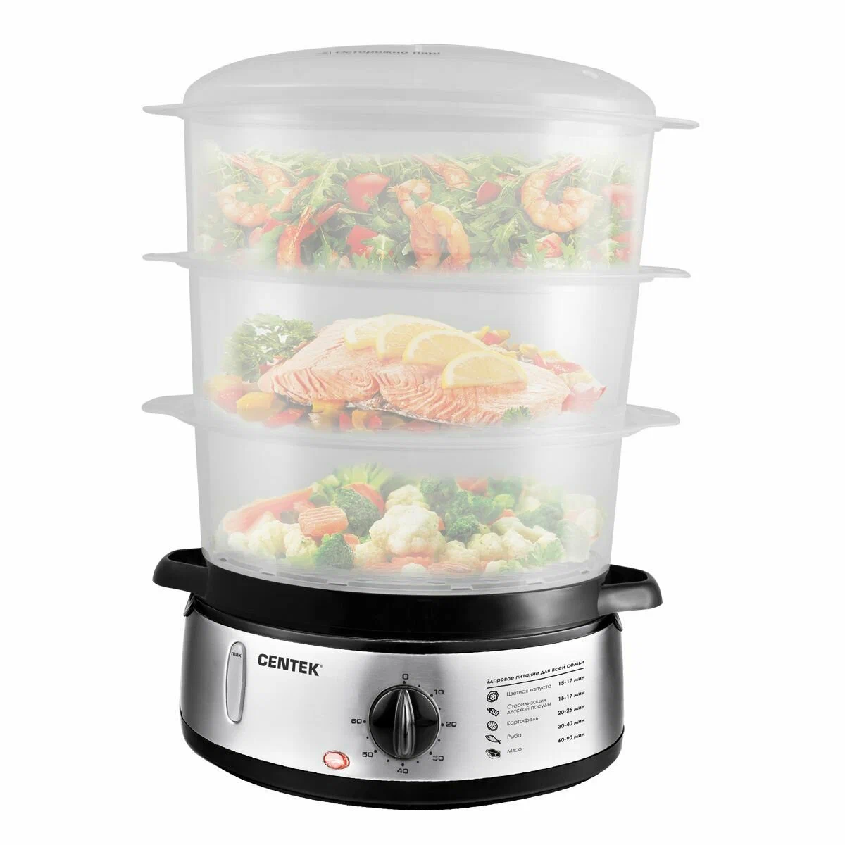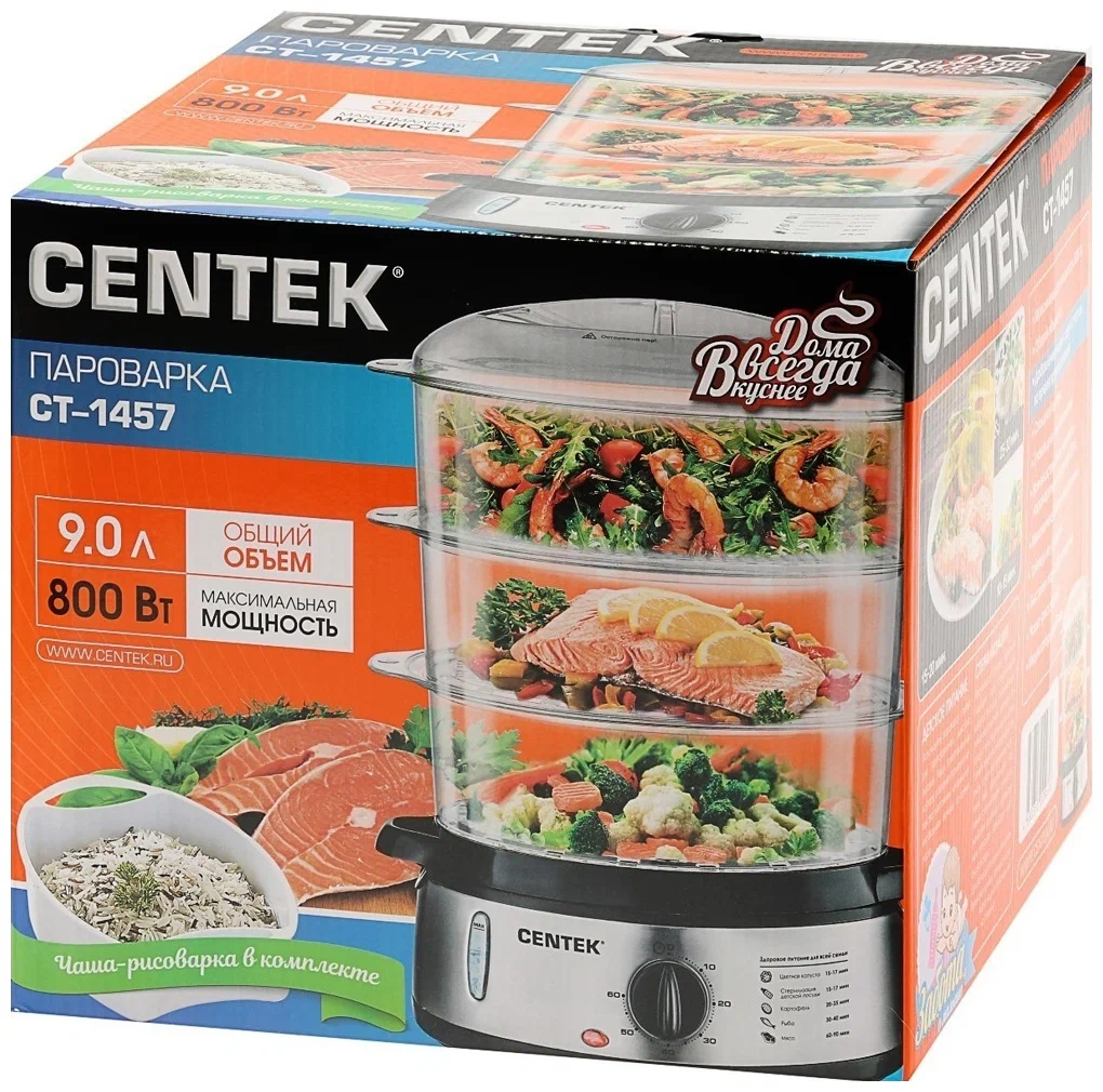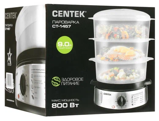 Пароварка Centek СТ-1457 для приготовления вкусной и здоровой пищи. Три чаши общим объемом 9 литров и специальная чаша для варки риса дают возможность одновременного приготовления нескольких блюд. Резервуар для воды объемом 1,2 литра имеет функцию добавления воды во время приготовления.Пароварка имеет механическое управление, при помощи которого очень просто задавать все необходимые параметры для приготовления пищи на пару. Функция таймера позволит установить желаемое время приготовления продуктов в пароварке до 60 минут, и вам не нужно будет контролировать ее работу вплоть до момента готовности.Пароварка снабжена надежной системой защиты прибора, исключающей возможность опасных ситуаций, связанных с недостаточным количеством воды. Благодаря стальному корпусу пароварка хорошо защищена от внешних воздействий и имеет длительный срок службы.