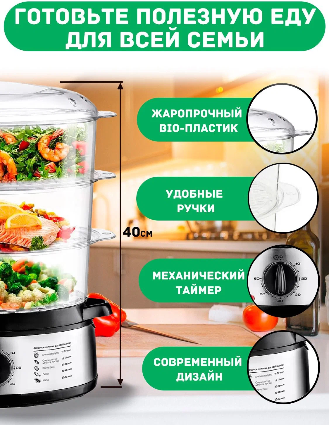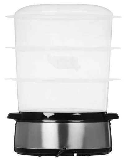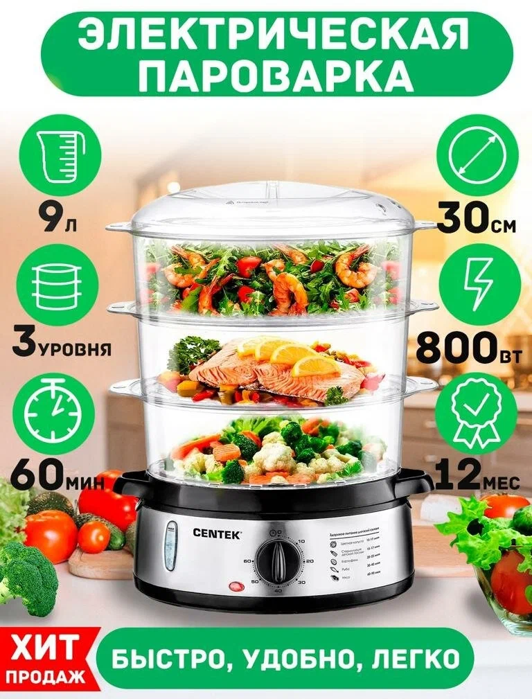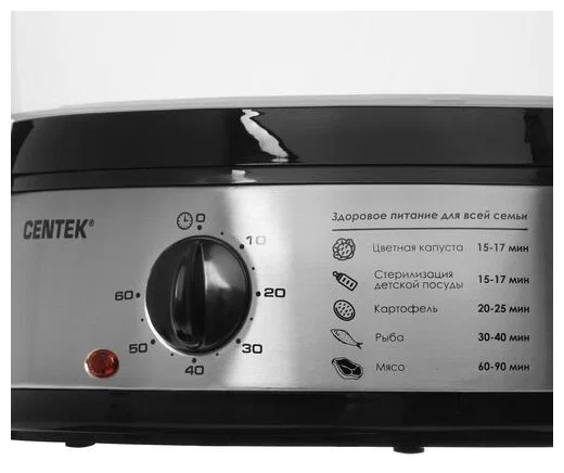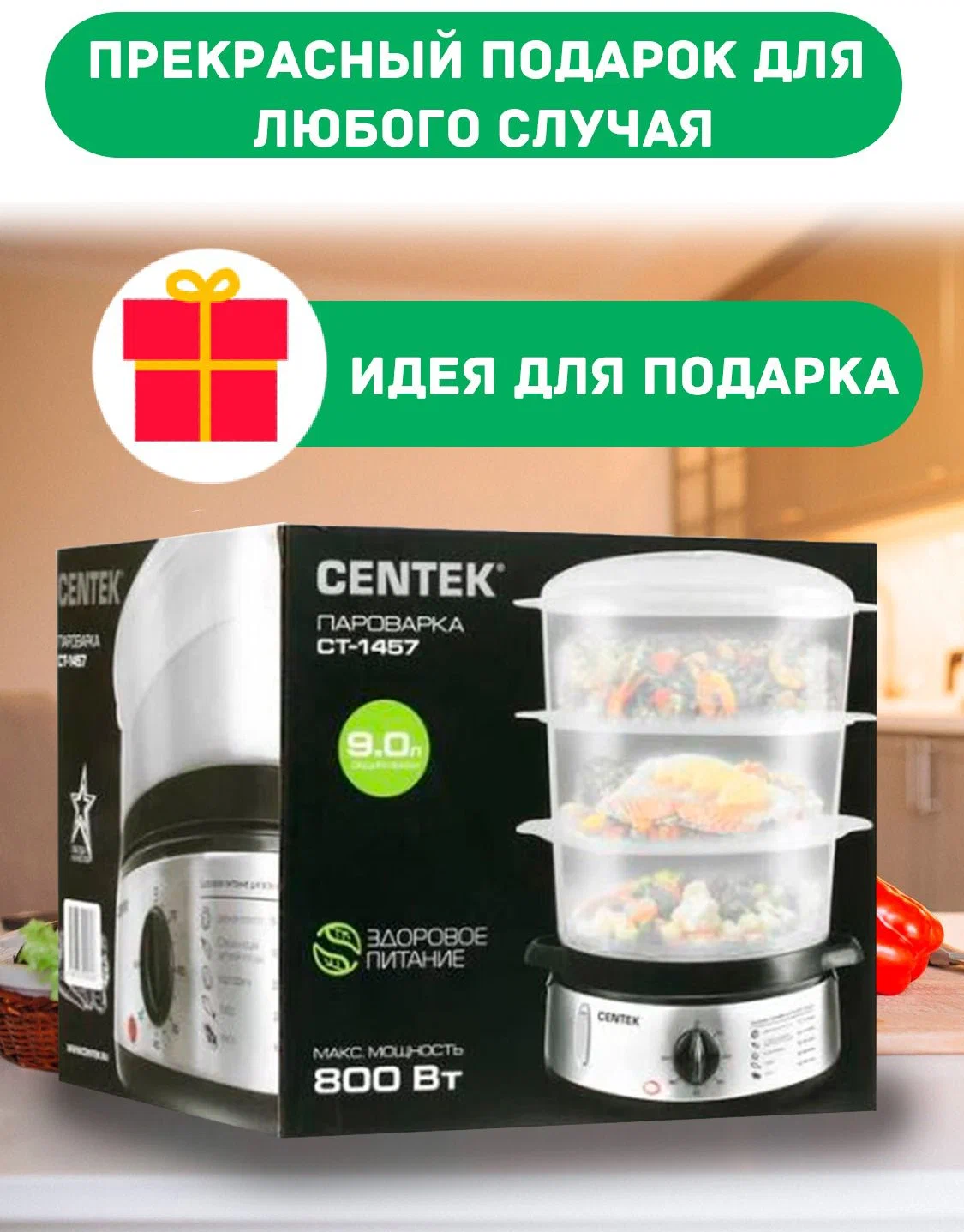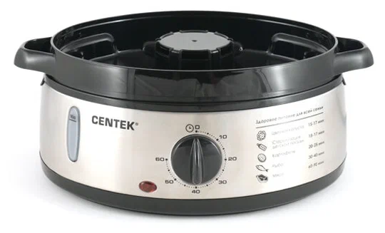 Пароварка Centek СТ-1457 для приготовления вкусной и здоровой пищи. Три чаши общим объемом 9 литров и специальная чаша для варки риса дают возможность одновременного приготовления нескольких блюд. Резервуар для воды объемом 1,2 литра имеет функцию добавления воды во время приготовления.Пароварка имеет механическое управление, при помощи которого очень просто задавать все необходимые параметры для приготовления пищи на пару. Функция таймера позволит установить желаемое время приготовления продуктов в пароварке до 60 минут, и вам не нужно будет контролировать ее работу вплоть до момента готовности.Пароварка снабжена надежной системой защиты прибора, исключающей возможность опасных ситуаций, связанных с недостаточным количеством воды. Благодаря стальному корпусу пароварка хорошо защищена от внешних воздействий и имеет длительный срок службы.