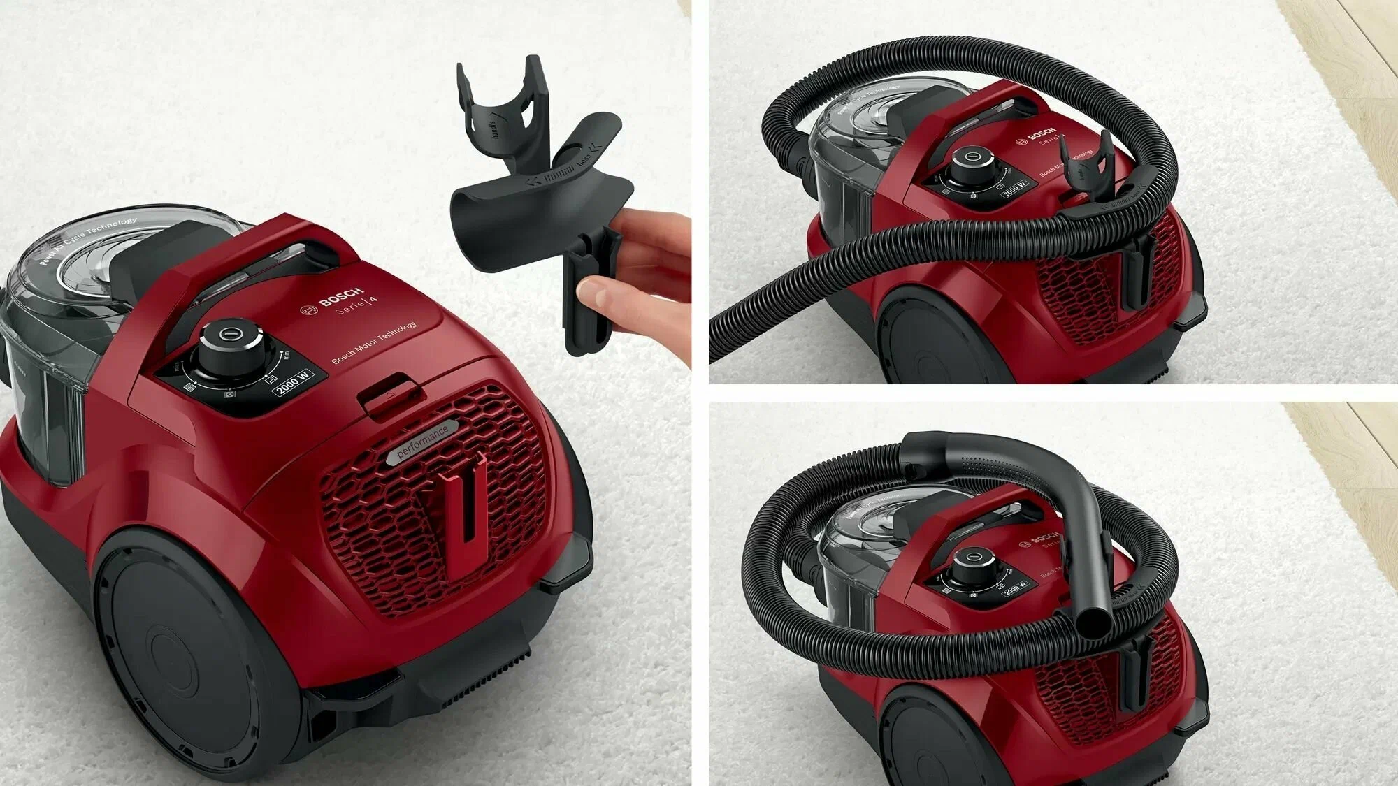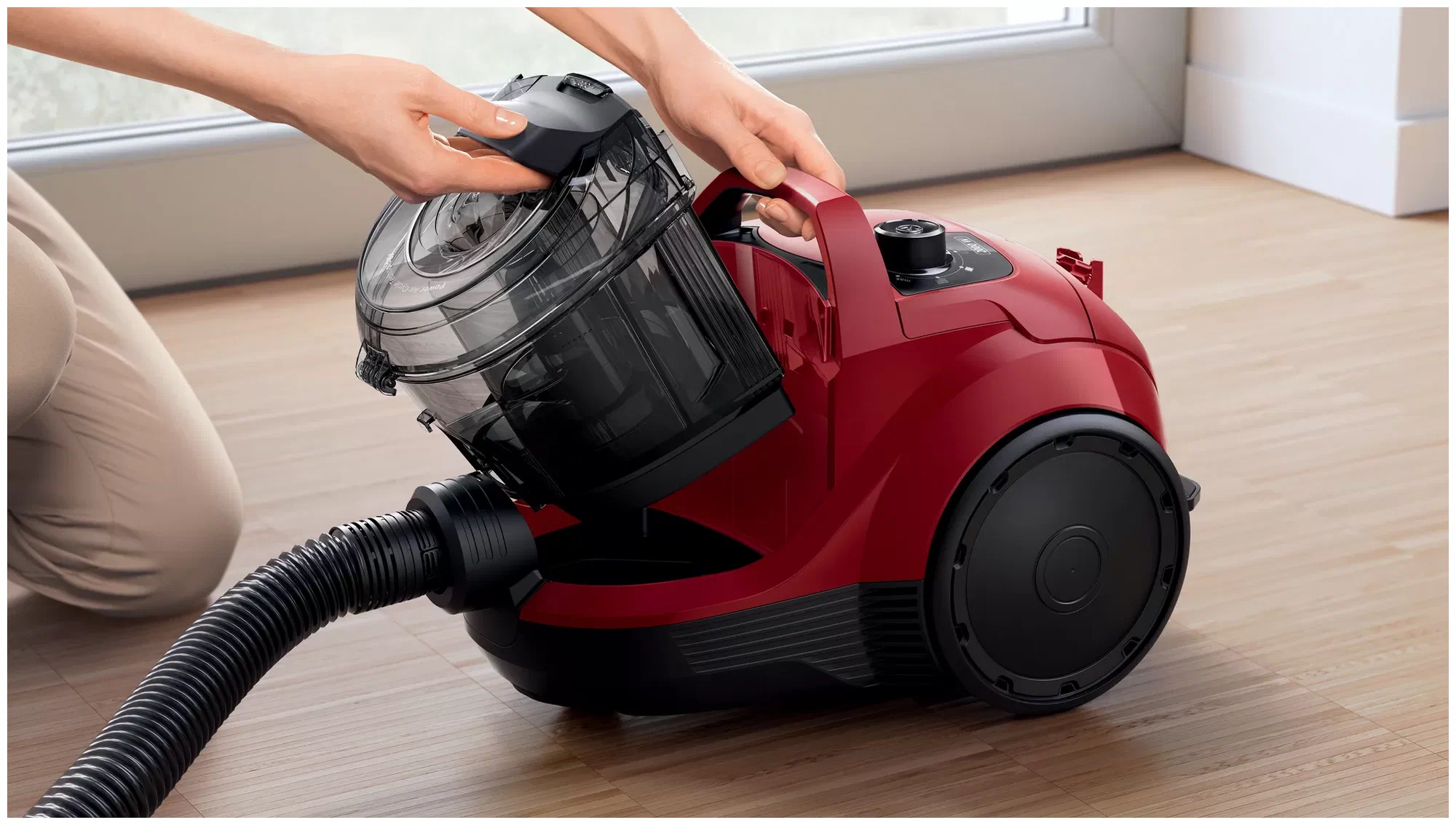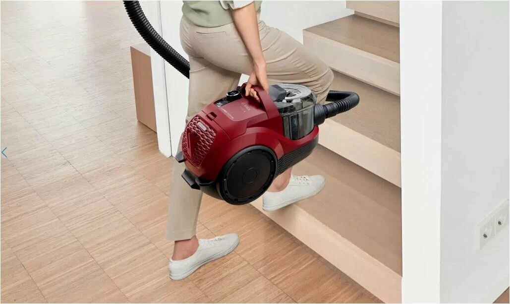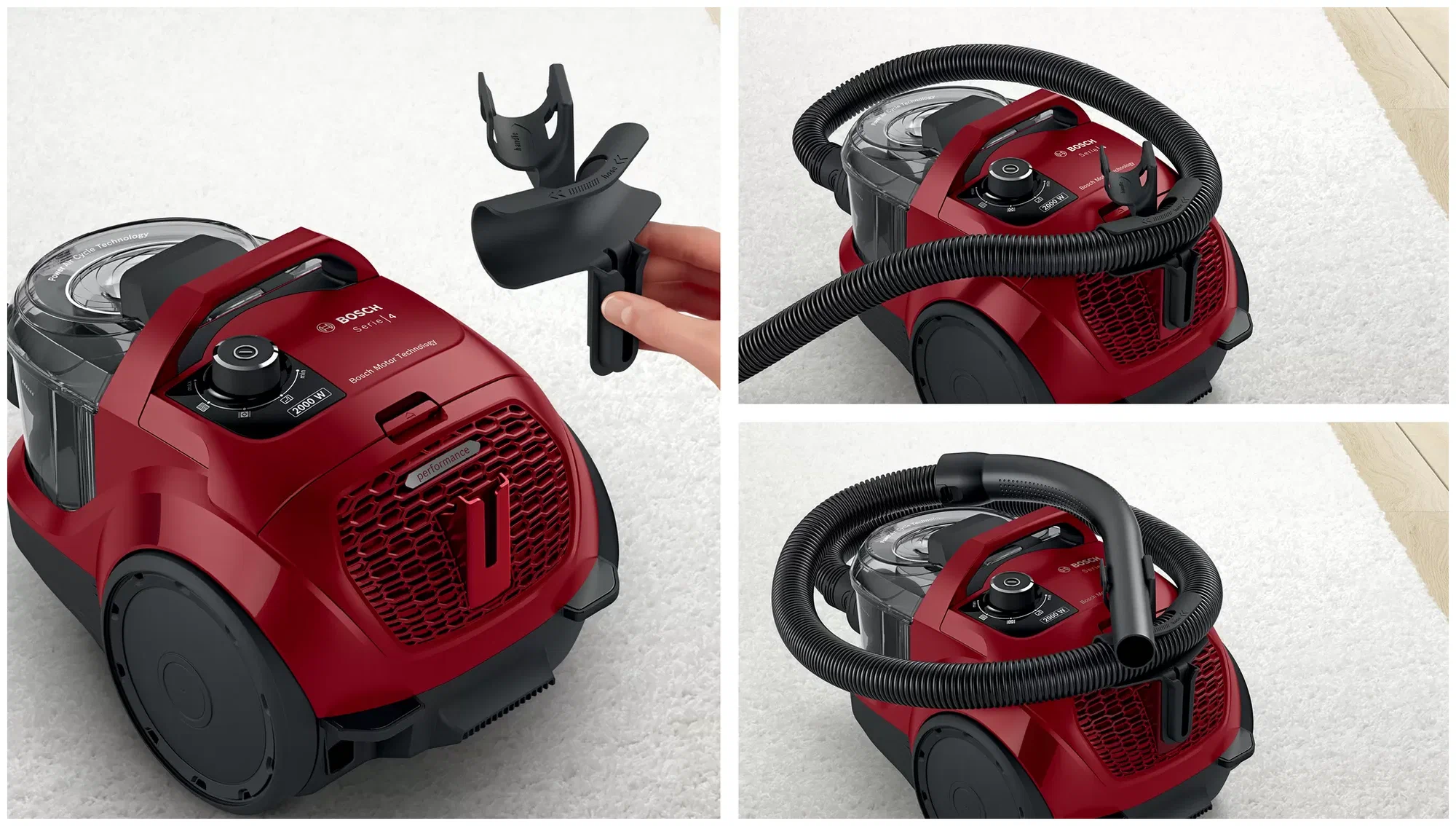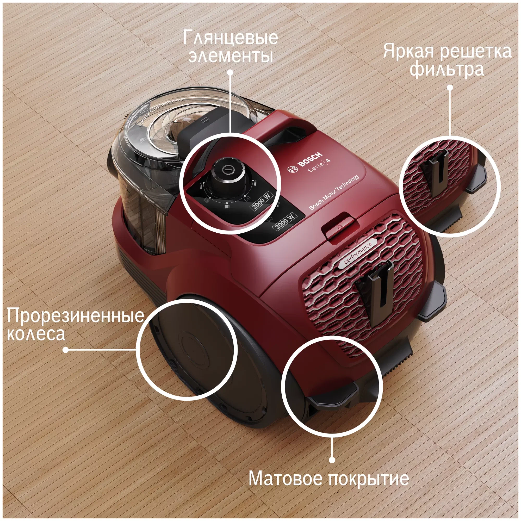 Пылесос Bosch BGS21WX200 оформлен в компактном корпусе красного цвета и содержит большие колеса для легкого перемещения. Для сбора мусора предусмотрен контейнер объемом 2 л, который легко вынимается из корпуса при помощи ручки. Особенность аппарата в эффективной очистке воздуха: на выходе воздух чище, чем в помещении. Это обеспечивает система фильтрации, представленная моющимся фильтром и тонкой очистки HEPA.Вихревые потоки отсеивают мусор на 3 уровнях, что позволяет пылесосу Bosch BGS21WX200 оптимизировать сбор мусора. Обладая мощностью 2000 Вт, прибор предотвращает потерю производительности. Он использует телескопическую трубу с регулировкой длины, что позволяет не нагибаться в процессе уборки и уменьшает нагрузку на спину. Наряду с шнуром питания длиной 7 м труба увеличивает радиус действия до 10 м. Для автоматического сматывания шнура достаточно нажатия кнопки.При помощи насадки для мягкой мебели вы сможете ухаживать за обивкой мебели. Насадка ковер/пол эффективно уберет пыль и мусор на любых напольных покрытиях. Щелевая насадка поможет добраться до труднодоступных мест.