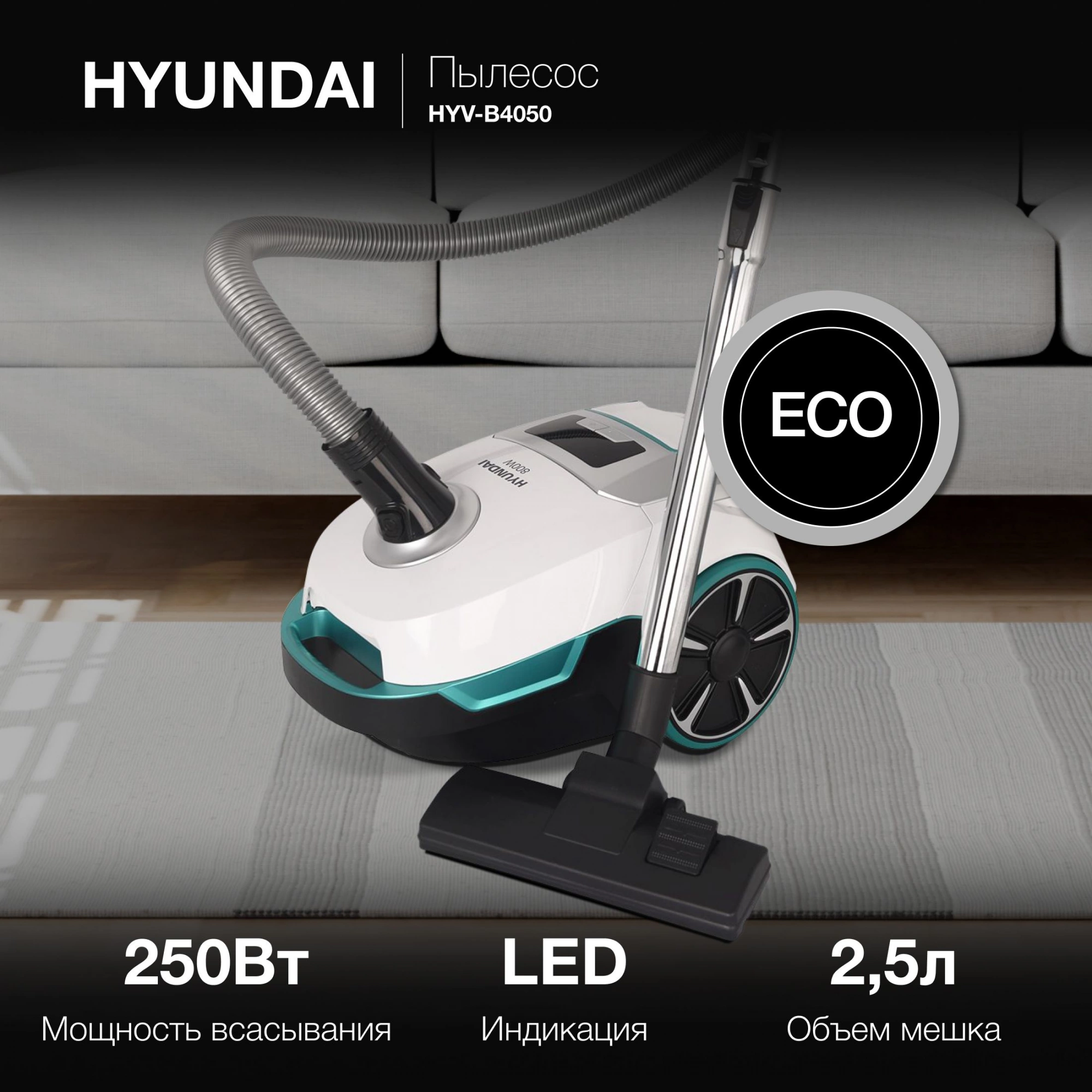 Пылесос Hyundai HYV-B4050, 800Вт белый/бирюзовый (в компл.:1мешок)