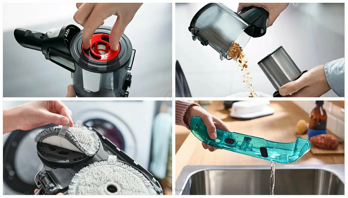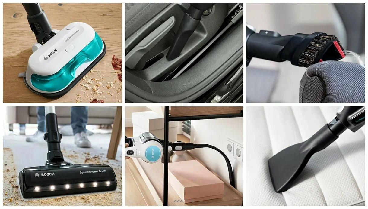 В комплекте с пылесосом идут гибкая труба, ручной пылесос и отсек для насадок. Это позволяет вам выбрать наиболее удобный способ уборки и использовать все насадки, которые идут в комплекте.