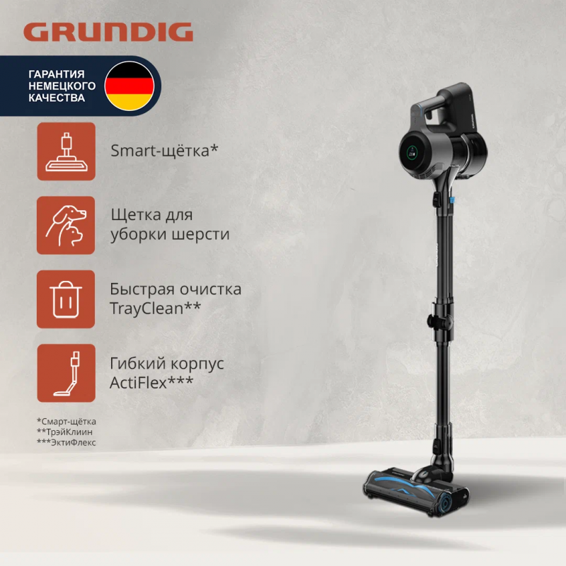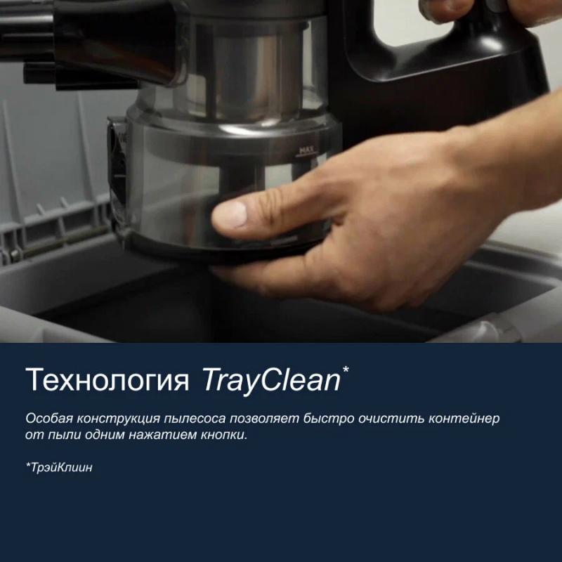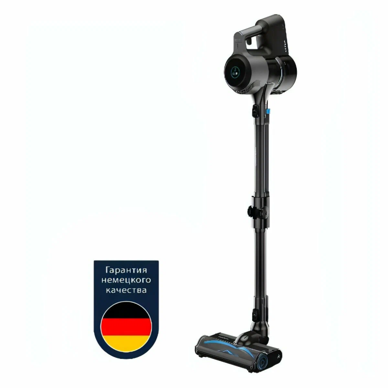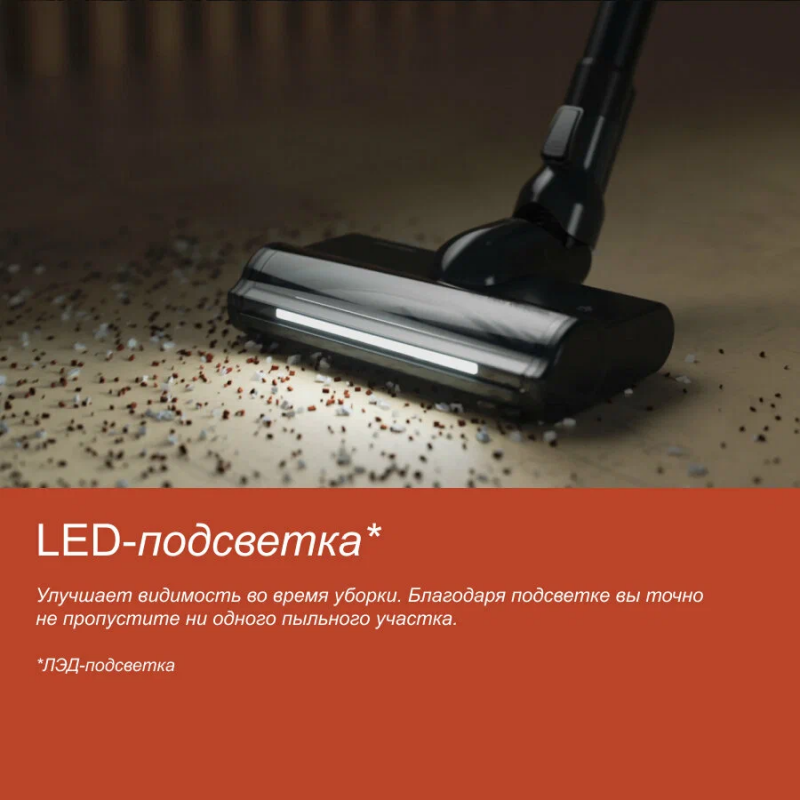Дополнительная информация: Индикация работы; Индикатор уровня зарядки; Отключение при перегреве; Индикация режима работы; Индикация разрядки аккумулятора; Циклонный фильтр; Моторный фильтр; Турбо режим; Сухая уборка; Электронное управление; Комплектация: Подставка для вертикальной у