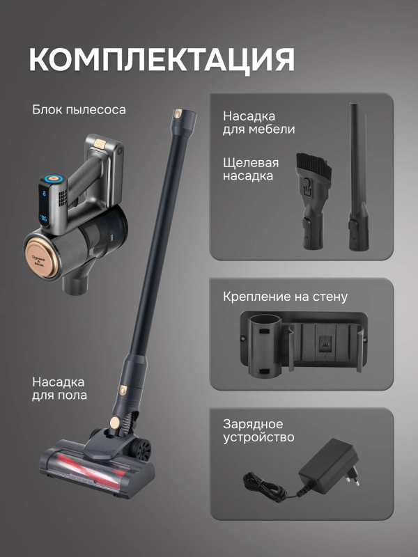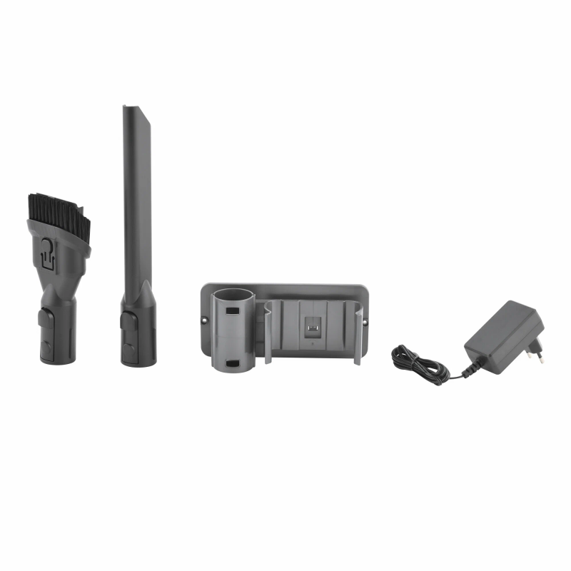 В комплекте: насадка для мягкой мебели, турбощетка, щелевая насадка, НЕРА-фильтр, аккумулятор, инструкция, крепежные элементы, крепление на стену, сетевой адаптер питания