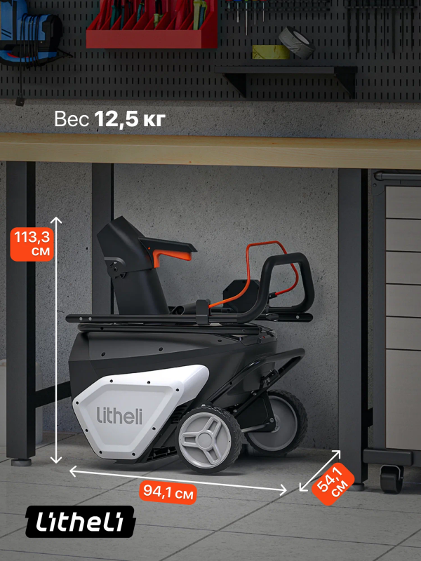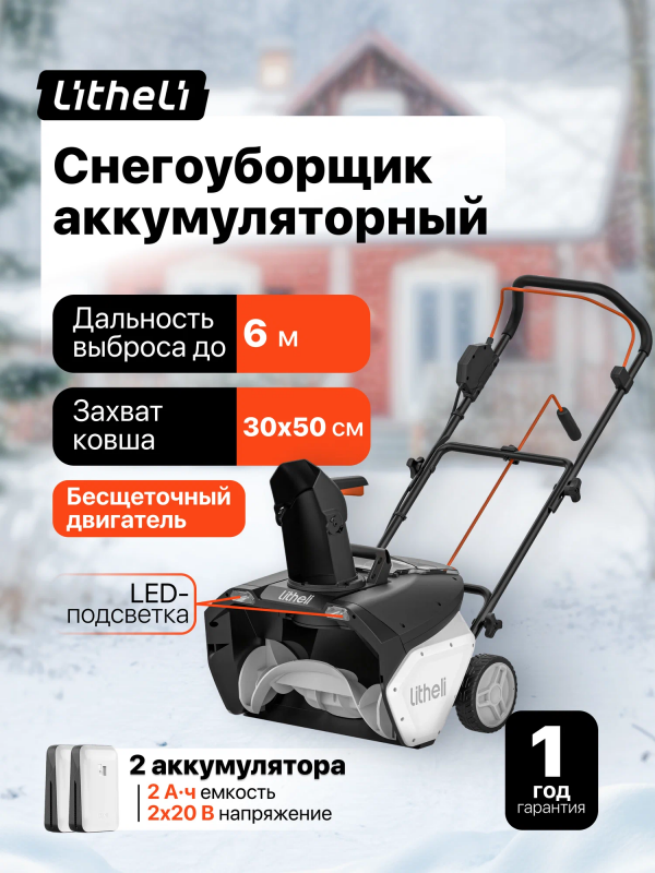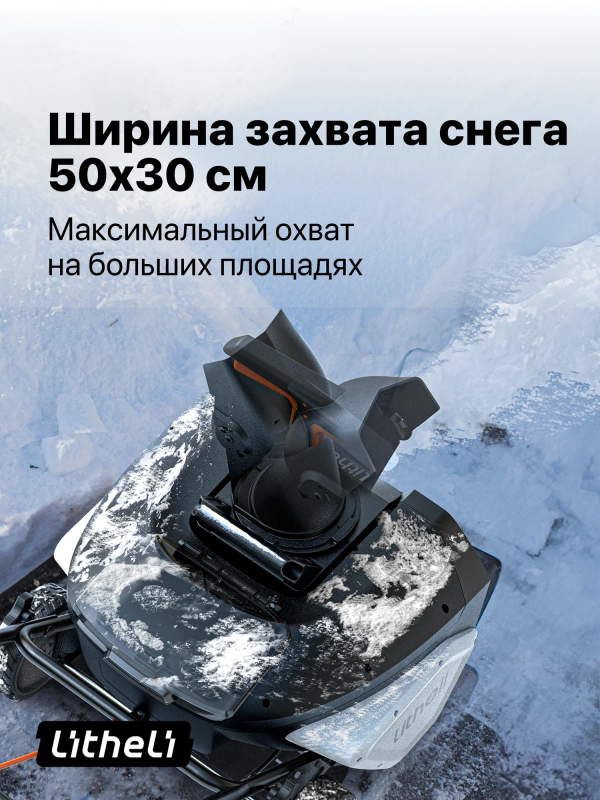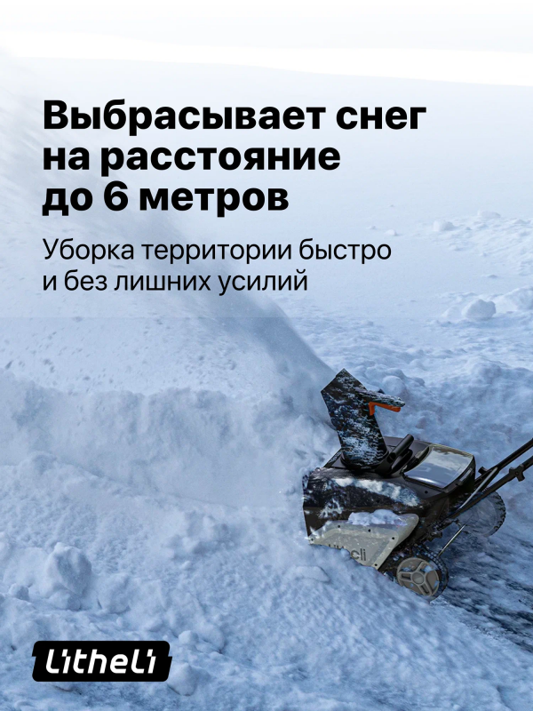 Аккумуляторный снегоуборщик Litheli оснащен двумя аккумуляторами по 2 А/ч каждый, что обеспечивает продолжительное время работы и позволяет не прерывать уборку снега на длительное время.Снегоуборщик на колесах выбрасывает снег на расстояние до 6 метров, чтобы очистить всю территорию быстро и без лишних усилий. Ширина захвата снега составляет 50.8 см, а высота — 30.48 см, что позволяет эффективно убирать снег на больших площадях.Снегоуборщик Litheli оснащен LED-подсветкой, которые как фары обеспечивают видимость в темное время суток и позволяют работать в условиях плохой видимости.Габариты снегоуборщика составляют 94.1 см в ширину, 54.1 см в длину и 113.3 см в высоту.