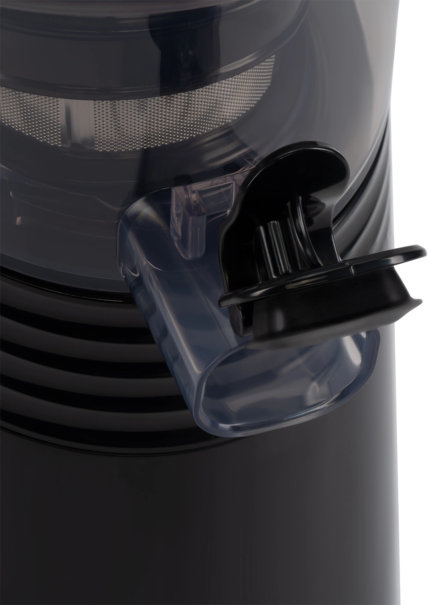 Автоматический выброс мякоти. Жмых удаляется из соковыжималки через отдельный патрубок, снабженный крышкой, которая обеспечивает возможность временного закрытия отверстия для опустошения заполненной емкости.