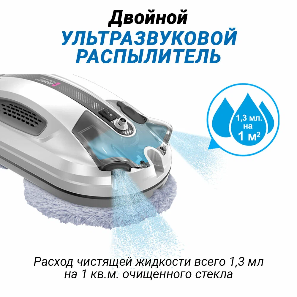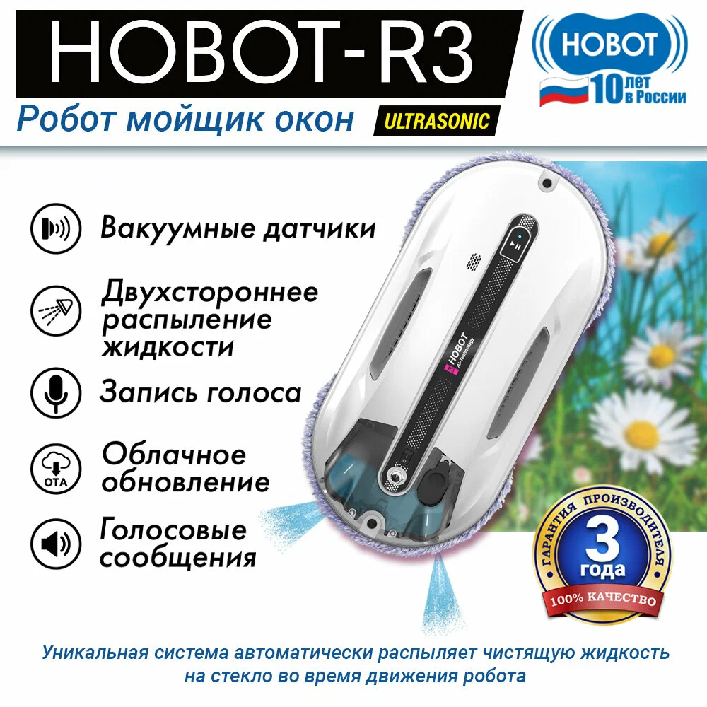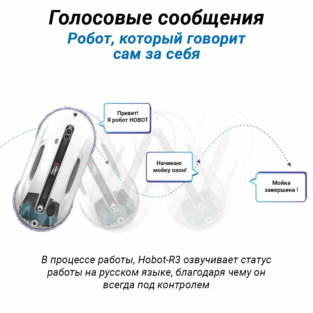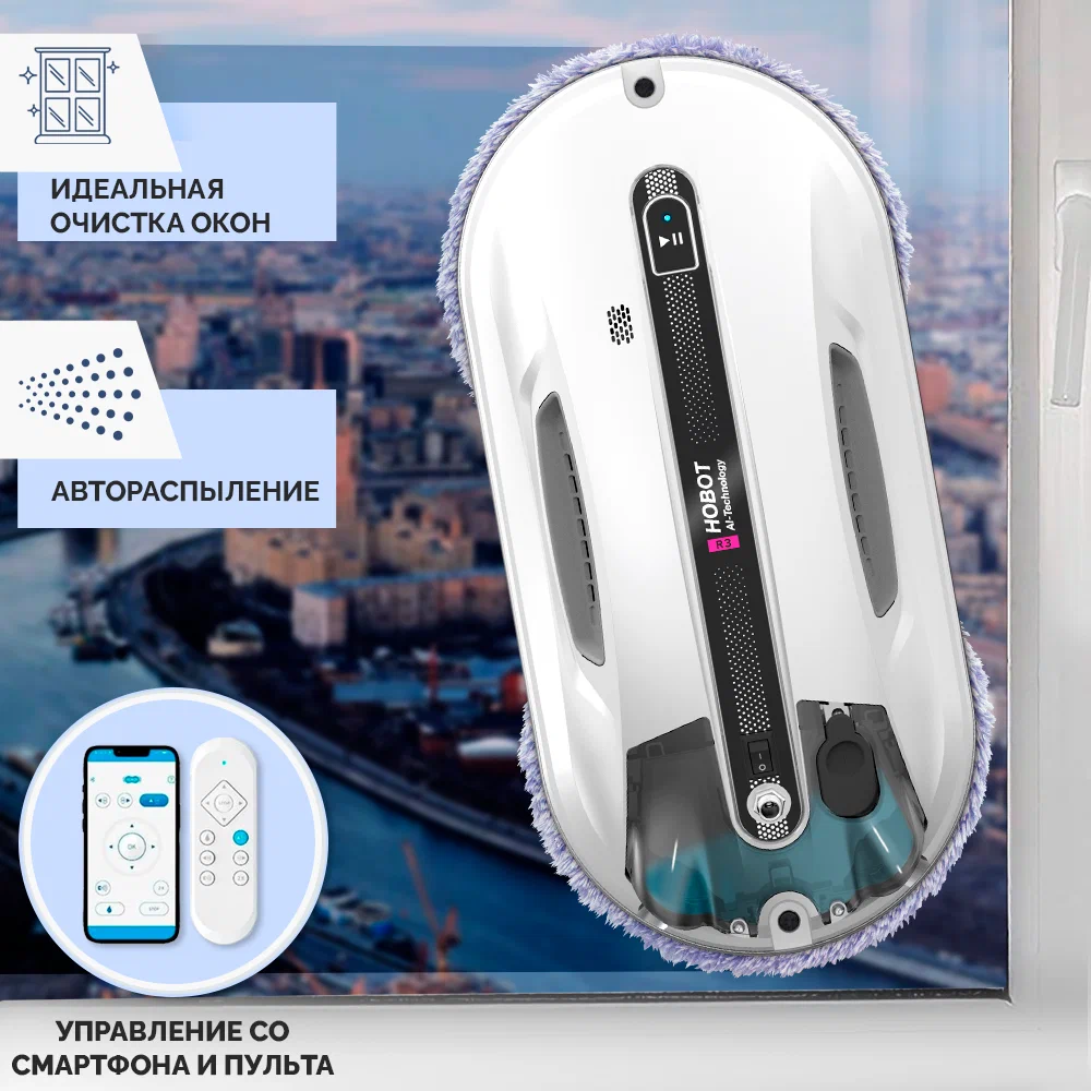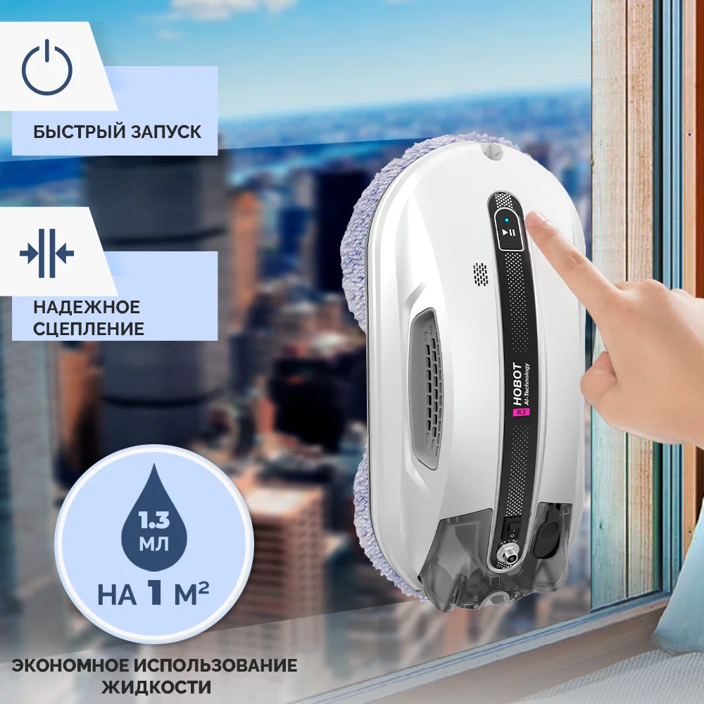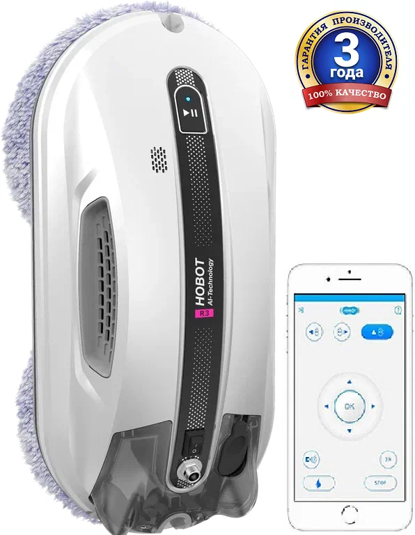 Робот-мойщик Hobot R3 Мощь, производительность и интеллект в стильном корпусе Система двойного ультразвукового распыления. Разработан с учетом коэффициента трения Превосходное сцепление благодаря предварительному распылению Пульт дистанционного управления и управление через смартфон Голосовые оповещения Creative Voice: запись голосовых сообщений Планирование маршрута на основе технологии ИИ для идеальной уборки Предназначен для очистки стекла любой толщины Новое в привычной форме Робот-мойщик окон Hobot-R3 кажется удивительно знакомым за счет своего знакомого очень стильного корпуса в приятном белом цвете. И все же перед вами полностью обновленный гаджет. У него еще более совершенная система распыления жидкости, более объемный, на 40 мл, резервуар для нее. Два встроенных сопла распыляют жидкость в две противоположные стороны. Такое решение способствует повышению качества уборки, а также помогает устройству надежнее крепиться к поверхности. Еще одно новшество заключается в системе изменяемых голосовых оповещений. Это значит, что владелец может сам настраивать и записывать звуковые оповещения по своему вкусу. Hrobot R3 - это сочетание удобных решений, мощного двигателя, практичных салфеток из микрофибры, надежных материалов, используемых в его конструкции. Передовые решения в виде обновленного программного обеспечения и интуитивно понятной системы управления превращают ваш Hobot-R3 в незаменимого помощника по уборке квартиры или загородного дома. Высокая степень очистки Двойное распыление жидкости Робот оборудован ультразвуковой системой, распыляющей микрочастицы небольшой плотности в две стороны. Это позволяет выполнять качественную очистку поверхностей без разводов и пятен. При этом точно контролируется расход моющего средства, чтобы использовать его экономно, но эффективно. Мощный двигатель Бесщеточный двигатель Nidec придает роботу-мойщику Hobot-R3 больше мощности. За счет этого обеспечивается надежное крепление устройства к поверхностям и качественная их очистка. При этом работа двигателя практически бесшумная, а сам он обладает долгим сроком службы. Высокая скорость очистки Мощный двигатель и вакуумный насос позволяют пылесосу достаточно быстро очищать окна и другие поверхности. Но при этом устройство остается надежно закрепленным на обрабатываемой плоскости. Запись звуковых оповещений У вас есть возможность настроить робота-мойщика по своему усмотрению. Для этого используйте функцию Creative Voice в фирменном мобильном приложении Hobot. Она предназначена для записи любых звуков и использования их вместо стандартных оповещений. Вы можете записать голосовое сообщения от своего лица или же заменить его на любой звуковой сигнал. Если вы хотите отключить звуковые сообщения, просто сделайте это с помощью приложения. Стильный вид Знакомый дизайн нового робота в приятном белом цвете завораживает своими плавными линиями, качественными современными материалами и общей стильностью корпуса и всех деталей на нем. Удобная форма Наряду с классным стилем у робота-мойщика Hobot R3 присутствует эргономичность и удобное расположение всех кнопок и креплений. Все настолько продумано, что вам будет легко всем этим пользоваться. Кнопки легко нажать и зафиксировать. В руке мойщик лежит очень удобно и надежно. Включение 1 кнопкой Чтобы запус