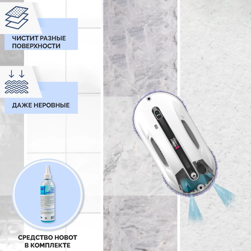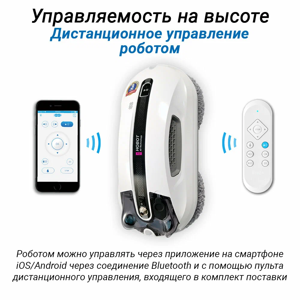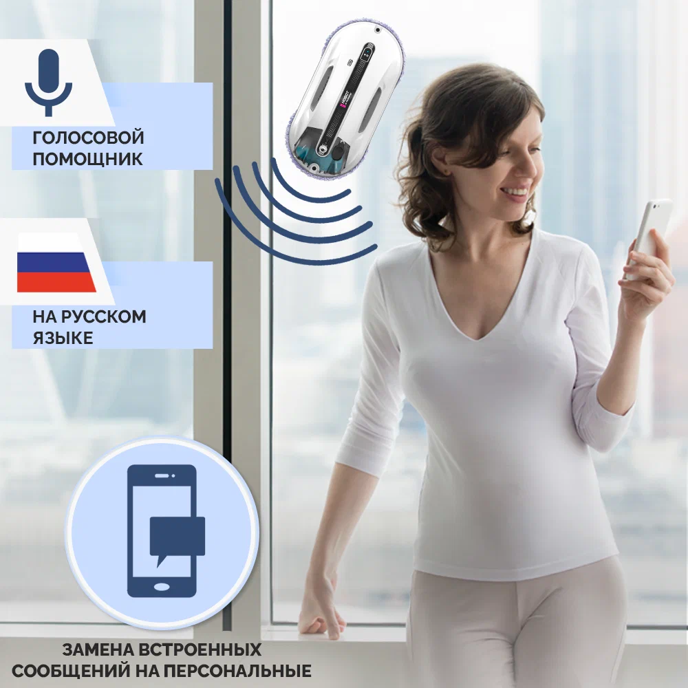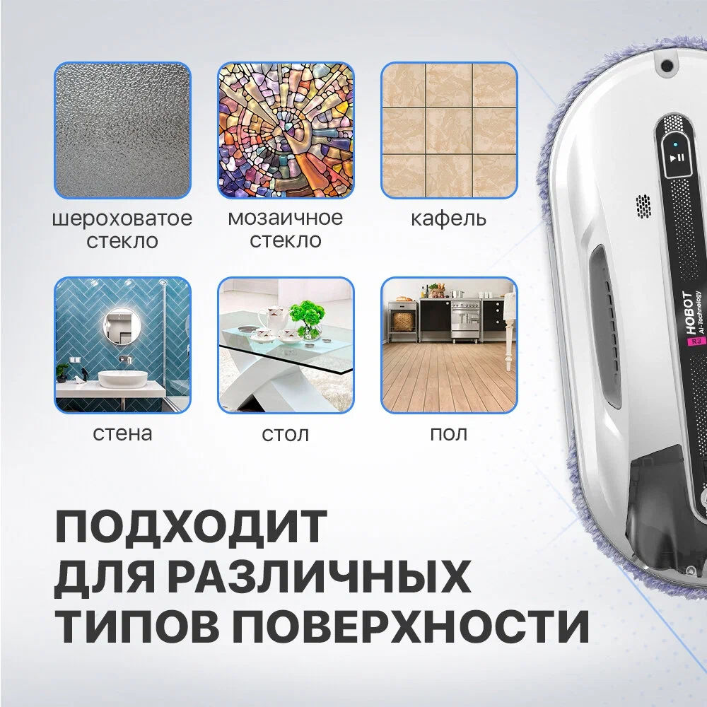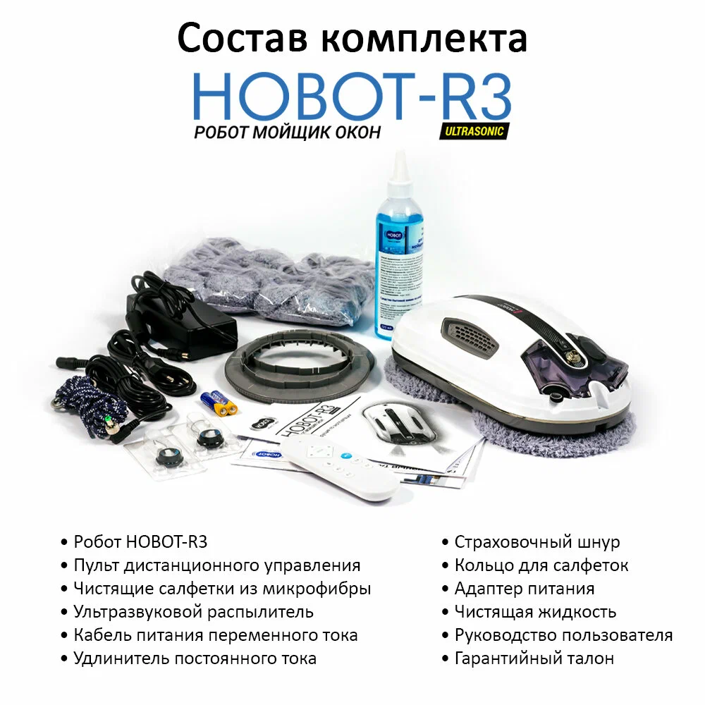 Робот-мойщик Hobot R3 Мощь, производительность и интеллект в стильном корпусе Система двойного ультразвукового распыления. Разработан с учетом коэффициента трения Превосходное сцепление благодаря предварительному распылению Пульт дистанционного управления и управление через смартфон Голосовые оповещения Creative Voice: запись голосовых сообщений Планирование маршрута на основе технологии ИИ для идеальной уборки Предназначен для очистки стекла любой толщины Новое в привычной форме Робот-мойщик окон Hobot-R3 кажется удивительно знакомым за счет своего знакомого очень стильного корпуса в приятном белом цвете. И все же перед вами полностью обновленный гаджет. У него еще более совершенная система распыления жидкости, более объемный, на 40 мл, резервуар для нее. Два встроенных сопла распыляют жидкость в две противоположные стороны. Такое решение способствует повышению качества уборки, а также помогает устройству надежнее крепиться к поверхности. Еще одно новшество заключается в системе изменяемых голосовых оповещений. Это значит, что владелец может сам настраивать и записывать звуковые оповещения по своему вкусу. Hrobot R3 - это сочетание удобных решений, мощного двигателя, практичных салфеток из микрофибры, надежных материалов, используемых в его конструкции. Передовые решения в виде обновленного программного обеспечения и интуитивно понятной системы управления превращают ваш Hobot-R3 в незаменимого помощника по уборке квартиры или загородного дома. Высокая степень очистки Двойное распыление жидкости Робот оборудован ультразвуковой системой, распыляющей микрочастицы небольшой плотности в две стороны. Это позволяет выполнять качественную очистку поверхностей без разводов и пятен. При этом точно контролируется расход моющего средства, чтобы использовать его экономно, но эффективно. Мощный двигатель Бесщеточный двигатель Nidec придает роботу-мойщику Hobot-R3 больше мощности. За счет этого обеспечивается надежное крепление устройства к поверхностям и качественная их очистка. При этом работа двигателя практически бесшумная, а сам он обладает долгим сроком службы. Высокая скорость очистки Мощный двигатель и вакуумный насос позволяют пылесосу достаточно быстро очищать окна и другие поверхности. Но при этом устройство остается надежно закрепленным на обрабатываемой плоскости. Запись звуковых оповещений У вас есть возможность настроить робота-мойщика по своему усмотрению. Для этого используйте функцию Creative Voice в фирменном мобильном приложении Hobot. Она предназначена для записи любых звуков и использования их вместо стандартных оповещений. Вы можете записать голосовое сообщения от своего лица или же заменить его на любой звуковой сигнал. Если вы хотите отключить звуковые сообщения, просто сделайте это с помощью приложения. Стильный вид Знакомый дизайн нового робота в приятном белом цвете завораживает своими плавными линиями, качественными современными материалами и общей стильностью корпуса и всех деталей на нем. Удобная форма Наряду с классным стилем у робота-мойщика Hobot R3 присутствует эргономичность и удобное расположение всех кнопок и креплений. Все настолько продумано, что вам будет легко всем этим пользоваться. Кнопки легко нажать и зафиксировать. В руке мойщик лежит очень удобно и надежно. Включение 1 кнопкой Чтобы запус