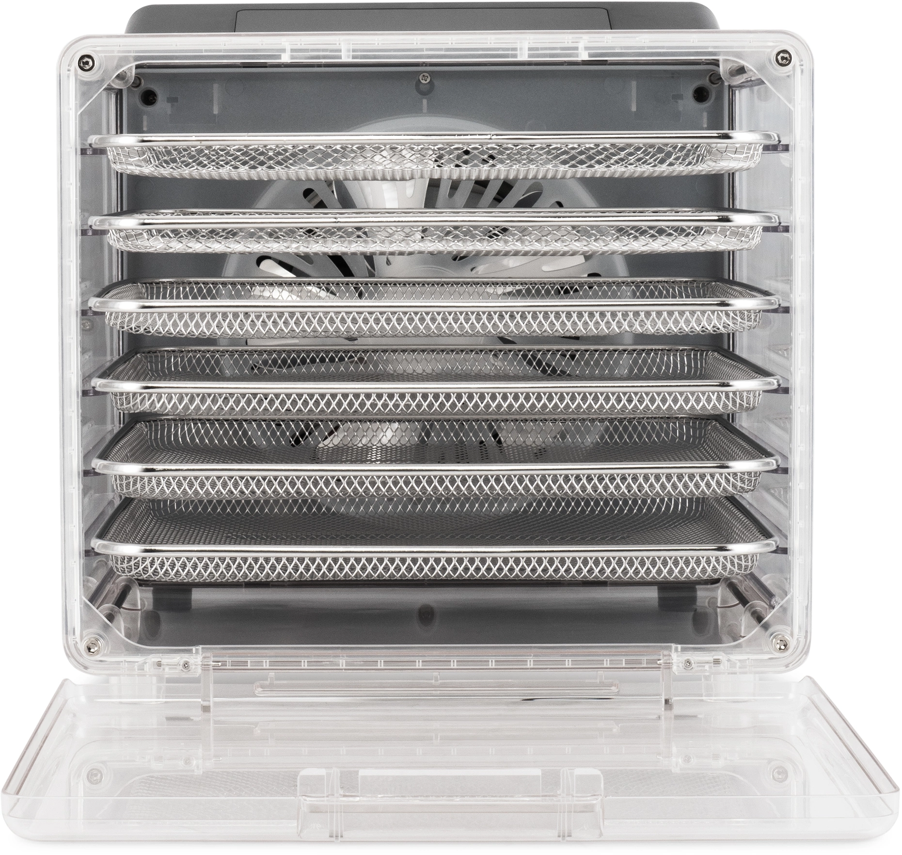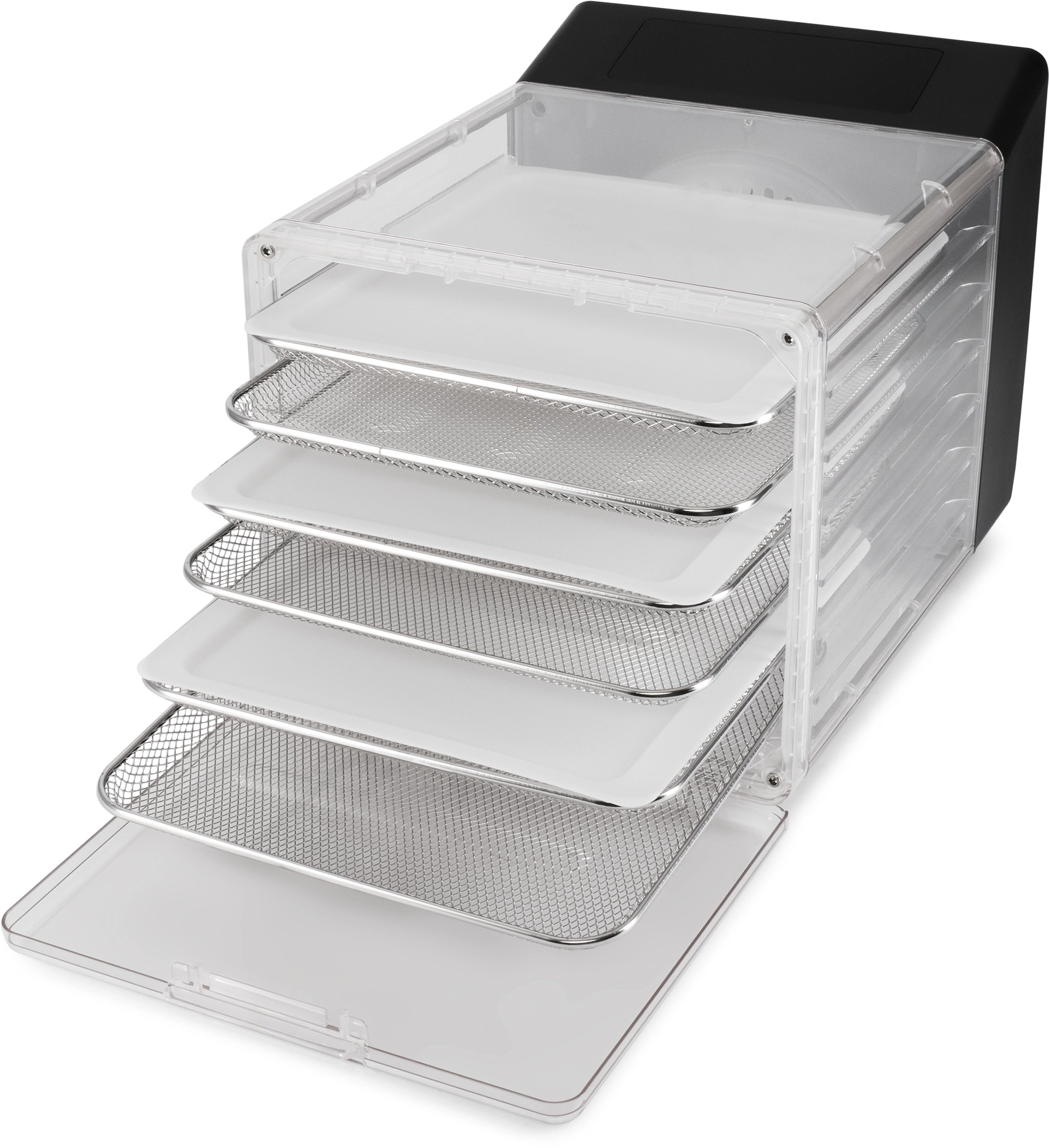Особенности: Разборный корпус для компактного хранения. Прозрачный корпус для визуального контроля за сушкой. Откидная дверца для удобства загрузки и выгрузки.