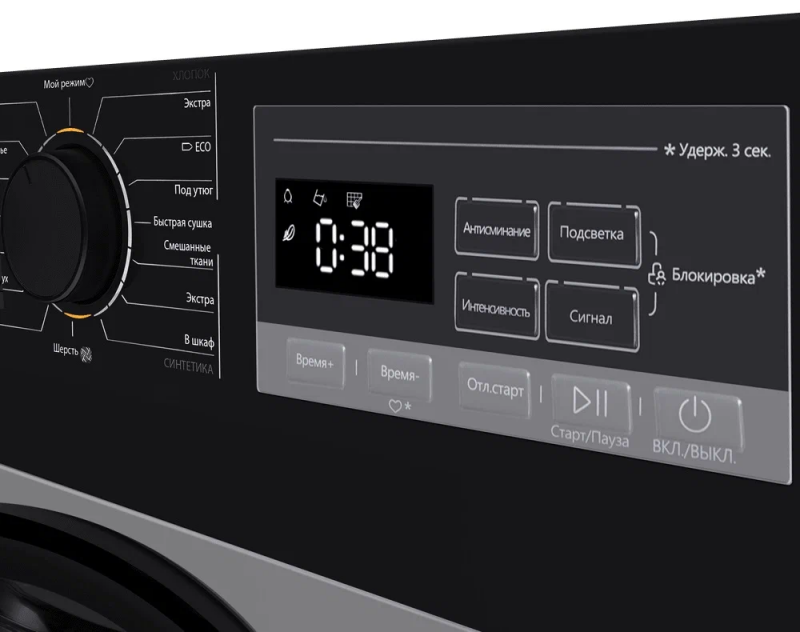 «Мой режим» позволит вам создать свою программу сушки с индивидуальными настройками: температурой, скоростью оборотов при отжиме и дополнительными функциями. Ваша уникальная программа будет сохранена и отобразится в верхнем положении регулятора, вы сможете в любой момент включить ее.