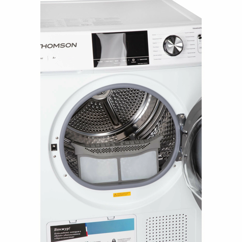 Сушильная машина с тепловым насосом Thomson TD30E10P01 создана для вашего комфорта! Она не только экономит время, но и бережно ухаживает за вещами, сохраняя их качество и мягкость. Благодаря тепловому насосу процесс сушки проходит при более низких температурах, что защищает ткани и снижает энергопотребление.Вам больше не придется беспокоиться о деликатных вещах – выбирайте подходящую программу для хлопка, смешанных тканей, шерсти, пуховых изделий, полотенец или детской одежды. Функция «Сушка на полке» позволяет безопасно высушить обувь, плюшевые игрушки и даже подушки. Выбирайте один из четырех уровней влажности:✔ Экстра – для полного высушивания и длительного хранения.✔ Стандарт – для немедленного использования.✔ В шкаф – одежда готова к размещению на полках.✔ Под утюг – для легкой глажки без лишних усилий. Дополнительные возможности для вашего удобства: Отложенный старт (3–24 часа) – запускайте сушку в удобное время. Дозагрузка вещей – забыли положить носок? Просто добавьте его в процессе! Подсветка барабана – удобство в любое время суток. Антисминание – вещи выходят из барабана без лишних заломов.УФ-стерилизация – уничтожает бактерии и аллергены, делая одежду безопасной даже для малышей. Выберите мой режим, сохраните любимые настройки и наслаждайтесь идеальным результатом! А режим «Освежить» поможет быстро удалить запахи без стирки. Сушильная машина для белья с тепловым насосом Thomson TD30E10P01 – надежный помощник, который заботится о вас и вашей одежде!