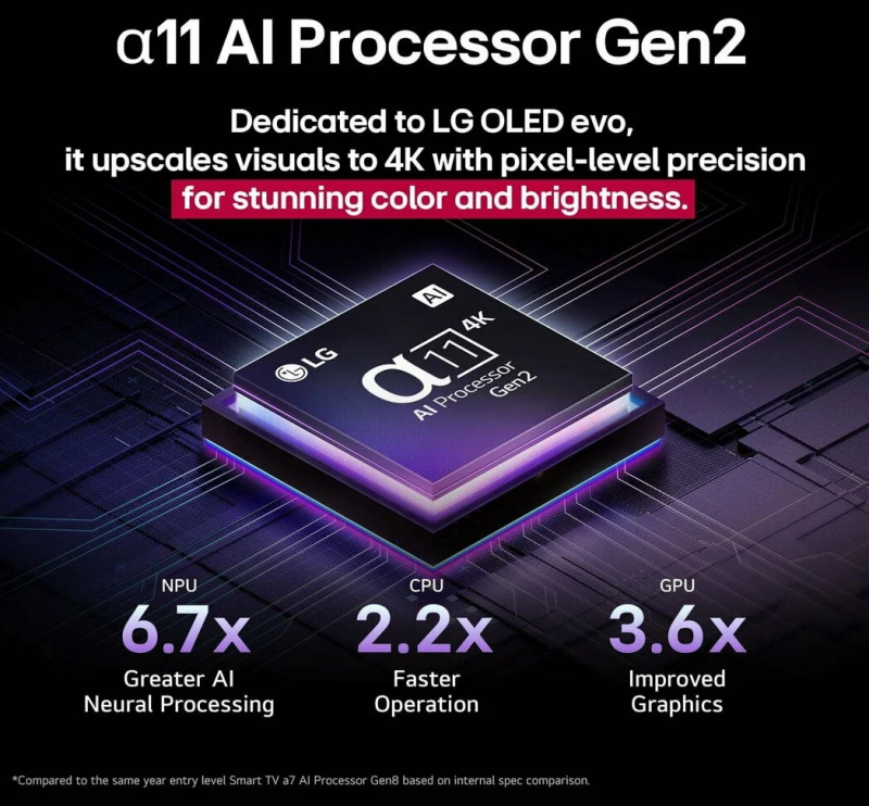 Smart TV LG OLED evo AI G5 4K 2025 годаОсобенности:Качество изображения 4K, улучшенная визуализация и объемный звук благодаря ИИ-процессору alpha 11 Gen2Настоящий черный цвет в каждом пикселе обеспечивает потрясающую контрастность, глубину и детализацию100% точность цветопередачи для реалистичных и натуральных цветов. 100% цветовой объем для более насыщенных оттенковДо 3 раз ярче изображения по сравнению с обычными телевизорами OLED TV благодаря Brightness Booster UltimateНовая кнопка ИИ, голосовое управление, функции перетаскивания на пульте AI Magic RemoteОбщие данные:Диагональ: 77"Разрешение: 3840x2160Разъемы (вход): антенныйx2, HDMIx4, USBх3, RJ45Разъемы (выход): SPDIFИзображение:Тип дисплея: 4K OLEDЧастота обновления: 120Гц (VRR 165Гц)Широкая цветовая гамма: OLED ЦветAI Управление яркостью (*AI - искусственный интеллект)AI Выбор жанра: Да (SDR/HDR)AI Изображение ProAI Масштабирование: Интеллектуальное масштабирование α11 4KАвто калибровкаТехнология затемнения: Самосветящиеся пикселиOLED Динамическое отображение тонов ProFILMMAKER MODEHDR (Расширенный динамический диапазон): Dolby Vision / HDR10 / HLGHFR (Высокая частота кадров): 4K 120 кадров в секунду (HDMI, USB)Motion (Технология обработки движений): OLED MotionРежим изображения: 10 режимаПроцессор: Интеллектуальный процессор α11 4K Gen2QFT (Быстрая транспортировка кадров)QMS (Быстрое переключение мультимедиа)Тюнеры:Аналоговый ТВ-приемДиджитал ТВ-прием: DVB-T2/T (наземное вещание), DVB-C (кабель), DVB-S2 (спутник)CI-слотSmart TV:AI ЧатботВсегда готовВеб-браузерGoogle CastGoogle Home / HubГолосовое управление без пультаHome HubИнтеллектуальное распознавание голосаLG КаналыПульт Magic Remote: В комплектеМультипросмотрОперационная система (ОС): webOS 25Приложение для удаленного управления смартфоном LG ThinQСовместимость с USB-камеройРаботает с Apple AirPlay 2Работает с Apple HomeПоддержка Bluetooth: Да (v 5.3)Wi-Fi: Да (Wi-Fi 6)Звук:AI Звук: α11 AI Sound Pro (Виртуальный 11.1.2-апмиксинг)AI Акустическая настройкаАудио кодек: AC4, AC3(Dolby Digital), EAC3, HE-AAC, AAC, MP2, MP3, PCM, WMA, apt-X (См. руководство)Аудио выход: 60ВтBluetooth Surround Ready: Да (2-стороннее воспроизведение)Чистый голос Pro: Да (AI Object Remastering)Dolby AtmosLG Синхронизация звукаОдновременный вывод звукаЗвуковой режимНаправление динамика: ВнизАкустическая система: 4.2 КаналаПоддержка WiSA: Да (увеличение до 2.1 канала)WOW-оркестрИгровой режим:Оптимизатор игр: Да (Игровая панель)ALLM (Автоматический режим с низкой задержкой)Dolby Vision для гейминга (4K 120 Гц)Совместимость с FreeSync (AMD)Совместимость с G-Sync (Nvidia)Режим HGIGВремя отклика: менее 0,1 мсVRR (Переменная частота обновления): Да (до 165Гц)Дополнительная информация:HDMI Обратный звуковой канал: eARC (HDMI 2)HDMI-вход: поддержка 4K 120Гц, eARC, VRR, ALLM, QMS, QFT (4 порта)Simplink (HDMI CEC)Размеры телевизора без подставки (ШхВхГ): 1712 x 982 x 24.8 ммТумба под ТВ (ШхГ): 501 x 321 ммВес телевизора без подставки: 33.6 кгКрепление на стену VESA (мм): 300x300Внимание: крепление в комплект не входит и приобретается отдельно!