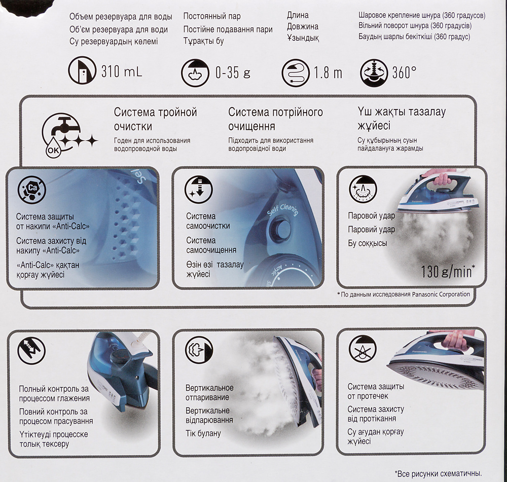 Тип: Утюг Бренд: PANASONIC Модель: NI-W900CMTW PartNumber/Артикул Производителя: NI-W900CMTW Цвет: белый Дополнительный цвет: голубой Мощность: 2400 Вт Функция пароувлажнения: ДА Производительность подачи пара: 35 г/мин Паровой удар: 130 г Емкость для воды: 310 мл Вертикальное отпаривание: ДА Распылитель воды: ДА Шарнирное крепление шнура: ДА Самоочистка от накипи: ДА Цвет утюга: белый/голубой Длина упаковки (ед): 0.337 м Ширина упаковки (ед): 0.156 м Высота упаковки (ед): 0.185 м Габариты упаковки (ед) ДхШхВ: 0.337x0.156x0.185 м Вес упаковки (ед): 1.917 кг Объем упаковки (ед): 0.00972582 м3