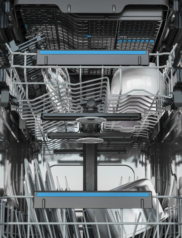 Внутренняя конструкция: корзина для столовых приборов, полки для кружек, регулируемая по высоте корзина для посуды