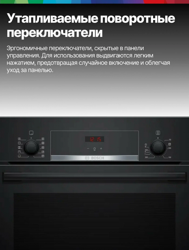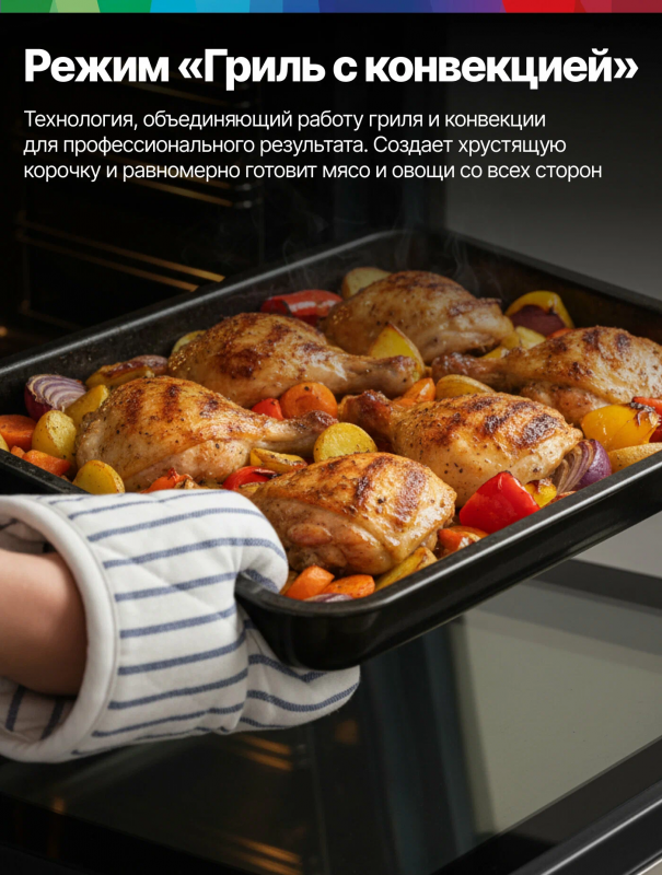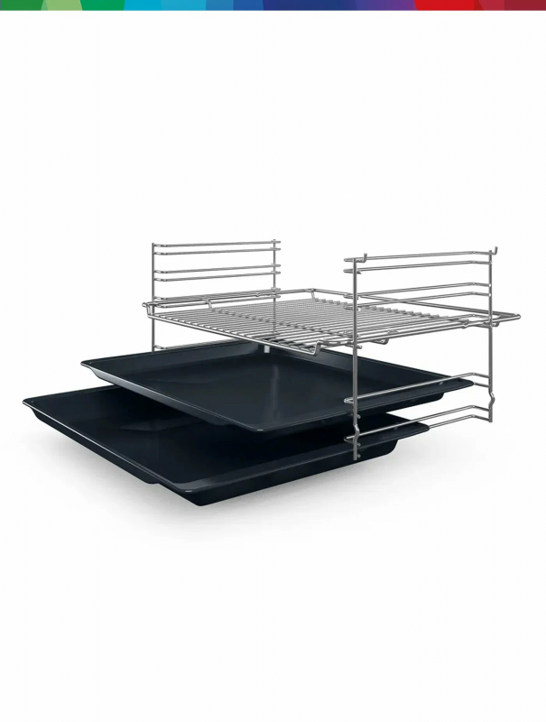 Внутренний объём 66 л открывает широкие возможности для приготовления разнообразных блюд: большие противни и решётка помещаются свободно, а универсальный комплект аксессуаров включает комбинированную решётку, эмалированный и универсальный противень. Электронное управление реализовано через LED-дисплей и сенсорные поворотные элементы, которые обеспечивают быстрый выбор режима и точную настройку температуры в диапазоне от 50 до 275 ºC. Встроенные электронные часы с таймером упрощают планирование процесса тепловой обработки, а блокировка от детей добавляет уверенности при эксплуатации в семьях с ребёнком.