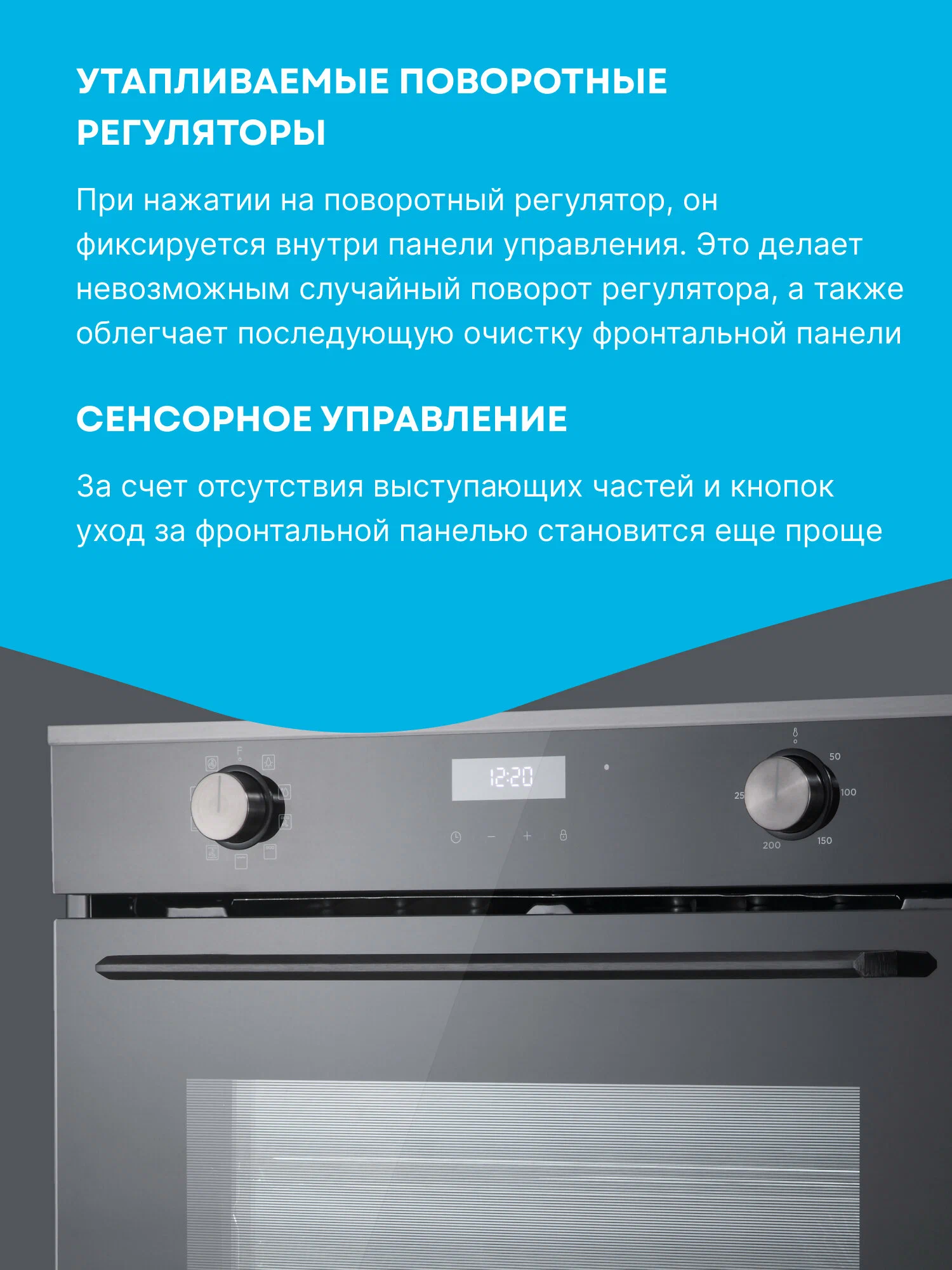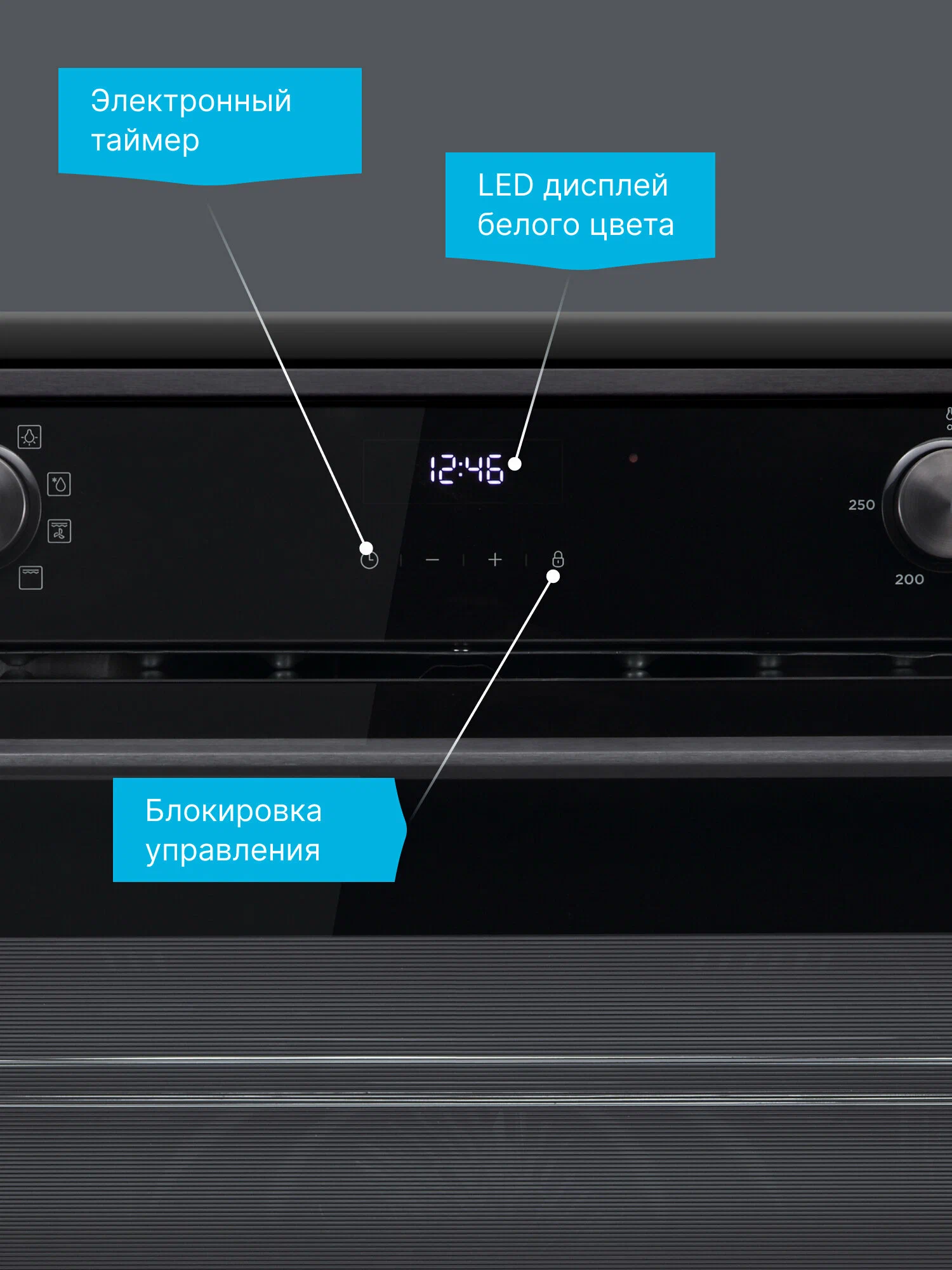 - Управление духовкой: Дисплей, Таймер, Утапливаемые переключатели