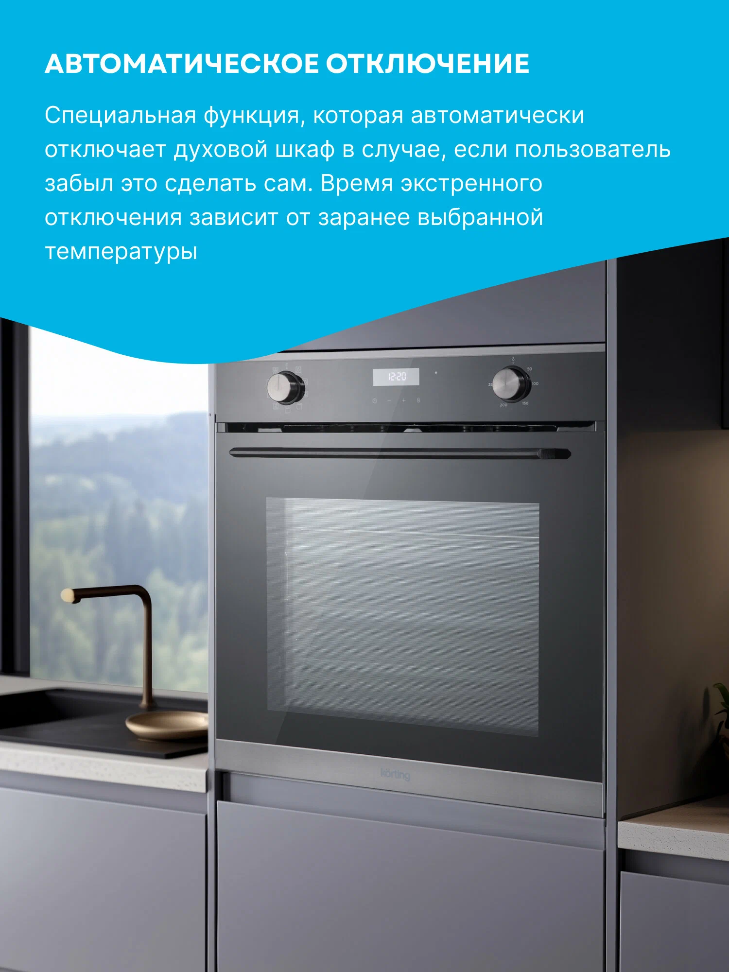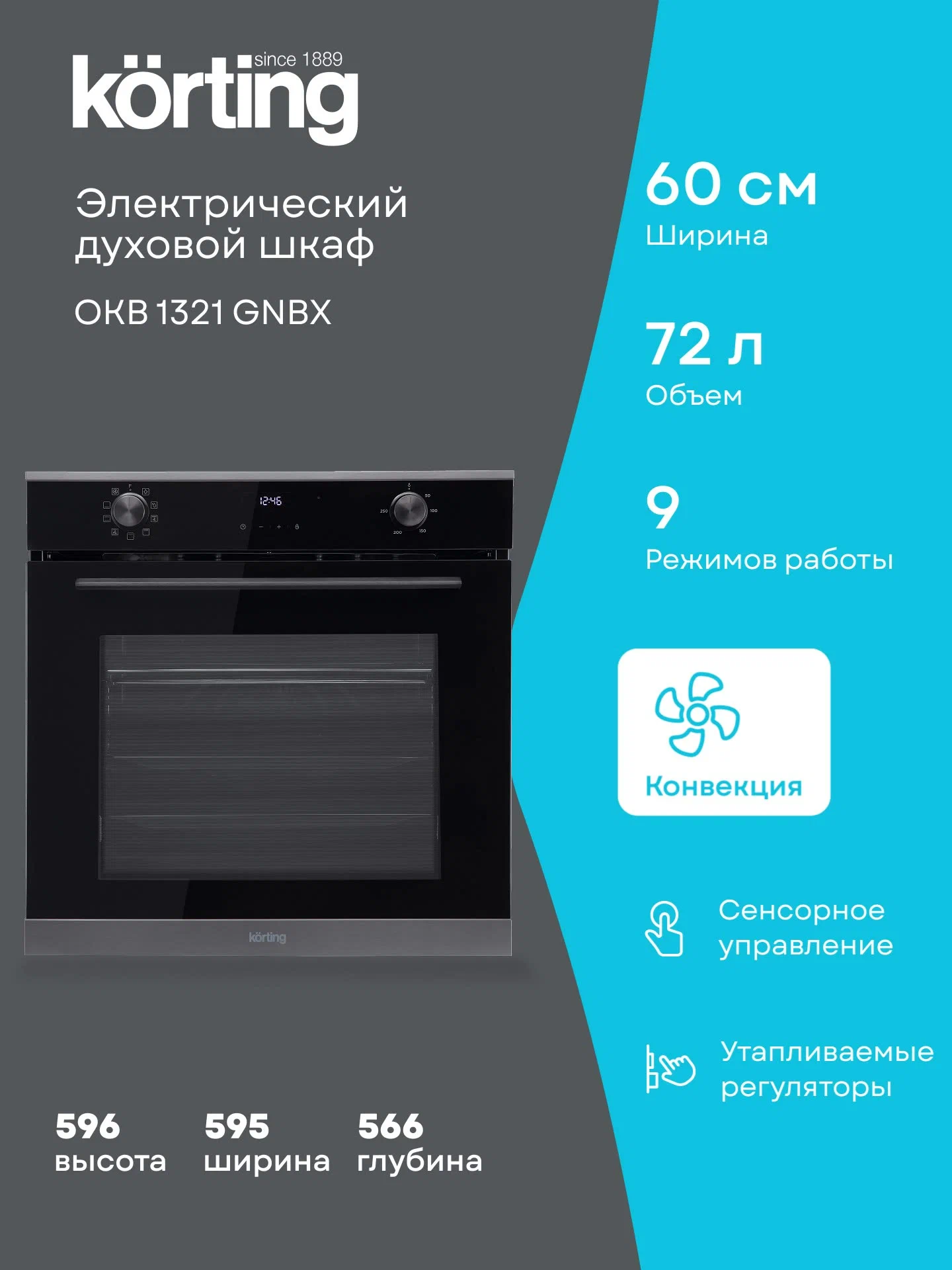 Современный дизайн. Сочетание стекла, стали и прямых, горизонтальных линий, используемых в духовых шкафах современного дизайна объединяет внешний вид кухонной мебели и бытовой техники, создавая полноценное решение в стиле хай-тек.Каталитическая самоочистка. Поверхность задней стенки покрыта специальным каталитическим веществом, самостоятельно расщепляющим загрязнения, которые оседают на поверхности в процессе приготовления. Для очистки необходимо прогреть камеру до температуры свыше 200°C, после чего все жировые загрязнения растворяются. Каталитическая панель поможет значительно меньше тратить время на очистку, а значит получать удовольствие от частого приготовления.9 режимов нагрева. Девять режимов, основанных на комбинации различных нагревательных элементов, позволяют приготовить совершенно любое блюдо, независимо от сложности его приготовления. Разнообразие возможностей поможет расширить кулинарные навыки или усовершенствовать существующие.Полностью выдвижные телескопические направляющие. Полное выдвижение телескопических направляющих позволяет увидеть продукт полностью, со всех сторон и надежно удерживать противень на любом из нескольких уровней, что дает еще больше безопасности и комфорта – противень не нужно удерживать в руках, чтобы проверить качество приготовления блюд.Автоматическое отключение. Специальная функция, которая автоматически отключает духовой шкаф в случае, если пользователь забыл это сделать сам. Время экстренного отключения зависит от заранее выбранной температуры. Можно быть полностью уверенным в безопасности приготовления.Система автоматического охлаждения. Специальный тангенциальный вентилятор установлен во всех духовых шкафах Körting. Боковые стенки духового шкафа постоянно охлаждаются благодаря циркуляции холодного воздуха. Использование системы автоматического охлаждения позволяет поддерживать температуру боковых поверхностей духового шкафа на низком уровне для безопасного использования в кухонной мебели.Гриль. Это способ приготовления пищи с помощью теплового элемента, который расположен над готовящимся блюдом. Благодаря высокой температуре пища быстро подрумянивается, приобретает красивую поджаристую корочку, оставаясь нежной и сочной внутри.Утапливаемые поворотные регуляторы. При нажатии на поворотный регулятор, он фиксируется внутри панели управления, создавая прямую и ровную поверхность. Это делает невозможным случайный поворот регулятора, а также облегчает последующую очистку фронтальной панели. Спрятать регуляторы можно даже во время приготовления.Сенсорное управление. За счет отсутствия выступающих частей и кнопок микроволновая печь выглядит намного привлекательнее. А уход за фронтальной панелью становится еще проще.Тройное остекление дверцы. Специальные материалы стекла об