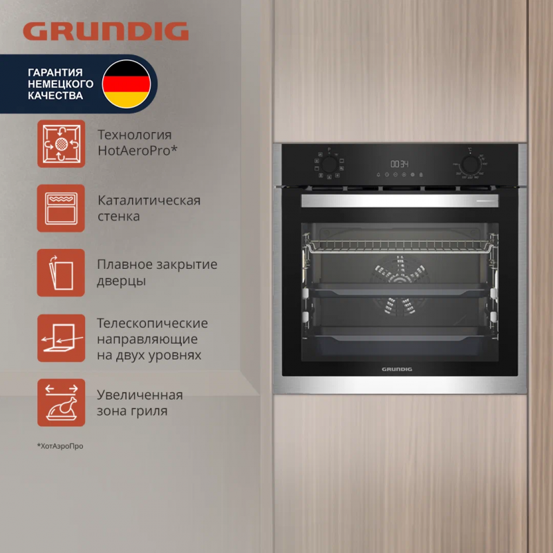 Конвекционный духовой шкаф Grundig GEBM19301BC сочетает практичную функциональность, элегантный дизайн и безупречное качество блюд. Получите новый опыт приготовления знакомых блюд вместе с технологией HotAeroPro, которая исключает подгоревшие края или непропеченный центр. А любители хрустящей корочки точно оценят увеличенную на 28% зону гриля. Конвекционный духовой шкаф Грюндик GEBM19301BC оснащен дверцей со съемным стеклом и плавным закрытием, телескопическими направляющими и каталитической стенкой, которая расщепляет жир прямо во время приготовления блюд.
