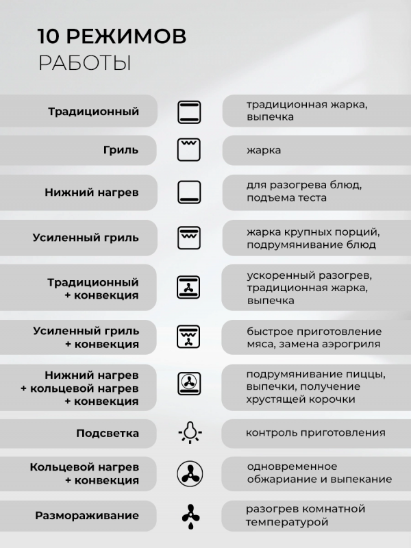 Режимы духовки: Верхний и нижний нагрев с конвекцией, Гриль, Нижний нагрев, Подсветка, Размораживание, Традиционный, Турбо гриль, Турбо гриль с конвекцией, Кольцевой нагрев с конвекцией, Кольцевой нагрев с конвекцией и нижним нагревом