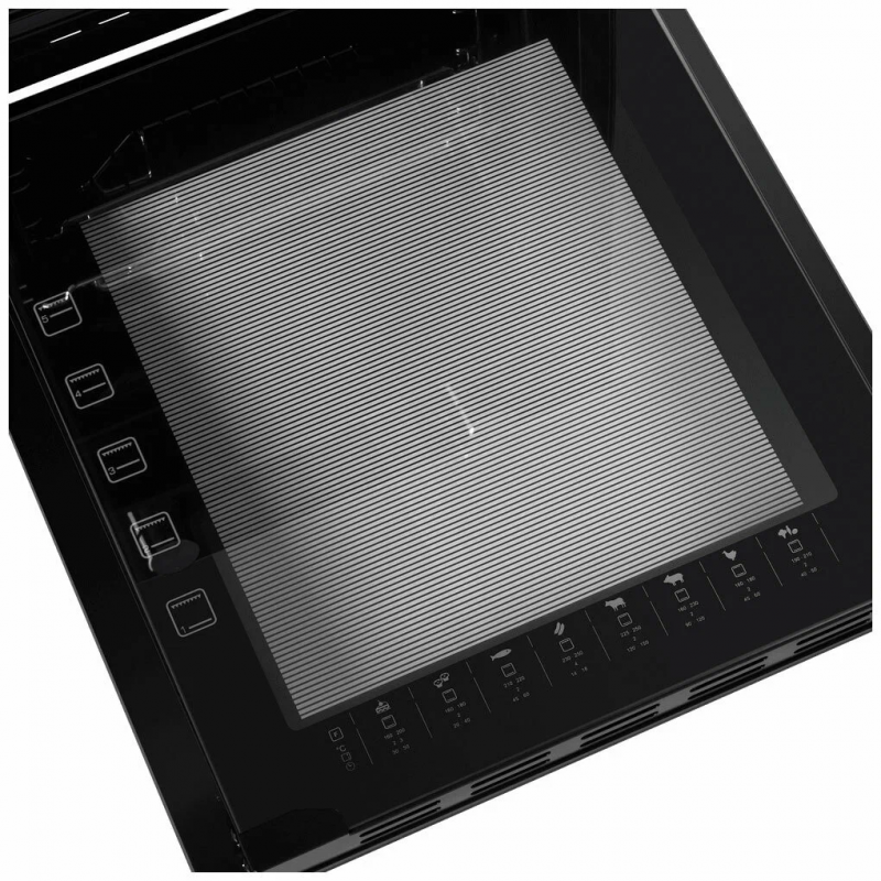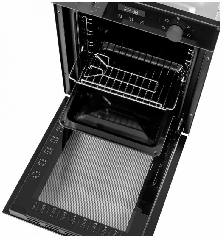 Комбинированное управление реализовано с помощью сенсорного дисплея и цельнометаллических ручек PUSH PULL. Можно установить таймер, выбрать температуру (50°-250°C) и один из 7-ми режимов работы: внутреннее освещение, традиционный нагрев, большой гриль, конвекция с нижним нагревом, нижний нагрев, конвекционный нагрев, малый гриль.