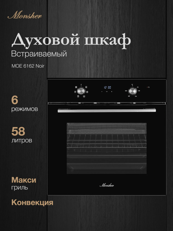 Электрический духовой шкаф Monsher MOE 6162 Noir (Модификация 2025 года) - встраиваемое решение для кухни.Оборудован электрической системой нагрева, обеспечивает равномерное приготовление блюд.Модель имеет стильный дизайн в черном цвете, который подчеркнет современный интерьер вашей кухни.С помощью этого духового шкафа вы сможете приготовить широкий спектр блюд - от выпечки до запеканок.Удобное управление позволяет легко выбирать нужный режим приготовления и контролировать процесс.Интегрированный таймер поможет следить за временем приготовления и избежать пересушивания блюд.Monsher MOE 6162 Noir - отличный выбор для тех, кто ценит качество и функциональность в каждой детали своей кухонной техники.